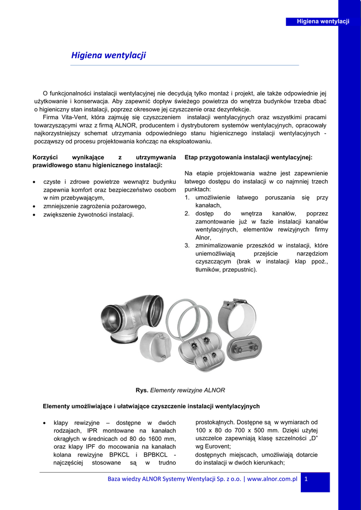 Higiena wentylacji Higiena wentylacji O funkcjonalności instalacji wentylacyjnej nie decydują tylko montaż i projekt, ale także odpowiednie jej użytkowanie i konserwacja. Aby zapewnić dopływ świeżego powietrza do wnętrza budynków trzeba dbać o higieniczny stan instalacji, poprzez okresowe jej czyszczenie oraz dezynfekcje. Firma Vita-Vent, która zajmuję się czyszczeniem instalacji wentylacyjnych oraz wszystkimi pracami towarzyszącymi wraz z firmą ALNOR, producentem i dystrybutorem systemów wentylacyjnych, opracowały najkorzystniejszy schemat utrzymania odpowiedniego stanu higienicznego instalacji wentylacyjnych począwszy od procesu projektowania kończąc na eksploatowaniu. Korzyści wynikające z utrzymywania prawidłowego stanu higienicznego instalacji: • • • czyste i zdrowe powietrze wewnątrz budynku zapewnia komfort oraz bezpieczeństwo osobom w nim przebywającym, zmniejszenie zagrożenia pożarowego, zwiększenie żywotności instalacji. Etap przygotowania instalacji wentylacyjnej: Na etapie projektowania ważne jest zapewnienie łatwego dostępu do instalacji w co najmniej trzech punktach: 1. umożliwienie łatwego poruszania się przy kanałach, 2. dostęp do wnętrza kanałów, poprzez zamontowanie już w fazie instalacji kanałów wentylacyjnych, elementów rewizyjnych firmy Alnor, 3. zminimalizowanie przeszkód w instalacji, które uniemożliwiają przejście narzędziom czyszczącym (brak w instalacji klap ppoż., tłumików, przepustnic). Rys. Elementy rewizyjne ALNOR Elementy umożliwiające i ułatwiające czyszczenie instalacji wentylacyjnych • klapy rewizyjne – dostępne w dwóch rodzajach, IPR montowane na kanałach okrągłych w średnicach od 80 do 1600 mm, oraz klapy IPF do mocowania na kanałach kolana rewizyjne BPKCL i BPBKCL najczęściej stosowane są w trudno prostokątnych. Dostępne są w wymiarach od 100 x 80 do 700 x 500 mm. Dzięki użytej uszczelce zapewniają klasę szczelności „D” wg Eurovent; dostępnych miejscach, umożliwiają dotarcie do instalacji w dwóch kierunkach; Baza wiedzy ALNOR Systemy Wentylacji Sp. z o.o. | www.alnor.com.pl 1 Higiena wentylacji • • • zaślepki z rączką – umożliwiają zaślepienie• kolan rewizyjnych oraz trójników; przepustnice umożliwiające czyszczenie w wersji soczewkowej GBL, która dodatkowo umożliwia płynną regulację oraz możliwość pomiaru przepływu powietrza w instalacji. Dostępne są także przepustnice gilotynowe • GK lub GKL; nawiewniki NCD-S - których główny panel może być zdejmowany i ponownie zakładany już po zamontowaniu. Daje to możliwość czyszczenia zarówno puszki rozprężnej jak i końcówek instalacji; TRANS®System – jest kompletem kanałów i kształtek okrągłych, łączonych kołnierzowo. Dzięki specjalnej konstrukcji, każdy z zamontowanych elementów może być odłączony bez konieczności nawet najdrobniejszej ingerencji w pozostałą część orurowania. Rys. Klapy rewizyjne IPQ i IPR firmy ALNOR Zasady montażu elementów rewizyjnych • • Elementy rewizyjne powinny być instalowane co 20 metrów na odcinkach kanałów, w których nie znajduje się żadna przeszkoda (przepustnica, klapa pożarowa, tłumik), w przeciwnym wypadku klapa musi być zamontowana przed oraz za takim elementem. Wymiar klapy powinien być co najmniej o połowę mniejszy niż wymiar kanału. Do kanału 400x200 mm należy zamontować klapę 300x200 na ściance o szerokości 400 mm. • Właściwy dobór klap oraz ich montaż w fazie instalowania kanałów wentylacyjnych, pozwalają na ograniczenie kosztów i usprawnienie dalszych prac przy systemie. Dodatkową korzyścią, wynikającą z zakładania klap rewizyjnych już w fazie montażu instalacji, jest sprawniejsze oraz szybsze wykonanie okresowego czyszczenia. Baza wiedzy ALNOR Systemy Wentylacji Sp. z o.o. | www.alnor.com.pl 2 Higiena wentylacji Rys. Przykład zamontowania klapy rewizyjnej IPR Czyszczenie oraz dezynfekcja instalacji wentylacyjnej Usuwanie zanieczyszczeń oraz szkodliwych substancji z instalacji wentylacyjnej, powinno być przeprowadzanie co dwa lata bądź częściej, w zależności od zanieczyszczeń znajdujących się w instalacji. Etapy czyszczenia instalacji wentylacyjnej : • ustalenie terminu prac, • zabezpieczenie maszyn, urządzeń, mebli znajdujących się w pomieszczeniach, • zdemontowanie klap rewizyjnych, • wykonanie badań mikrobiologicznych, • regulacja instalacji, • • wykonanie inspekcji kanałów specjalistycznym robotem, odizolowanie kanałów podlegających procesowi czyszczenia balonami, czyszczenie kanałów wentylacyjnych poprzez ich szczotkowanie oraz „odsysanie” zanieczyszczeń, dezynfekcja instalacji środkami zalecanymi przez PZH poprzez zamgławianie, wykonanie inspekcji kanałów po czyszczeniu, • sporządzenie dokumentacji powykonawczej. • • • Rys. Kanały wentylacyjne przed oraz po czyszczeniu Przepisy związane z koniecznością czyszczenia instalacji wentylacyjnych Baza wiedzy ALNOR Systemy Wentylacji Sp. z o.o. | www.alnor.com.pl 3 Higiena wentylacji Rozporządzenie Ministra Spraw Wewnętrznych i Administracji z dn. 16.08.1999 w sprawie warunków technicznych użytkowania budynków mieszkalnych (Dz.U. 74/99) określa warunki techniczne użytkowania budynków mieszkalnych, wraz ze związanymi z nimi instalacjami i urządzeniami technicznymi § 13.1. Warunki i sposób użytkowania urządzeń technicznych i instalacji oraz wyroby użyte do ich napraw i konserwacji nie mogą powodować pogorszenia właściwości użytkowych czynnika dostarczanego za pomocą tych urządzeń i instalacji. § 22.1. Instalacje i urządzenia wentylacyjne powinny w okresie ich użytkowania zapewniać możliwość skutecznej wymiany powietrza w pomieszczeniach zgodnie z warunkami założonymi w projekcie. § 22.2. Instalacje i urządzenia wentylacyjne, w okresie ich użytkowania powinny być utrzymywane w stanie technicznym zapewniającym sprawno