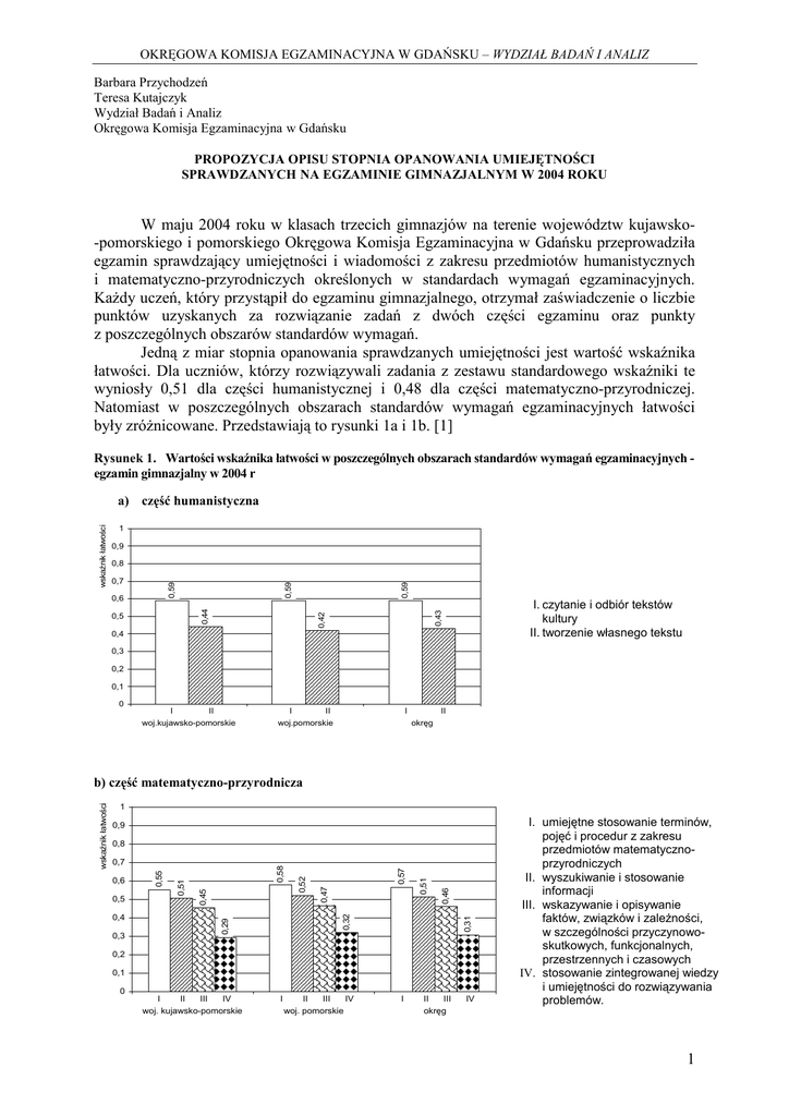 OKRĘGOWA KOMISJA EGZAMINACYJNA W GDAŃSKU – WYDZIAŁ BADAŃ I ANALIZ Barbara Przychodzeń Teresa Kutajczyk Wydział Badań i Analiz Okręgowa Komisja Egzaminacyjna w Gdańsku PROPOZYCJA OPISU STOPNIA OPANOWANIA UMIEJĘTNOŚCI SPRAWDZANYCH NA EGZAMINIE GIMNAZJALNYM W 2004 ROKU W maju 2004 roku w klasach trzecich gimnazjów na terenie województw kujawsko-pomorskiego i pomorskiego Okręgowa Komisja Egzaminacyjna w Gdańsku przeprowadziła egzamin sprawdzający umiejętności i wiadomości z zakresu przedmiotów humanistycznych i matematyczno-przyrodniczych określonych w standardach wymagań egzaminacyjnych. KaŜdy uczeń, który przystąpił do egzaminu gimnazjalnego, otrzymał zaświadczenie o liczbie punktów uzyskanych za rozwiązanie zadań z dwóch części egzaminu oraz punkty z poszczególnych obszarów standardów wymagań. Jedną z miar stopnia opanowania sprawdzanych umiejętności jest wartość wskaźnika łatwości. Dla uczniów, którzy rozwiązywali zadania z zestawu standardowego wskaźniki te wyniosły 0,51 dla części humanistycznej i 0,48 dla części matematyczno-przyrodniczej. Natomiast w poszczególnych obszarach standardów wymagań egzaminacyjnych łatwości były zróŜnicowane. Przedstawiają to rysunki 1a i 1b. [1] Rysunek 1. Wartości wskaźnika łatwości w poszczególnych obszarach standardów wymagań egzaminacyjnych egzamin gimnazjalny w 2004 r 1 0,9 I. czytanie i odbiór tekstów kultury II. tworzenie własnego tekstu 0,43 0,5 0,42 0,44 0,6 0,59 0,7 0,59 0,8 0,59 wskaźnik łatwości a) część humanistyczna 0,4 0,3 0,2 0,1 0 I II I woj.kujawsko-pomorskie II I woj.pomorskie II okręg 1 0,9 0,3 0,46 0,31 0,32 0,51 0,57 0,58 0,29 0,4 0,47 0,5 0,45 0,6 0,51 0,7 0,52 0,8 0,55 wskaźnik łatwości b) część matematyczno-przyrodnicza 0,2 0,1 0 I II III IV woj. kujawsko-pomorskie I II III woj. pomorskie IV I II III IV I. umiejętne stosowanie terminów, pojęć i procedur z zakresu przedmiotów matematycznoprzyrodniczych II. wyszukiwanie i stosowanie informacji III. wskazywanie i opisywanie faktów, związków i zaleŜności, w szczególności przyczynowoskutkowych, funkcjonalnych, przestrzennych i czasowych IV. stosowanie zintegrowanej wiedzy i umiejętności do rozwiązywania problemów. okręg 1 OKRĘGOWA KOMISJA EGZAMINACYJNA W GDAŃSKU – WYDZIAŁ BADAŃ I ANALIZ Surowy wynik ucznia nie daje jednoznacznej informacji o poziomie jego osiągnięć na tle innych zdających. Natomiast umoŜliwia to wynik znormalizowany, wyraŜony w dziewięciostopniowej skali staninowej. Takie przedstawienie wyniku pozwala na interpretację opisującą stopień opanowania umiejętności badanych danym zestawem zadań. W celu określenia wyników uczniów w staninach, wyniki punktowe wszystkich uczniów w okręgu porządkuje się rosnąco, a następnie grupuje w dziewięć przedziałów. W tabelach 1a i 1b przedstawiono przedziały punktowe odpowiadające poszczególnym staninom dla kaŜdej części egzaminu gimnazjalnego w 2004 roku [1]. Tabela 1. Wyniki uczniów w skali staninowej - egzamin gimnazjalny w 2004 roku a) część humanistyczna Stanin Przedział punktowy Procent uczniów Opis dydaktyczny wyniku 1 2 3 4 5 6 7 8 9 0-9 10 - 13 14 - 17 18 - 22 23 - 27 28 - 32 33 - 36 37 - 40 41 - 50 3,3% 6,8% 10,8% 17,3% 19,1% 18,6% 12,3% 7,8% 4,0% najniŜszy bardzo niski niski niŜej średni średni wyŜej średni wysoki bardzo wysoki najwyŜszy b) część matematyczno-przyrodnicza Stanin 1 2 3 4 5 6 7 8 9 Przedział punktowy Procent uczniów 0-7 8 - 10 11 - 14 15 - 19 20 - 26 27 - 34 35 - 40 41 - 45 46 - 50 3,6% 7,5% 13,2% 16,5% 20,3% 17,7% 10,6% 7,4% 3,2% Opis dydaktyczny wyniku najniŜszy bardzo niski niski niŜej średni średni wyŜej średni wysoki bardzo wysoki najwyŜszy Jaki jest stopień opanowania umiejętności z poszczególnych standardów wymagań egzaminacyjnych w zaleŜności od wyniku ucznia w skali staninowej? Aby to ustalić, dla kaŜdej z dziewięciu wyróŜnionych grup uczniów o tych samych wynikach w staninach, oddzielnie obliczono (dla obu części egzaminu) wskaźnik łatwość badanych umiejętności w obszarach standardów wymagań egzaminacyjnych. Na rysunkach 2a i 2b przedstawiono łącznie sześć krzywych (tzw. krzywych charakterystycznych sprawdzanych umiejętności i wiadomości w obszarach standardów wymagań egzaminacyjnych). KaŜda krzywa łączy dziewięć punktów ilustrujących łatwość danego obszaru standardu wymagań dla grupy uczniów, których wynik wyraŜony jest w staninach. 2 OKRĘGOWA KOMISJA EGZAMINACYJNA W GDAŃSKU – WYDZIAŁ BADAŃ I ANALIZ Rysunek 2. Krzywe charakterystyczne sprawdzanych umiejętności i wiadomości w obszarach standardów wymagań egzaminacyjnych - egzamin gimnazjalny w 2004 roku wskaźnik łatwości a) część humanistyczna 1 0,9 0,8 0,7 0,6 0,5 0,4 0,3 0,2 0,1 0 1 2 3 4 5 6 czytanie i odbiór tekstów kultury 7 8 9 staniny tworzenie własnego tekstu wskaźnik łatwości b) część matematyczno-przyrodnicza 1 0,9 0,8 0,7 0,6 0,5 0,4 0,3 0,2 0,1 0 1 2 3 4 5 6 7 8 9 staniny umiejetne stosowanie terminów, pojęć i procedur z zakresu przedmiotów matematyczno-przyrodniczych wyszukiwanie i stosowanie informacji wskazywanie i opisywanie faktów, związków i zaleŜności stosowanie zintegrowanej wiedzy i umiejętności do rozwiązywania problemów • • Z przebiegu powyŜszych krzywych zauwaŜamy, Ŝe: łatwość wszystkich sprawdzanych umiejętności i wiadomości uczniów rośnie wraz z przesuwaniem się ich wyników punktowych do wyŜszych staninów w części humanistycznej dla wszystkich uczniów, niezaleŜnie od ich wyników w staninach, łatwiejsze okazały się zadania sprawdzające umiejętności i wiadomości z obszaru czytanie i odbiór tekstów kultury niŜ z obszaru tworzenie własnego tekstu 3 OKRĘGOWA KOMISJA EGZAMINACYJNA W GDAŃSKU – WYDZIAŁ BADAŃ I ANALIZ • w części matematyczno-przyrodniczej dla uczniów o wynikach od stanina 1. do stanina 8. łatwiejsze okazały się zadania