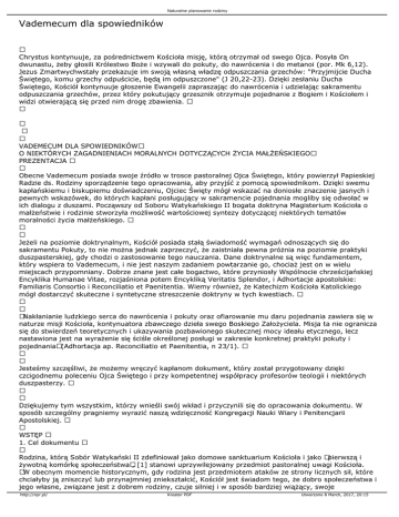Naturalne planowanie rodziny Vademecum dla spowiedników Chrystus kontynuuje, za pośrednictwem Kościoła misję, którą otrzymał od swego Ojca. Posyła On dwunastu, żeby głosili Królestwo Boże i wzywali do pokuty, do nawrócenia i do metanoi (por. Mk 6,12). Jezus Zmartwychwstały przekazuje im swoją własną władzę odpuszczania grzechów: "Przyjmijcie Ducha Świętego, komu grzechy odpuścicie, będą im odpuszczone" (J 20,22-23). Dzięki zesłaniu Ducha Świętego, Kościół kontynuuje głoszenie Ewangelii zapraszając do nawrócenia i udzielając sakramentu odpuszczania grzechów, przez który pokutujący grzesznik otrzymuje pojednanie z Bogiem i Kościołem i widzi otwierającą się przed nim drogę zbawienia. VADEMECUM DLA SPOWIEDNIKÓW O NIEKTÓRYCH ZAGADNIENIACH MORALNYCH DOTYCZĄCYCH ŻYCIA MAŁŻEŃSKIEGO PREZENTACJA Obecne Vademecum posiada swoje źródło w trosce pastoralnej Ojca Świętego, który powierzył Papieskiej Radzie ds. Rodziny sporządzenie tego opracowania, aby przyjść z pomocą spowiednikom. Dzięki swemu kapłańskiemu i biskupiemu doświadczeniu, Ojciec Święty mógł wskazać na doniosłe znaczenie jasnych i pewnych wskazówek, do których kapłani posługujący w sakramencie pojednania mogliby się odwołać w ich dialogu z duszami. Począwszy od Soboru Watykańskiego II bogata doktryna Magisterium Kościoła o małżeństwie i rodzinie stworzyła możliwość wartościowej syntezy dotyczącej niektórych tematów moralności życia małżeńskiego. Jeżeli na poziomie doktrynalnym, Kościół posiada stałą świadomość wymagań odnoszących się do sakramentu Pokuty, to nie można jednak zaprzeczyć, że zaistniała pewna próżnia na poziomie praktyki duszpasterskiej, gdy chodzi o zastosowanie tego nauczania. Dane doktrynalne są więc fundamentem, który wspiera to Vademecum, i nie jest naszym zadaniem powtarzanie go, chociaż jest on w wielu miejscach przypomniany. Dobrze znane jest całe bogactwo, które przyniosły Wspólnocie chrześcijańskiej Encyklika Humanae Vitae, rozjaśniona potem Encykliką Veritatis Splendor, i Adhortacje apostolskie: Familiaris Consortio i Reconciliatio et Paenitentia. Wiemy również, że Katechizm Kościoła Katolickiego mógł dostarczyć skuteczne i syntetyczne streszczenie doktryny w tych kwestiach. «Nakłanianie ludzkiego serca do nawrócenia i pokuty oraz ofiarowanie mu daru pojednania zawiera się w naturze misji Kościoła, kontynuatora zbawczego dzieła swego Boskiego Założyciela. Misja ta nie ogranicza się do stwierdzeń teoretycznych i ukazywania pozbawionego skutecznej mocy ideału etycznego, lecz nastawiona jest na wyrażenie się ściśle określonej posługi w zakresie konkretnej praktyki pokuty i pojednania» (Adhortacja ap. Reconciliatio et Paenitentia, n 23/1). Jesteśmy szczęśliwi, że możemy wręczyć kapłanom dokument, który został przygotowany dzięki czcigodnemu poleceniu Ojca Świętego i przy kompetentnej współpracy profesorów teologii i niektórych duszpasterzy. Dziękujemy tym wszystkim, którzy wnieśli swój wkład i przyczynili się do opracowania dokumentu. W sposób szczególny pragniemy wyrazić naszą wdzięczność Kongregacji Nauki Wiary i Penitencjarii Apostolskiej. WSTĘP 1. Cel dokumentu Rodzina, którą Sobór Watykański II zdefiniował jako domowe sanktuarium Kościoła i jako «pierwszą i żywotną komórkę społeczeństwa», [1] stanowi uprzywilejowany przedmiot pastoralnej uwagi Kościoła. «W obecnym momencie historycznym, gdy rodzina jest przedmiotem ataków ze strony licznych sił, które chciałyby ją zniszczyć lub przynajmniej zniekształcić, Kościół jest świadom tego, że dobro społeczeństwa i jego własne, związane jest z dobrem rodziny, czuje silniej i w sposób bardziej wiążący, swoje http://npr.pl/ Kreator PDF Utworzono 8 March, 2017, 20:15 Naturalne planowanie rodziny posłannictwo głoszenia wszystkim zamysłu Bożego dotyczącego małżeństwa i rodziny». [2] W ostatnich latach, poprzez nauczanie Ojca Świętego i poprzez szeroką mobilizację duchową pasterzy i świeckich, Kościół pomnożył swoją troskę, by wspomagać cały lud wierny w rozważaniu z wdzięcznością i pełnią wiary tych darów, których Bóg udziela mężczyźnie i kobiecie zjednoczonym w sakramencie małżeństwa, aby mogli rzeczywiście podążać do świętości i dawać prawdziwe świadectwo ewangeliczne w konkretnych sytuacjach, w których przychodzi im żyć. Na drodze ku świętości małżeńskiej i rodzinnej podstawową rolę pełnią sakramenty Eucharystii i Pokuty. Pierwszy umacnia jedność z Chrystusem, źródłem łaski i życia, drugi odbudowuje, ilekroć uległaby zniszczeniu, lub pomnaża i doskonali małżeńską i rodzinną komunię [3], zagrożoną i zranioną przez grzech. Podstawowym warunkiem, by małżonkowie mogli poznać swoją drogę do świętości i spełnić swoją misję, jest formacja ich sumienia i pełnienie woli Bożej w specyficznym obszarze życia małżeńskiego, to jest w przeżywaniu ich małżeńskiej komunii i w służbie życiu. Światło Ewangelii i łaska sakramentu stanowią niezbędne elementy dla uszlachetnienia i osiągnięcia pełni miłości małżeńskiej, która posiada swoje źródło w Bogu Stworzycielu. W istocie, «tę miłość Pan nasz zechciał szczególnym darem swej łaski i miłości uzdrowić, udoskonalić i wywyższyć». [4] W przyjmowaniu tych wymogów autentycznej miłości i planu Bożego w codziennym życiu małżonków, moment, w którym oni proszą o sakrament Pojednania i otrzymują go, przedstawia wydarzenie zbawcze o najwyższej doniosłości, sposobność do pogłębiającego oświecenia wiary i właściwą pomoc do spełniania planu Bożego we własnym życiu. «Drogę zaś do tego spotkania i zjednoczenia toruje każdemu - nawet wówczas, gdy ciążą na nim wielkie winy - sakrament Pokuty i Pojednania. W sakramencie tym każdy człowiek może w sposób szczególny d