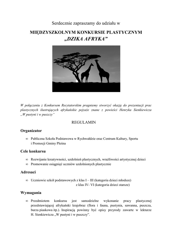 Serdecznie zapraszamy do udziału w MIĘDZYSZKOLNYM KONKURSIE PLASTYCZNYM „DZIKA AFRYKA” W połączeniu z Konkursem Recytatorskim pragniemy stworzyć okazję do prezentacji prac plastycznych ilustrujących afrykańskie pejzaże znane z powieści Henryka Sienkiewicza „W pustyni i w puszczy” REGULAMIN Organizator • Publiczna Szkoła Podstawowa w Rychwałdzie oraz Centrum Kultury, Sportu i Promocji Gminy Pleśna Cele konkursu • • Rozwijanie kreatywności, uzdolnień plastycznych, wrażliwości artystycznej dzieci Promowanie osiągnięć uczniów uzdolnionych plastycznie Adresaci • Uczniowie szkół podstawowych z klas I – III (kategoria dzieci młodsze) z klas IV- VI (kategoria dzieci starsze) Wymagania • Przedmiotem konkursu jest samodzielne wykonanie pracy plastycznej przedstawiającej afrykański krajobraz (flora i fauna, pustynia, sawanna, puszcza, burza piaskowa itp.). Inspiracją powinny być opisy przyrody zawarte w lekturze H. Sienkiewicza „W pustyni i w puszczy”. • • Praca ma być wykonana w formacie nie większym niż A3 w dowolnej technice plastycznej z wykluczeniem materiałów sypkich (może być przestrzenna). Każdy z uczniów może przekazać tylko jedną pracę, którą powinien opisać tytułem oraz swoimi danymi: imię i nazwisko, klasa, szkoła, imię i nazwisko opiekuna. Warunki uczestnictwa • Pracę należy złożyć: w sekretariacie Publicznej Szkoły Podstawowej w Rychwałdzie przesłać na adres: Publiczna Szkoła Podstawowa w Rychwałdzie, Rychwałd 120, 32-171 Pleśna (z dopiskiem konkurs plastyczny). Terminy konkursu • do 3 czerwca 2016 r. nadsyłanie prac • 7 czerwca 2016 roku o godz.9.00 w Publicznej Szkole Podstawowej w Rychwałdzie podczas Międzyszkolnego Konkursu Recytatorskiego – nagrodzenie laureatów oraz prezentacja uczniowskich prac. Ocena jury i nagrody • • • Powołane przez organizatora jury oceni pracę biorąc pod uwagę następujące kryteria: zgodność z tematyką, oryginalność, pomysłowość, samodzielność, walory estetyczne: kompozycja, gama kolorów, technika wykonania W dwóch kategoriach wiekowych zostaną przyznane nagrody oraz wyróżnienia. Decyzje jury są ostateczne. Postanowienia końcowe • • • • • Zgłoszenie uczestnictwa w konkursie jest jednoznaczne z akceptacją powyższego regulaminu. Zgłaszający wyraża zgodę na rejestrację fotograficzną i wideo przez organizatora oraz publikację i emisję w dowolnych mediach, a także wykorzystanie danych osobowych w materiałach dotyczących konkursu. Organizator zastrzega sobie prawo do publikacji i prezentacji prac biorących udział w konkursie. Organizatorzy nie zwracają nadesłanych na konkurs prac oraz kosztów przesyłki Prace niezgodne z Regulaminem lub oddane po terminie nie będą oceniane.