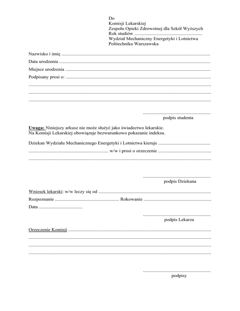 Do Komisji Lekarskiej Zespołu Opieki Zdrowotnej dla Szkół Wyższych Rok studiów ........................................................ Wydział Mechaniczny Energetyki i Lotnictwa Politechnika Warszawska Nazwisko i imię ........................................................................................................................... Data urodzenia ............................................................................................................................. Miejsce urodzenia ........................................................................................................................ Podpisany prosi o: ........................................................................................................................ ....................................................................................................................................................... ....................................................................................................................................................... ....................................................................................................................................................... ........................................................ podpis studenta Uwaga: Niniejszy arkusz nie może służyć jako świadectwo lekarskie. Na Komisji Lekarskiej obowiązuje bezwarunkowo pokazanie indeksu. Dziekan Wydziału Mechanicznego Energetyki i Lotnictwa kieruje ........................................... .................................................................. w/w i prosi o orzeczenie ............................................ ....................................................................................................................................................... ........................................................ podpis Dziekana Wniosek lekarski: w/w leczy się od ............................................................................................. Rozpoznanie ..................................................... Rokowanie ........................................................ Data .................................... ........................................................ podpis Lekarza Orzeczenie Komisji ...................................................................................................................... ....................................................................................................................................................... ....................................................................................................................................................... ....................................................................................................................................................... ........................................................ podpisy
