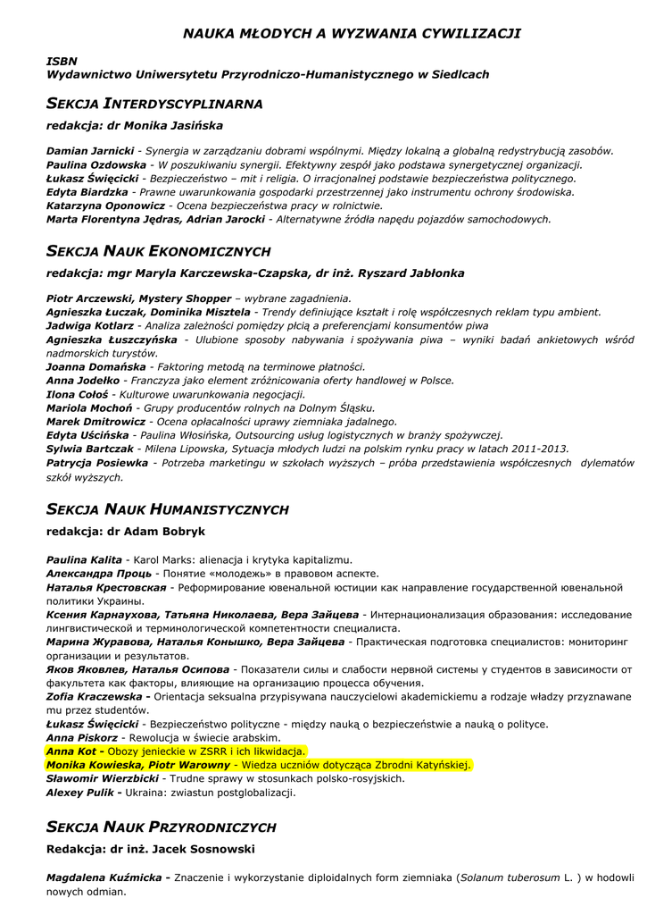 NAUKA MŁODYCH A WYZWANIA CYWILIZACJI ISBN Wydawnictwo Uniwersytetu Przyrodniczo-Humanistycznego w Siedlcach SEKCJA INTERDYSCYPLINARNA redakcja: dr Monika Jasińska Damian Jarnicki - Synergia w zarządzaniu dobrami wspólnymi. Między lokalną a globalną redystrybucją zasobów. Paulina Ozdowska - W poszukiwaniu synergii. Efektywny zespół jako podstawa synergetycznej organizacji. Łukasz Święcicki - Bezpieczeństwo – mit i religia. O irracjonalnej podstawie bezpieczeństwa politycznego. Edyta Biardzka - Prawne uwarunkowania gospodarki przestrzennej jako instrumentu ochrony środowiska. Katarzyna Oponowicz - Ocena bezpieczeństwa pracy w rolnictwie. Marta Florentyna Jędras, Adrian Jarocki - Alternatywne źródła napędu pojazdów samochodowych. SEKCJA NAUK EKONOMICZNYCH redakcja: mgr Maryla Karczewska-Czapska, dr inż. Ryszard Jabłonka Piotr Arczewski, Mystery Shopper – wybrane zagadnienia. Agnieszka Łuczak, Dominika Misztela - Trendy definiujące kształt i rolę współczesnych reklam typu ambient. Jadwiga Kotlarz - Analiza zależności pomiędzy płcią a preferencjami konsumentów piwa Agnieszka Łuszczyńska - Ulubione sposoby nabywania i spożywania piwa – wyniki badań ankietowych wśród nadmorskich turystów. Joanna Domańska - Faktoring metodą na terminowe płatności. Anna Jodełko - Franczyza jako element zróżnicowania oferty handlowej w Polsce. Ilona Cołoś - Kulturowe uwarunkowania negocjacji. Mariola Mochoń - Grupy producentów rolnych na Dolnym Śląsku. Marek Dmitrowicz - Ocena opłacalności uprawy ziemniaka jadalnego. Edyta Uścińska - Paulina Włosińska, Outsourcing usług logistycznych w branży spożywczej. Sylwia Bartczak - Milena Lipowska, Sytuacja młodych ludzi na polskim rynku pracy w latach 2011-2013. Patrycja Posiewka - Potrzeba marketingu w szkołach wyższych – próba przedstawienia współczesnych dylematów szkół wyższych. SEKCJA NAUK HUMANISTYCZNYCH redakcja: dr Adam Bobryk Paulina Kalita - Karol Marks: alienacja i krytyka kapitalizmu. Александра Проць - Понятие «молодежь» в правовом аспекте. Наталья Крестовская - Реформирование ювенальной юстиции как направление государственной ювенальной политики Украины. Ксения Карнаухова, Татьяна Николаева, Вера Зайцева - Интернационализация образования: исследование лингвистической и терминологической компетентности специалиста. Марина Журавова, Наталья Конышко, Вера Зайцева - Практическая подготовка специалистов: мониторинг организации и результатов. Яков Яковлев, Наталья Осипова - Показатели силы и слабости нервной системы у студентов в зависимости от факультета как факторы, влияющие на организацию процесса обучения. Zofia Kraczewska - Orientacja seksualna przypisywana nauczycielowi akademickiemu a rodzaje władzy przyznawane mu przez studentów. Łukasz Święcicki - Bezpieczeństwo polityczne - między nauką o bezpieczeństwie a nauką o polityce. Anna Piskorz - Rewolucja w świecie arabskim. Anna Kot - Obozy jenieckie w ZSRR i ich likwidacja. Monika Kowieska, Piotr Warowny - Wiedza uczniów dotycząca Zbrodni Katyńskiej. Sławomir Wierzbicki - Trudne sprawy w stosunkach polsko-rosyjskich. Alexey Pulik - Ukraina: zwiastun postglobalizacji. SEKCJA NAUK PRZYRODNICZYCH Redakcja: dr inż. Jacek Sosnowski Magdalena Kuźmicka - Znaczenie i wykorzystanie diploidalnych form ziemniaka (Solanum tuberosum L. ) w hodowli nowych odmian. Elżbieta Karatysz - Analiza wypadków w rolnictwie na przykładzie Placówki Terenowej KRUS w Białej Podlaskiej. Mikołaj Jaczyński, Mariola Jaworska, Barbara Kozak – Wybrane urządzenia do zagospodarowania wód opadowych w miejscu ich zebrania jako alternatywa dla opłaty za ich odprowadzanie. Mariola Jaworska, Mikołaj Jaczyński, Barbara Kozak - Jakość wód deszczowych oraz wybrane metody ich oczyszczania. Magdalena Czubaszek, Małgorzata Szostek, Weronika Szostek - Szybka ocena integralności DNA w plemnikach. Małgorzata Szostek, Magdalena Czubaszek, Weronika Szostek - Zastosowanie azotanu srebra w ocenie parametrów seminologicznych nasienia ogiera. Anna Ladzińska - Porównanie wydajności eksploatacyjnej dwóch zestawów ciągnik-kosiarka o różnej szerokości roboczej w technologii koszenia łąk. Agnieszka Popkowska, Klaudia Krupa - Ocena wpływu kierunku studiów na styl życia studentów. Dorota Dziubak - Tereny zieleni Siedlec w świetle klasyfikacji OTZ. Magdalena Anna Lipińska - Przestrzeń niepełnosprawności – jest czy jej nie ma? Anna Krasuska - Możliwości rozwoju agroturystyki w gminie Zbuczyn. Sylwia Kurowska - Walory gminy Mordy zachęcające do jej odwiedzenia. Magdalena Oleksiak, Magdalena Niećko, Olga Prusek - Analiza jakości kaw rozpuszczalnych, liofilizowanych, dostępnych na polskim rynku. Magdalena Niećko, Magdalena Oleksiak, Olga Prusek – Porównanie jakości czekolad sprzedawanych pod marką własną i w sklepie dyskontowym, wyprodukowanych przez jednego producenta. Kamil Porowski - Charakterystyka ras bydła mięsnego. Kamil Porowski- Charakterystyka ras bydła mlecznego. Katarzyna Popijantus -Wybrane wskaźniki fizyczno-chemiczne wód podziemnych na terenie gminy Drelów (woj. lubelskie). Monika Dymecka - Optymalizacja procesu wytwarzania substancji przeciwgrzybicznych przez szczepy z rodzaju Streptomyces. Bartłomiej Grygorcewicz - Wpływ nadtlenku wodoru na indukcję fagów lambdoidalnych niosących geny stx – próba określenia ich wzajemnej interakcji oraz aktywności względe