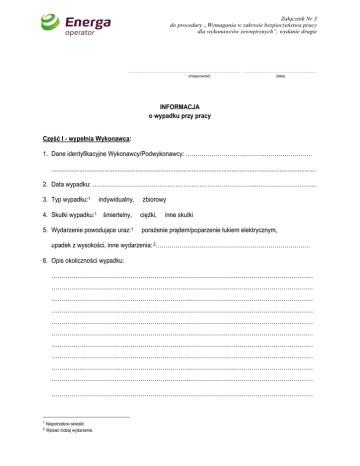 Załącznik Nr 3 do procedury „Wymagania w zakresie bezpieczeństwa pracy dla wykonawców zewnętrznych”, wydanie drugie ……………………………………………………………………………………………………………………….. ……………………………………………………………........................ (miejscowość) (data) INFORMACJA o wypadku przy pracy Część I - wypełnia Wykonawca: 1. Dane identyfikacyjne Wykonawcy/Podwykonawcy: ………………………………….…………………… ................................................................................................................................................................ 2. Data wypadku: ………………………………………………………………………..……………………….... 3. Typ wypadku:1 indywidualny, zbiorowy 4. Skutki wypadku:1 śmiertelny, ciężki, inne skutki 5. Wydarzenie powodujące uraz:1 porażenie prądem/poparzenie łukiem elektrycznym, upadek z wysokości, inne wydarzenia: 2…………………………………………………………………… 6. Opis okoliczności wypadku: …………………………………………………………………………………………………………………… …………………………………………………………………………………………………………………… …………………………………………………………………………………………………………………… …………………………………………………………………………………………………………………… …………………………………………………………………………………………………………………… …………………………………………………………………………………………………………………… …………………………………………………………………………………………………………………… …………………………………………………………………………………………………………………… …………………………………………………………………………………………………………………… …………………………………………………………………………………………………………………… …………………………………………………………………………………………………………………… 1 2 Niepotrzebne skreślić. Wpisać rodzaj wydarzenia. Załącznik Nr 3 do procedury „Wymagania w zakresie bezpieczeństwa pracy dla wykonawców zewnętrznych, wydanie drugie 7. Ustalone przyczyny wypadku: …………………………………………………………………………………………………………………… …………………………………………………………………………………………………………………… …………………………………………………………………………………………………………………… …………………………………………………………………………………………………………………… 8. Podjęte działania profilaktyczne: …………………………………………………………………………………………………………………… …………………………………………………………………………………………………………………… …………………………………………………………………………………………………………………… …………………………………………………………………………………………………………………… ……………………………….…………………… (podpis przedstawiciela wykonawcy) Część II - wypełnia ENERGA-OPERATOR SA: 1. Dodatkowe ustalenia i informacje Wydziału BHP i PPOŻ: …………………………………………………………………………………………………………………… …………………………………………………………………………………………………………………… …………………………………………………………………………………………………………………… …………………………………………………………………………………………………………………… …………………………………………………………………………………………………………………… 2. Decyzja Wydziału BHP i PPOŻ, czy okoliczności i przyczyny wypadku wskazują na konieczność przeprowadzenia weryfikacji 1 tak, nie 3. Uzasadnienie decyzji (tylko w przypadku wyboru „tak” w pkt 2): …………………………………………………………………………………………………………………… …………………………………………………………………………………………………………………… …………………………………………………………………………………………………………………… …………………………………………………………………………………………………………………… ………………….….………………… (podpis kierownika Wydziału BHP i PPOŻ) ………………….….………………………………………………………………………………………………………..…… (akceptacja weryfikacji przez Dyrektora Generalnego Oddziału) 2/2