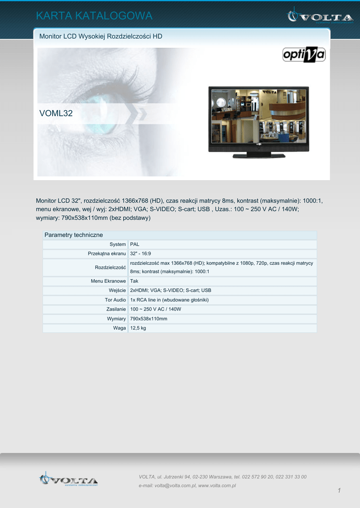 KARTA KATALOGOWA Monitor LCD Wysokiej Rozdzielczości HD VOML32 Monitor LCD 32", rozdzielczość 1366x768 (HD), czas reakcji matrycy 8ms, kontrast (maksymalnie): 1000:1, menu ekranowe, wej / wyj: 2xHDMI; VGA; S-VIDEO; S-cart; USB , Uzas.: 100 ~ 250 V AC / 140W; wymiary: 790x538x110mm (bez podstawy) Parametry techniczne System PAL Przekątna ekranu 32" - 16:9 Rozdzielczość rozdzielczość max 1366x768 (HD); kompatybilne z 1080p, 720p, czas reakcji matrycy 8ms; kontrast (maksymalnie): 1000:1 Menu Ekranowe Tak Wejście 2xHDMI; VGA; S-VIDEO; S-cart; USB Tor Audio 1x RCA line in (wbudowane głośniki) Zasilanie 100 ~ 250 V AC / 140W Wymiary 790x538x110mm Waga 12,5 kg VOLTA, ul. Jutrzenki 94, 02-230 Warszawa, tel. 022 572 90 20, 022 331 33 00 e-mail: [email protected], www.volta.com.pl 1