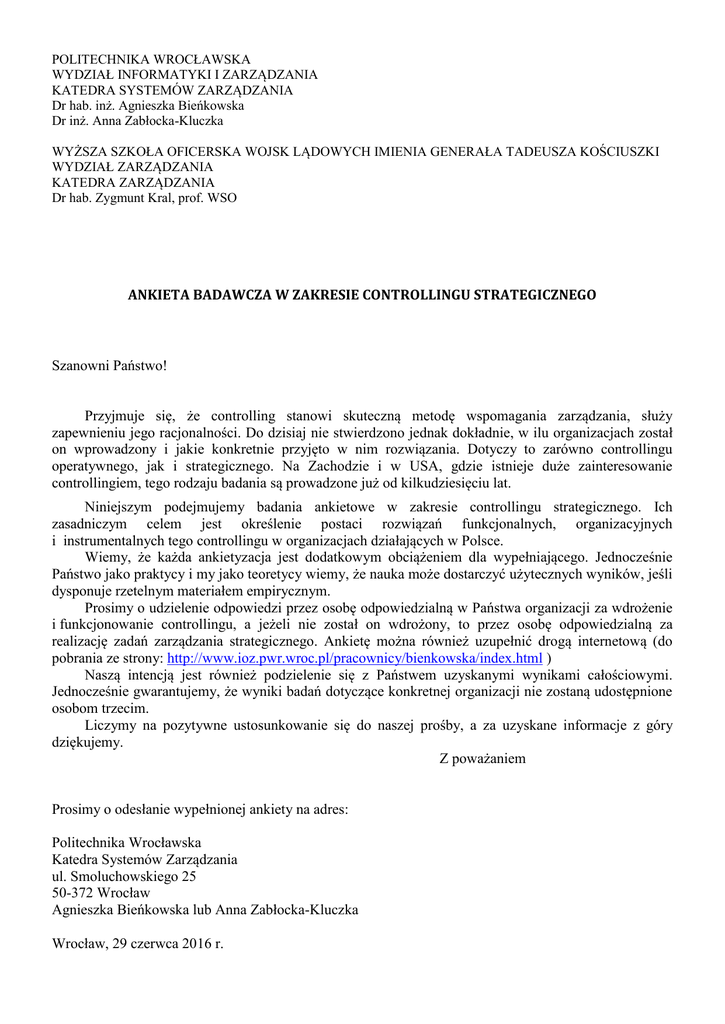 POLITECHNIKA WROCŁAWSKA WYDZIAŁ INFORMATYKI I ZARZĄDZANIA KATEDRA SYSTEMÓW ZARZĄDZANIA Dr hab. inż. Agnieszka Bieńkowska Dr inż. Anna Zabłocka-Kluczka WYŻSZA SZKOŁA OFICERSKA WOJSK LĄDOWYCH IMIENIA GENERAŁA TADEUSZA KOŚCIUSZKI WYDZIAŁ ZARZĄDZANIA KATEDRA ZARZĄDZANIA Dr hab. Zygmunt Kral, prof. WSO ANKIETA BADAWCZA W ZAKRESIE CONTROLLINGU STRATEGICZNEGO Szanowni Państwo! Przyjmuje się, że controlling stanowi skuteczną metodę wspomagania zarządzania, służy zapewnieniu jego racjonalności. Do dzisiaj nie stwierdzono jednak dokładnie, w ilu organizacjach został on wprowadzony i jakie konkretnie przyjęto w nim rozwiązania. Dotyczy to zarówno controllingu operatywnego, jak i strategicznego. Na Zachodzie i w USA, gdzie istnieje duże zainteresowanie controllingiem, tego rodzaju badania są prowadzone już od kilkudziesięciu lat. Niniejszym podejmujemy badania ankietowe w zakresie controllingu strategicznego. Ich zasadniczym celem jest określenie postaci rozwiązań funkcjonalnych, organizacyjnych i instrumentalnych tego controllingu w organizacjach działających w Polsce. Wiemy, że każda ankietyzacja jest dodatkowym obciążeniem dla wypełniającego. Jednocześnie Państwo jako praktycy i my jako teoretycy wiemy, że nauka może dostarczyć użytecznych wyników, jeśli dysponuje rzetelnym materiałem empirycznym. Prosimy o udzielenie odpowiedzi przez osobę odpowiedzialną w Państwa organizacji za wdrożenie i funkcjonowanie controllingu, a jeżeli nie został on wdrożony, to przez osobę odpowiedzialną za realizację zadań zarządzania strategicznego. Ankietę można również uzupełnić drogą internetową (do pobrania ze strony: http://www.ioz.pwr.wroc.pl/pracownicy/bienkowska/index.html ) Naszą intencją jest również podzielenie się z Państwem uzyskanymi wynikami całościowymi. Jednocześnie gwarantujemy, że wyniki badań dotyczące konkretnej organizacji nie zostaną udostępnione osobom trzecim. Liczymy na pozytywne ustosunkowanie się do naszej prośby, a za uzyskane informacje z góry dziękujemy. Z poważaniem Prosimy o odesłanie wypełnionej ankiety na adres: Politechnika Wrocławska Katedra Systemów Zarządzania ul. Smoluchowskiego 25 50-372 Wrocław Agnieszka Bieńkowska lub Anna Zabłocka-Kluczka Wrocław, 29 czerwca 2016 r. ANKIETA BADAWCZA W ZAKRESIE CONTROLLINGU STRATEGICZNEGO Proszę zaznaczyć wybrane odpowiedzi w kratkach za pomocą znaku X. CZĘŚĆ I. ROZWIĄZANIA FUNKCJONALNE CONTROLLINGU STRATEGICZNEGO Czy w Państwa organizacji realizuje się zadania zarządzania strategicznego? tak Proszę przejść do pytania 2 nie Proszę przejść do pytania 22 2. Czy w Państwa organizacji funkcjonuje controlling? tak Proszę przejść do pytania 3 nie Proszę przejść do pytania 22 3. Czy częścią składową controllingu w Państwa organizacji jest controlling strategiczny? tak Proszę przejść do pytania 5 nie Proszę przejść do pytania 4 4. W jakim stopniu następujące czynniki są przyczynami braku wyróżnienia controllingu strategicznego w Państwa organizacji? Nie miały Miały Miały Miały Miały wpływu znikomy średni duży decydujący wpływ wpływ wpływ wpływ - właściwa realizacja zadań zarządzania strategicznego - brak trudności koordynacyjnych - niechęć kierownictwa - niechęć załogi - dobra kondycja finansowa i długotrwała efektywność funkcjonowania - inne czynniki, jakie? …………………………………………….. Proszę przejść do pytania 22. 1. W jakim stopniu następujące czynniki stanowiły przesłanki wyróżnienia controllingu strategicznego w Państwa organizacji? Nie miały Miały Miały Miały Miały wpływu znikomy średni duży decydujący wpływ wpływ wpływ wpływ - zwiększenie sprawności zarządzania strategicznego - trudności koordynacyjne - niedostatki systemu informacyjno-decyzyjnego na użytek zarządzania strategicznego - niezbędność stosowania nowoczesnych instrumentów na użytek podejmowania decyzji strategicznych - niedostateczna efektywność funkcjonowania organizacji - niedostateczna konkurencyjność organizacji - inne czynniki, jakie? …………………………………………….. 5. 6. W Państwa organizacji controllerzy realizują następujące ogólnie ujęte zadania zarządzania strategicznego: Proszę wskazać jedną odpowiedź związaną z dominującym rodzajem zadań. stosowania instrumentów poszerzonej rachunkowości finansowej (wykraczającej poza ustawę o rachunkowości) na użytek zarządzania strategicznego informacyjnego wspomagania zarządzania strategicznego (podejmowania decyzji strategicznych), przez wyodrębnioną w strukturze organizacyjnej rachunkowość zarządczą koordynacji zarządzania strategicznego, bez możliwości podejmowania decyzji przez specjalistów ds. controllingu rozwiązywania merytorycznych problemów zarządzania strategicznego z odpowiedzialnością w tym względzie i możliwością podejmowania decyzji strategicznych przez specjalistów ds. controllingu inną koncepcję controllingu, jaką? …………………………………………………………………………………………………………… 7. Jakiego rodzaju stanowiska służbowe w Państwa organizacji (kierownik/menedżer – w strukturze zarządzania/ zarządzania strategicznego, lub/i controller – w strukturze controllingu) uczestniczą w realizacji następujących zadań planowania strategicznego i kontroli strategicznej? Można wskazać dowolna liczbę odpowiedzi i zaznaczyć jedno lub dwa stanowiska służbowe przy danym zadaniu. Brak zaznaczenia jakiegokolwiek stanowiska przy danym zadaniu oznacza jego nierealizowanie. Zadania Kierownik/ menedżer Controller analiza strategiczna otoczenia analiza strategiczna potencjału organizacji analiza sytuacyjna – określanie pozycji strategicznej organizacji (np. analiza SWOT, analiza porównawcza konkurencji) określanie wizji i misji organizacji formułowanie celów str