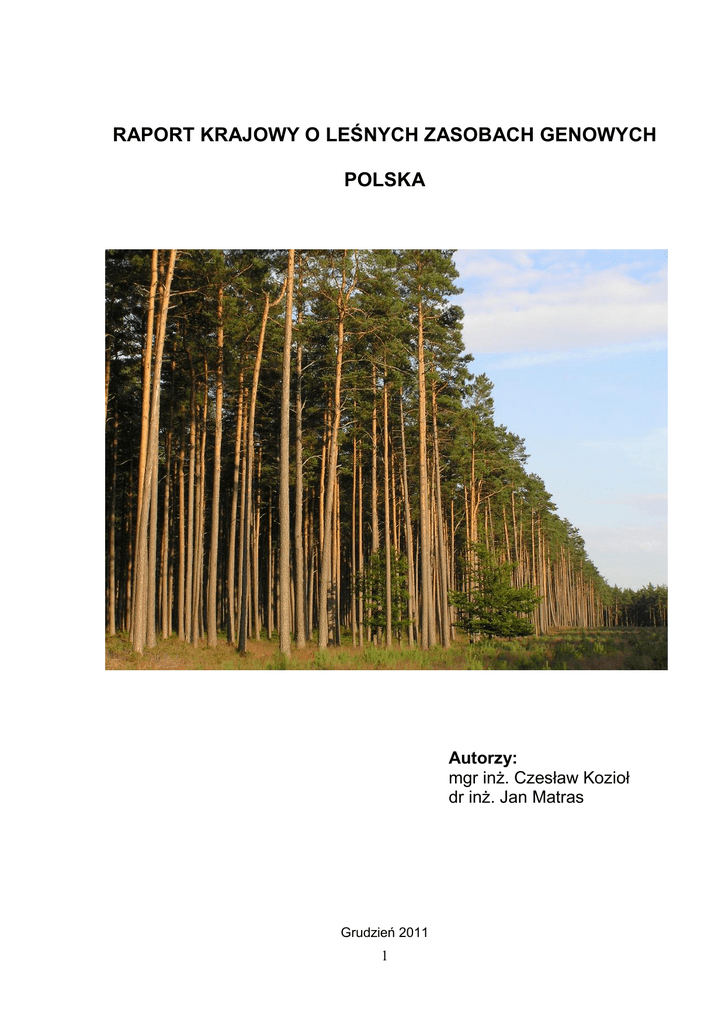 RAPORT KRAJOWY O LEŚNYCH ZASOBACH GENOWYCH POLSKA Autorzy: mgr inż. Czesław Kozioł dr inż. Jan Matras Grudzień 2011 1 Spis treści DZIAŁ I: STRESZCZENIE......................................................................................................... 9 DZIAŁ II WPROWADZENIE DO CHARAKTERYSTYKI KRAJU I SEKTORA LEŚNEGO ........ 11 1. Położenie i warunki klimatyczne ........................................................................................ 11 2. Sektor leśny w Polsce ........................................................................................................ 13 2.1.Zmiany powierzchni leśnej w Polsce ......................................................................... 15 2.2. Struktura siedlisk ...................................................................................................... 18 2.3. Struktura wiekowa lasów Polski................................................................................ 21 2.4. Plantacje drzew szybko rosnących i uprawy monokulturowe .................................... 22 2.5. Leśny materiał rozmnożeniowy ................................................................................ 23 2.6. Zatrudnienie w sektorze leśnym ............................................................................... 23 2.7. Znaczenie lasów, produktów leśnych oraz usług na rynku wewnętrznym i zewnętrznym ................................................................................................................... 24 2.8. Organizacja sektora leśnego .................................................................................... 26 2.9. Lasy prywatne .......................................................................................................... 27 2.10. Rola leśnych zasobów genowych w realizacji bieżących oczekiwań na leśne produkty i usługi w Polsce ............................................................................................... 29 2.10.1. Funkcje lasów ..................................................................................................... 29 2.11. Przekształcenia w sektorze leśnym i czynniki determinujące te zmiany .................. 32 2.12. Przewidywane kierunki działań w sposobie prowadzeniu gospodarki leśnej w nadchodzącym dziesięcioleciu ........................................................................................ 34 2.13. Ograniczenia w prowadzeniu zrównoważonej gospodarki leśnej, w tym produkcyjności lasu ......................................................................................................... 34 2.14. Rola, jaką odegrają leśne zasoby genowe w najbliższym dziesięcioleciu w Polsce w odniesieniu do produktów leśnictwa i usług leśnych................................................... 36 DZIAŁ III: CZĘŚC GŁÓWNA RAPORTU................................................................................. 37 Rozdział 1: Stan bieżący leśnych zasobów genowych ............................................................ 37 1. Zróżnicowanie wewnątrz i międzygatunkowe drzew leśnych ........................................... 37 1.1. Zmienność podstawowych gatunków drzew leśnych oszacowana na podstawie badań molekularnych ............................................................................................................ 38 1.2. Zróżnicowanie genetyczne populacji drzew leśnych w Polsce ...................................... 44 1.2.1. Populacyjna i rodowa zmienność cech hodowlanych podstawowych gatunków drzew leśnych ................................................................................................................. 45 2. Znaczenie leśnych zasobów genowych ............................................................................. 61 2.1. Zasoby drzewne Polski i gatunki drzew leśnych o największym znaczeniu gospodarczym ........................................................................................................................ 61 2 2.2. Rodzaj produkcji drzewnej i jej znaczenie ...................................................................... 63 2.3. Gatunki introdukowane w lasach .................................................................................... 65 2.4. Gatunki drzew będące w uprawie o znaczeniu środowiskotwórczym oraz gatunki chronione i zagrożone ............................................................................................................ 66 2.5. Znaczenie ekonomiczne, środowiskowe i społeczne gatunków drzew leśnych i produktów drzewnych ............................................................................................................. 68 2.6. Regionalizacja nasienna ................................................................................................. 68 2.7. Działania priorytetowe dla gospodarki leśnej ................................................................. 70 2.7.1. Przebudowa drzewostanów ................................................................................... 70 2.7.2. Restytucja jodły pospolitej (Abies alba Mill.) w Sudetach ....................................... 71 2.7.3. Program ochrony i restytucji cisa pospolitego (Taxus baccata L.) w Polsce.......... 73 2.7.4. Restytucja jarzębu brekinii Sorbus torminalis (L.) Crantz ....................................... 77 3. Czynniki wpływające na stan leśnych zasobów genowych w Polsce ............................... 77 3.1. Zagrożenia abiotyczne .................................................................................................... 78 3.2. Zagrożenia biotyczne ...................................................................................................... 81 3.2.1. Zagrożenia lasów przez owady ............................................................................. 81 3.2.2. Zagrożenie lasów przez grzybowe choroby infekcyjne ........................................