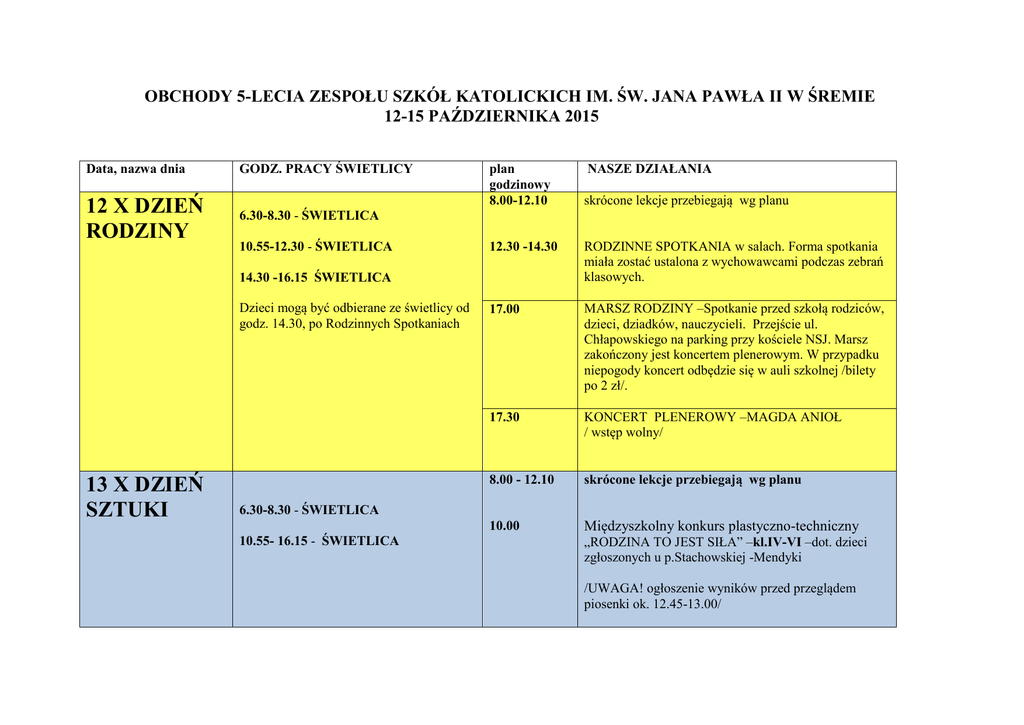 OBCHODY 5-LECIA ZESPOŁU SZKÓŁ KATOLICKICH IM. ŚW. JANA PAWŁA II W ŚREMIE 12-15 PAŹDZIERNIKA 2015 Data, nazwa dnia GODZ. PRACY ŚWIETLICY 12 X DZIEŃ RODZINY 6.30-8.30 - ŚWIETLICA 10.55-12.30 - ŚWIETLICA plan godzinowy 8.00-12.10 13 X DZIEŃ SZTUKI skrócone lekcje przebiegają wg planu 12.30 -14.30 RODZINNE SPOTKANIA w salach. Forma spotkania miała zostać ustalona z wychowawcami podczas zebrań klasowych. 17.00 MARSZ RODZINY –Spotkanie przed szkołą rodziców, dzieci, dziadków, nauczycieli. Przejście ul. Chłapowskiego na parking przy kościele NSJ. Marsz zakończony jest koncertem plenerowym. W przypadku niepogody koncert odbędzie się w auli szkolnej /bilety po 2 zł/. 17.30 KONCERT PLENEROWY –MAGDA ANIOŁ / wstęp wolny/ 8.00 - 12.10 skrócone lekcje przebiegają wg planu 10.00 Międzyszkolny konkurs plastyczno-techniczny 14.30 -16.15 ŚWIETLICA Dzieci mogą być odbierane ze świetlicy od godz. 14.30, po Rodzinnych Spotkaniach NASZE DZIAŁANIA 6.30-8.30 - ŚWIETLICA 10.55- 16.15 - ŚWIETLICA „RODZINA TO JEST SIŁA” –kl.IV-VI –dot. dzieci zgłoszonych u p.Stachowskiej -Mendyki /UWAGA! ogłoszenie wyników przed przeglądem piosenki ok. 12.45-13.00/ 12.45 PRZEGLĄD PIOSENKI –mini-„Sacrosong” /stare piosenki oazowe, religijne/ dot. dzieci zgłoszonych i zapisanych u p. J.Kulińskiej 14 X DZIEŃ SPORTU I TURYSTYKI wszystkie lekcje odwołane 13.00 Wspólna praca plastyczna uczniów I-III -wykonanie logo szkoły / w salach lekcyjnych razem z wychowawcami, finał w holu/. Po zajęciach dzieci idą do świetlicy. 16.00 FESTIWAL PIĘCIU ZMYSŁÓW zajęcia z grupą architektów, wykonanie elementów przestrzeni przyjaznej dla osób niepełnosprawnych –dot. kl. IID SP 19.00 SPEKTAKL TEATRALNY „ŚLUBY PANIEŃSKIE” – aula szkolna /bilety w cenie 2 zł będą rozprowadzane w recepcji szkoły i w sekretariacie/ 8.15 /ok. 30 minut/ APEL z okazji Święta Edukacji Narodowej –klasy zbierają się w auli szkolnej 6.30-8.00 - ŚWIETLICA po zakończeniu gry miejskiejświetlica czynna do 16.15 9.00 /możliwość odbioru dziecka po obiedzie I-III i IV-VI ok. 13.00/ GRA MIEJSKA – wyjście poza szkołę na wyznaczone trasy gry miejskiej /ok.2 godz./. Powrót do szkoły na obiad. Świetlica. 15 X DZIEŃ NADANIA SZTANDARU 9.00 GIMNAZ. RAJD ROWEROWY Serdeczna Osada . Tam zostanie odprawiona msza św. Potem rozgrywki sportowe, ognisko. 10.00 KALO SPŁYW KAJAKOWY ze Śremu do Jaszkowa. Msza św. Grill/ognisko, turniej gry w bule, zajęcia sportoworekreacyjne 11.00 MSZA ŚW. W KOŚCIELE NSJ DLA WSZYSTKICH UCZNIÓW, NAUCZYCIELI, PRACOWNIKÓW SZKOŁY, RODZICÓW. 12.30 Po mszy św. uroczyste przejście ze sztandarem ul. Chłapowskiego do szkoły –wszyscy n-le i uczniowie SP, G, LO wszystkie lekcje odwołane 6.30 -10.00 OPIEKA ŚWIETLICA I-VI INF. do rodziców - świetlica czynna tylko do godz. 10 rano. Po tej godzinie dzieci ze świetlicy przejdą do kościoła na mszę św. Świetlica czynna po uroczystościach do godz. 16.15, ale jest możliwość wcześniejszego zabrania dziecka do domu Spotkanie w Auli Szkolnej –uroczystości cd poczet sztandarowy, poświęcenie figury św. Rodziny, prezentacja przedstawiająca powstanie i 5 lat z życia szkoły. Spektakl teatralny poświęcony postaci Patrona szkoły „Droga do świętości” SPEKTAKL „DROGA DO ŚWIĘTOŚCI” BĘDZIE JESZCZE WYSTAWIANY DLA RODZICÓW I MIESZKAŃCÓW ŚREMU 21 i 22 X –o godz. 19.00 ZAPRASZAMY! /bilety w cenie 2 zł będą rozprowadzane w recepcji szkoły i w sekretariacie/ 16 X DZIEŃ WOLNY /za 14 X/ Świetlica czynna 6.30-16.15 /prosimy zgłaszać w świetlicy, czy dziecko w tym dniu przyjdzie do szkoły/ --------------- -------------------------