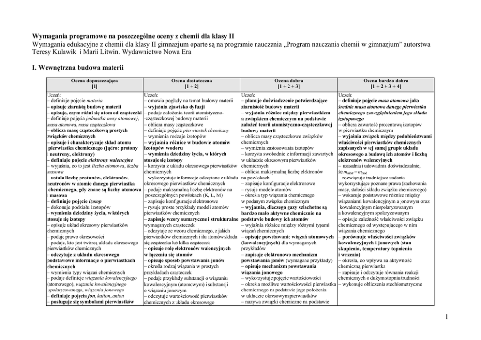 Wymagania programowe na poszczególne oceny z chemii dla klasy II Wymagania edukacyjne z chemii dla klasy II gimnazjum oparte są na programie nauczania „Program nauczania chemii w gimnazjum” autorstwa Teresy Kulawik i Marii Litwin. Wydawnictwo Nowa Era I. Wewnętrzna budowa materii Ocena dopuszczająca [1] Ocena dostateczna [1 + 2] Ocena dobra [1 + 2 + 3] Ocena bardzo dobra [1 + 2 + 3 + 4] Uczeń: – definiuje pojęcie materia – opisuje ziarnistą budowę materii – opisuje, czym róŜni się atom od cząsteczki – definiuje pojęcia jednostka masy atomowej, masa atomowa, masa cząsteczkowa – oblicza masę cząsteczkową prostych związków chemicznych – opisuje i charakteryzuje skład atomu pierwiastka chemicznego (jądro: protony i neutrony, elektrony) – definiuje pojęcie elektrony walencyjne – wyjaśnia, co to jest liczba atomowa, liczba masowa – ustala liczbę protonów, elektronów, neutronów w atomie danego pierwiastka chemicznego, gdy znane są liczby atomowa i masowa – definiuje pojęcie izotop – dokonuje podziału izotopów – wymienia dziedziny Ŝycia, w których stosuje się izotopy – opisuje układ okresowy pierwiastków chemicznych – podaje prawo okresowości – podaje, kto jest twórcą układu okresowego pierwiastków chemicznych – odczytuje z układu okresowego podstawowe informacje o pierwiastkach chemicznych – wymienia typy wiązań chemicznych – podaje definicje wiązania kowalencyjnego (atomowego), wiązania kowalencyjnego spolaryzowanego, wiązania jonowego – definiuje pojęcia jon, kation, anion – posługuje się symbolami pierwiastków Uczeń: – omawia poglądy na temat budowy materii – wyjaśnia zjawisko dyfuzji – podaje załoŜenia teorii atomistyczno-cząsteczkowej budowy materii – oblicza masy cząsteczkowe – definiuje pojęcie pierwiastek chemiczny – wymienia rodzaje izotopów – wyjaśnia róŜnice w budowie atomów izotopów wodoru – wymienia dziedziny Ŝycia, w których stosuje się izotopy – korzysta z układu okresowego pierwiastków chemicznych – wykorzystuje informacje odczytane z układu okresowego pierwiastków chemicznych – podaje maksymalną liczbę elektronów na poszczególnych powłokach (K, L, M) – zapisuje konfiguracje elektronowe – rysuje proste przykłady modeli atomów pierwiastków chemicznych – zapisuje wzory sumaryczne i strukturalne wymaganych cząsteczek – odczytuje ze wzoru chemicznego, z jakich pierwiastków chemicznych i ilu atomów składa się cząsteczka lub kilka cząsteczek – opisuje rolę elektronów walencyjnych w łączeniu się atomów – opisuje sposób powstawania jonów – określa rodzaj wiązania w prostych przykładach cząsteczek − podaje przykłady substancji o wiązaniu kowalencyjnym (atomowym) i substancji o wiązaniu jonowym – odczytuje wartościowość pierwiastków chemicznych z układu okresowego Uczeń: – planuje doświadczenie potwierdzające ziarnistość budowy materii – wyjaśnia róŜnice między pierwiastkiem a związkiem chemicznym na podstawie załoŜeń teorii atomistyczno-cząsteczkowej budowy materii – oblicza masy cząsteczkowe związków chemicznych – wymienia zastosowania izotopów – korzysta swobodnie z informacji zawartych w układzie okresowym pierwiastków chemicznych – oblicza maksymalną liczbę elektronów na powłokach – zapisuje konfiguracje elektronowe – rysuje modele atomów – określa typ wiązania chemicznego w podanym związku chemicznym – wyjaśnia, dlaczego gazy szlachetne są bardzo mało aktywne chemicznie na podstawie budowy ich atomów – wyjaśnia róŜnice między róŜnymi typami wiązań chemicznych – opisuje powstawanie wiązań atomowych (kowalencyjnych) dla wymaganych przykładów – zapisuje elektronowo mechanizm powstawania jonów (wymagane przykłady) – opisuje mechanizm powstawania wiązania jonowego – wykorzystuje pojęcie wartościowości – określa moŜliwe wartościowości pierwiastka chemicznego na podstawie jego połoŜenia w układzie okresowym pierwiastków – nazywa związki chemiczne na podstawie Uczeń: – definiuje pojęcie masa atomowa jako średnia masa atomowa danego pierwiastka chemicznego z uwzględnieniem jego składu izotopowego – oblicza zawartość procentową izotopów w pierwiastku chemicznym – wyjaśnia związek między podobieństwami właściwości pierwiastków chemicznych zapisanych w tej samej grupie układu okresowego a budową ich atomów i liczbą elektronów walencyjnych – uzasadnia i udowadnia doświadczalnie, Ŝe msubstr = mprod – rozwiązuje trudniejsze zadania wykorzystujące poznane prawa (zachowania masy, stałości składu związku chemicznego) – wskazuje podstawowe róŜnice między wiązaniami kowalencyjnym a jonowym oraz kowalencyjnym niespolaryzowanym a kowalencyjnym spolaryzowanym – opisuje zaleŜność właściwości związku chemicznego od występującego w nim wiązania chemicznego – porównuje właściwości związków kowalencyjnych i jonowych (stan skupienia, temperatury topnienia i wrzenia) – określa, co wpływa na aktywność chemiczną pierwiastka – zapisuje i odczytuje równania reakcji chemicznych o duŜym stopniu trudności – wykonuje obliczenia stechiometryczne 1 chemicznych – odróŜnia wzór sumaryczny od wzoru strukturalnego – zapisuje wzory sumaryczne i strukturalne cząsteczek – definiuje pojęcie wartościowość – podaje wartościowość pierwiastków chemicznych w stanie wolnym – odczytuje z układu okresowego maksymalną wartościowość pierwiastków chemicznych grup 1., 2. i 13.− −17. – wyznacza wartościowość pierwiastków chemicznych na podstawie wzorów sumarycznych – zapisuje wzory sumaryczny i strukturalny cząsteczki związku dwupierwiastkowego na podstawie wartościowości pierwiastków chemicznych – określa na podstawie wzoru liczbę pierwiastków w związku chemicznym – interpretuje zapisy (odczytuje ilościowo i jakościowo proste zap