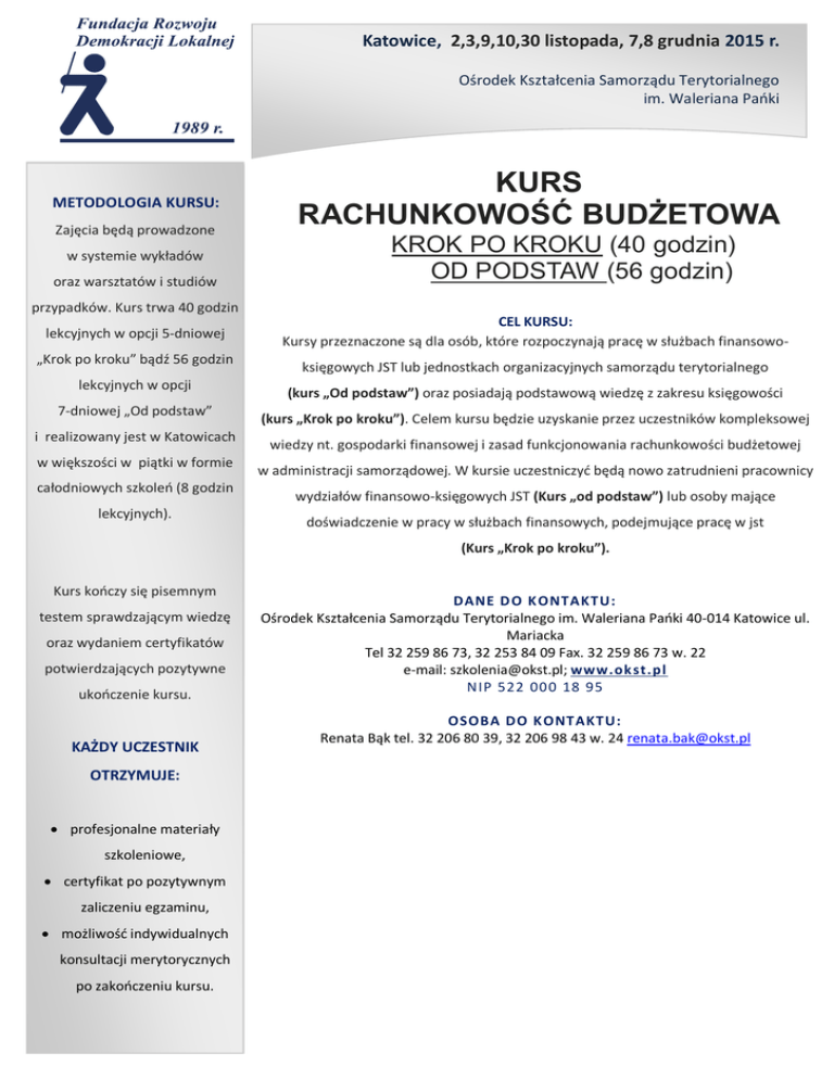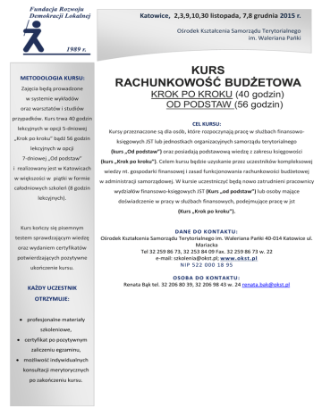 Katowice, 2,3,9,10,30 listopada, 7,8 grudnia 2015 r. Rozwiązania informatyczne Ośrodek Kształcenia Samorządu Terytorialnego im. Waleriana Pańki METODOLOGIA KURSU: Zajęcia będą prowadzone w systemie wykładów oraz warsztatów i studiów KURS RACHUNKOWOŚĆ BUDŻETOWA KROK PO KROKU (40 godzin) OD PODSTAW (56 godzin) przypadków. Kurs trwa 40 godzin lekcyjnych w opcji 5-dniowej „Krok po kroku” bądź 56 godzin lekcyjnych w opcji 7-dniowej „Od podstaw” i realizowany jest w Katowicach w większości w piątki w formie całodniowych szkoleń (8 godzin lekcyjnych). CEL KURSU: Kursy przeznaczone są dla osób, które rozpoczynają pracę w służbach finansowoksięgowych JST lub jednostkach organizacyjnych samorządu terytorialnego (kurs „Od podstaw”) oraz posiadają podstawową wiedzę z zakresu księgowości (kurs „Krok po kroku”). Celem kursu będzie uzyskanie przez uczestników kompleksowej wiedzy nt. gospodarki finansowej i zasad funkcjonowania rachunkowości budżetowej w administracji samorządowej. W kursie uczestniczyć będą nowo zatrudnieni pracownicy wydziałów finansowo-księgowych JST (Kurs „od podstaw”) lub osoby mające doświadczenie w pracy w służbach finansowych, podejmujące pracę w jst (Kurs „Krok po kroku”). Kurs kończy się pisemnym testem sprawdzającym wiedzę oraz wydaniem certyfikatów potwierdzających pozytywne ukończenie kursu. KAŻDY UCZESTNIK OTRZYMUJE: profesjonalne materiały szkoleniowe, certyfikat po pozytywnym zaliczeniu egzaminu, możliwość indywidualnych konsultacji merytorycznych po zakończeniu kursu. DANE D O K ONTAKTU: Ośrodek Kształcenia Samorządu Terytorialnego im. Waleriana Pańki 40-014 Katowice ul. Mariacka Tel 32 259 86 73, 32 253 84 09 Fax. 32 259 86 73 w. 22 e-mail: [email protected]; www.ok st.pl NIP 522 00 0 18 95 OSOBA DO K ONTAKTU: Renata Bąk tel. 32 206 80 39, 32 206 98 43 w. 24 [email protected] Lp. I dzień II dzień Zagadnienia podstawowe „Od podstaw” „Od podstaw” III dzień I dzień „Od podstaw” „Krok po kroku” IV dzień II dzień „ Od podstaw” „Krok po kroku” V dzień III dzień „Od podstaw” „Krok po kroku” VI dzień IV dzień „Od podstaw” „Krok po kroku” VII dzień V dzień „ Od podstaw” „Krok po kroku” Zagadnienia szczegółowe 1. Pojęcie i zadania rachunkowości na podstawie zapisów ustawy o rachunkowości. 2. Zmiany w stanie aktywów i pasywów i ich dokumentowanie. 3. Ogólna charakterystyka kont księgowych budowa konta, zasady ewidencji, korekty. 4. Zasady działania kont bilansowych i pozabilansowych - różnice. 1. Konta kosztów, przychodów, zasady ich działania. 2. Salda końcowe i ich wpływ na wynik finansowy oraz dane wykazywane w bilansie. 3. Syntetyka i analityka dzielenie i łączenie kont. 4. Przykład ewidencji na kontach księgowych. Moduł I. Charakterystyka zasad gospodarki finansowej jednostek budżetowych: 1. Jednostki budżetowe rodzaje jednostek, zasady ich funkcjonowania i finansowania. 2. Wykonywanie budżetu jednostki samorządu terytorialnego podstawy planu finansowego, upoważnienia. Moduł II. Przepisy prawne regulujące zasady rachunkowości budżetowej: 1. Omówienie podstawowych aktów prawnych regulujących rachunkowość jednostek budżetowych. 2. Zasady rachunkowości możliwości indywidualnych zapisów w poszczególnych jednostkach w oparciu o ustawę o finansach publicznych. 3. Obowiązki kierownika jednostki i innych pracowników w zakresie rachunkowości zgodnie z ustawą o rachunkowości oraz ustawą o finansach publicznych. 4. Klasyfikacja budżetowa (jej praktyczne zastosowanie w ewidencji księgowej). 5. Zasady (polityka) rachunkowości zapisy niezbędne oraz wymagane minimum zgodnie z ustawą o rachunkowości oraz dokumentacja dodatkowa (uzupełniająca). Moduł I. Ewidencja księgowa w budżecie i jednostce samorządu terytorialnego: 1. Zasady funkcjonowania kont księgi głównej budżetu i jednostki. 2. Plan kont jednostki budżetowej budowa, zasady tworzenia, zmiany. 3. Księgi rachunkowe i księgi pomocnicze w jednostce. 4. Dokumentowanie operacji gospodarczych, kontrola i dekretacja dokumentów księgowych. Moduł II. Środki pieniężne, rozrachunki, rozliczenia: 1. Dokumentacja obrotu pieniężnego - podstawowe dokumenty kasowe. 2. Instrukcja kasowa i jej podstawowe zapisy. 3. Ewidencja księgowa środków pieniężnych - konta księgowe, przykłady operacji księgowych (konta zespołu 1). 4. Pojęcie rozrachunków i rozliczeń zgodnie z ustawą o rachunkowości. Moduł I. Ewidencja księgowa rozrachunków i rozliczeń: 1. Ewidencja rozrachunków: z dostawcami, odbiorcami, publicznoprawne, z pracownikami, z budżetem przykłady operacji księgowych (konta zespołu 2) 2. Pozostałe rozrachunki. Moduł II. Klasyfikacja, ewidencja dochodów , wydatków, kosztów: 1. Dochody, wydatki budżetu jst - definicje z ustawy o finansach przykłady księgowań (konta zespołu 4, 7, 8)., 2. Definicja kosztów, układ ewidencyjny kosztów przykłady księgowań, 3. Rozliczenia międzyokresowe kosztów. Inwestycje i środki trwałe: 1. Definicje dot. środków trwałych, 2. Amortyzacja i wycena środków trwałych zapisy w polityce rachunkowości z tego zakresu, 3. Ewidencja księgowa środków trwałych oraz środków trwałych w budowie (konta zespołu 0). I. Definicje dotyczące inwentaryzacji aktywów i pasywów zgodnie z przepisami ustawy o rachunkowości. II. Zamknięcie ksiąg rachunkowych: 1. Procedury zamknięcia ksiąg rachunkowych, 2. Bilans jednostki budżetowej wzór i sposób wypełniania, 3. Rachunek zysków i strat jednostki budżetowej wzór i sposób wypełniania, 4. Zestawienie zmian w funduszu jednostki budżetowej - wzór i sposób wypełniania. MIEJSCE KURSU: Katowice, siedziba Ośrodka ul. Mariacka 1, II piętro. Mapkę dojazdu do siedziby znajdą Państwo na stronie www.okst.pl/dojazd. TERMINY KURSU: 2,3,9,10,30 listopada, 7,8 grudnia 2015 r. godz. 9.30 – 15.30 CENA KURSU - 