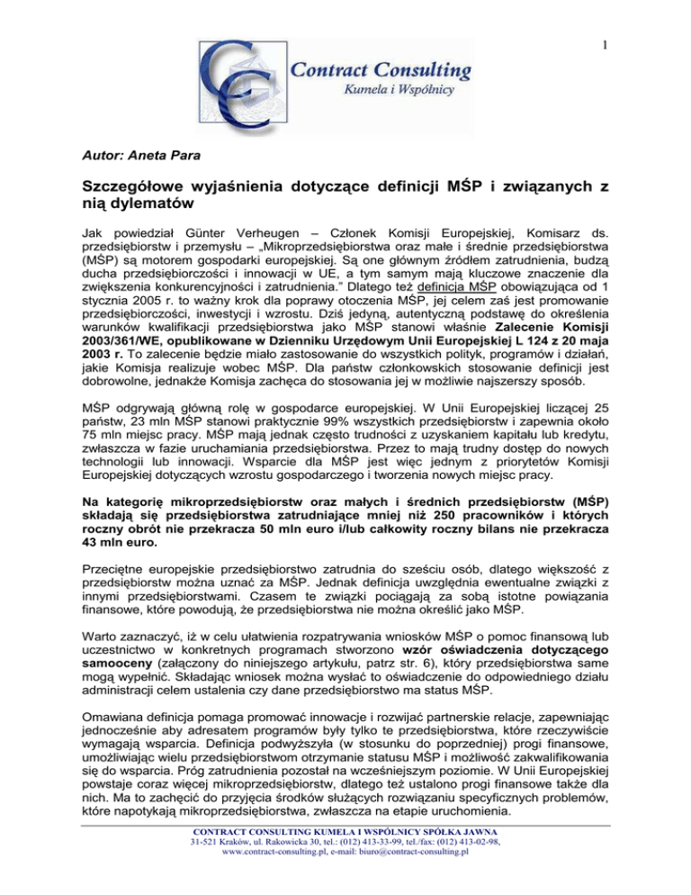 1 Autor: Aneta Para Szczegółowe wyjaśnienia dotyczące definicji MŚP i związanych z nią dylematów Jak powiedział Günter Verheugen – Członek Komisji Europejskiej, Komisarz ds. przedsiębiorstw i przemysłu – „Mikroprzedsiębiorstwa oraz małe i średnie przedsiębiorstwa (MŚP) są motorem gospodarki europejskiej. Są one głównym źródłem zatrudnienia, budzą ducha przedsiębiorczości i innowacji w UE, a tym samym mają kluczowe znaczenie dla zwiększenia konkurencyjności i zatrudnienia.” Dlatego teŜ definicja MŚP obowiązująca od 1 stycznia 2005 r. to waŜny krok dla poprawy otoczenia MŚP, jej celem zaś jest promowanie przedsiębiorczości, inwestycji i wzrostu. Dziś jedyną, autentyczną podstawę do określenia warunków kwalifikacji przedsiębiorstwa jako MŚP stanowi właśnie Zalecenie Komisji 2003/361/WE, opublikowane w Dzienniku Urzędowym Unii Europejskiej L 124 z 20 maja 2003 r. To zalecenie będzie miało zastosowanie do wszystkich polityk, programów i działań, jakie Komisja realizuje wobec MŚP. Dla państw członkowskich stosowanie definicji jest dobrowolne, jednakŜe Komisja zachęca do stosowania jej w moŜliwie najszerszy sposób. MŚP odgrywają główną rolę w gospodarce europejskiej. W Unii Europejskiej liczącej 25 państw, 23 mln MŚP stanowi praktycznie 99% wszystkich przedsiębiorstw i zapewnia około 75 mln miejsc pracy. MŚP mają jednak często trudności z uzyskaniem kapitału lub kredytu, zwłaszcza w fazie uruchamiania przedsiębiorstwa. Przez to mają trudny dostęp do nowych technologii lub innowacji. Wsparcie dla MŚP jest więc jednym z priorytetów Komisji Europejskiej dotyczących wzrostu gospodarczego i tworzenia nowych miejsc pracy. Na kategorię mikroprzedsiębiorstw oraz małych i średnich przedsiębiorstw (MŚP) składają się przedsiębiorstwa zatrudniające mniej niŜ 250 pracowników i których roczny obrót nie przekracza 50 mln euro i/lub całkowity roczny bilans nie przekracza 43 mln euro. Przeciętne europejskie przedsiębiorstwo zatrudnia do sześciu osób, dlatego większość z przedsiębiorstw moŜna uznać za MŚP. Jednak definicja uwzględnia ewentualne związki z innymi przedsiębiorstwami. Czasem te związki pociągają za sobą istotne powiązania finansowe, które powodują, Ŝe przedsiębiorstwa nie moŜna określić jako MŚP. Warto zaznaczyć, iŜ w celu ułatwienia rozpatrywania wniosków MŚP o pomoc finansową lub uczestnictwo w konkretnych programach stworzono wzór oświadczenia dotyczącego samooceny (załączony do niniejszego artykułu, patrz str. 6), który przedsiębiorstwa same mogą wypełnić. Składając wniosek moŜna wysłać to oświadczenie do odpowiedniego działu administracji celem ustalenia czy dane przedsiębiorstwo ma status MŚP. Omawiana definicja pomaga promować innowacje i rozwijać partnerskie relacje, zapewniając jednocześnie aby adresatem programów były tylko te przedsiębiorstwa, które rzeczywiście wymagają wsparcia. Definicja podwyŜszyła (w stosunku do poprzedniej) progi finansowe, umoŜliwiając wielu przedsiębiorstwom otrzymanie statusu MŚP i moŜliwość zakwalifikowania się do wsparcia. Próg zatrudnienia pozostał na wcześniejszym poziomie. W Unii Europejskiej powstaje coraz więcej mikroprzedsiębiorstw, dlatego teŜ ustalono progi finansowe takŜe dla nich. Ma to zachęcić do przyjęcia środków słuŜących rozwiązaniu specyficznych problemów, które napotykają mikroprzedsiębiorstwa, zwłaszcza na etapie uruchomienia. CONTRACT CONSULTING KUMELA I WSPÓLNICY SPÓŁKA JAWNA 31-521 Kraków, ul. Rakowicka 30, tel.: (012) 413-33-99, tel./fax: (012) 413-02-98, www.contract-consulting.pl, e-mail: [email protected] 2 Odwiecznym problemem MŚP jest dostęp do kapitału, często dlatego, iŜ nie są w stanie złoŜyć zabezpieczeń, jakich często Ŝądają kredytodawcy. Definicja przyznaje korzystne traktowanie niektórym inwestorom, takim jak fundusze regionalne, spółki kapitałowe podwyŜszonego ryzyka oraz „anioły biznesu”, bez konieczności utraty przez przedsiębiorstwo statusu MŚP. To samo dotyczy małych samorządów, które maja roczny budŜet nie przekraczający 10 mln euro i liczbę mieszkańców mniejszą niŜ 5000. Mogą one inwestować w MŚP do pewnej wysokości, przy czym przedsiębiorstwo nie traci praw i przywilejów przy ubieganiu się o dotacje. Stosuje się teŜ szczególne przepisy w odniesieniu do uniwersytetów i niedochodowych ośrodków badawczych, umoŜliwiając im posiadanie udziałów w MŚP. Taka wspólpraca zapewnia przedsiębiorstwu partnera finansowego i dostęp do B&R. Ośrodkom badawczym oferowana jest ścieŜka praktycznego zastosowania ich prac innowacyjnych. Aby środki przekazywane były tylko tym przedsiębiorstwom, które tego naprawdę potrzebują definicja wprowadza metody obliczania progu zatrudniania i pułapu finansowego, aby uzyskać faktyczny obraz sytuacji ekonomicznej przedsiębiorstwa. W tym celu wyodrębniono następujące kategorie przedsiębiorstw: niezaleŜne, partnerskie i związane. Podano wyraźne instrukcje, jak naleŜy traktować związki między MŚP a innymi przedsiębiorstwami i inwestorami. Generalnie większość MŚP to przedsiębiorstwa niezaleŜne, co oznacza, Ŝe działają całkowicie samodzielnie lub posiadają mniejszościowe udziały (mniej niŜ 25%) w jednym, lub kilku innych przedsiębiorstwach. Jeśli wysokość tych udziałów osiąga 50% to uznaje się, Ŝe są to przedsiębiorstwa partnerskie. PowyŜej tego pułapu przedsiębiorstwa uwaŜa się za związane. Przede wszystkim, aby zostać zakwalifikowanym do kategorii MŚP naleŜy mieć status przedsiębiorstwa. Przedsiębiorstwo to „podmiot prowadzący działalność gospodarczą bez względu na jego formę prawną”. A zatem mogą to być osoby prowadzące działalność na własny rachunek, przedsiębiorstwa rodzinne, czy teŜ spółki i konsorcja. Przy określaniu liczby zatrudnionych oraz kwot finanso