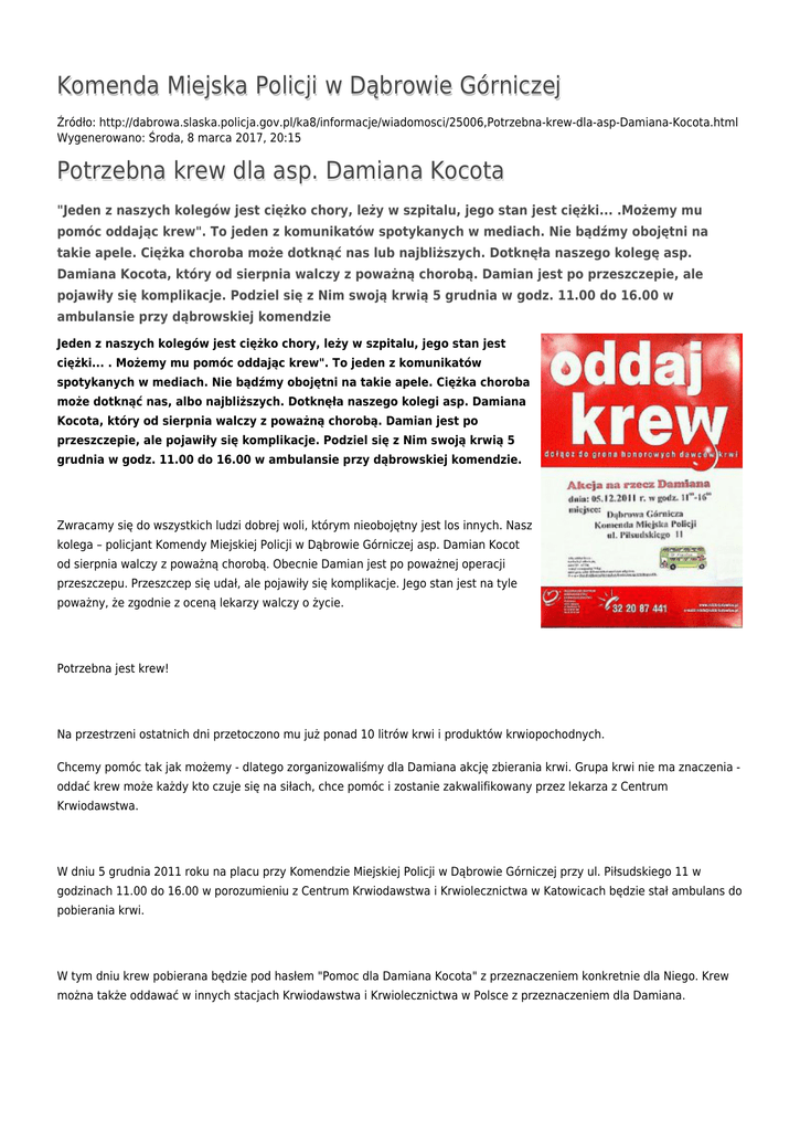 Komenda Miejska Policji w Dąbrowie Górniczej Źródło: http://dabrowa.slaska.policja.gov.pl/ka8/informacje/wiadomosci/25006,Potrzebna-krew-dla-asp-Damiana-Kocota.html Wygenerowano: Środa, 8 marca 2017, 20:15 Potrzebna krew dla asp. Damiana Kocota "Jeden z naszych kolegów jest ciężko chory, leży w szpitalu, jego stan jest ciężki... .Możemy mu pomóc oddając krew". To jeden z komunikatów spotykanych w mediach. Nie bądźmy obojętni na takie apele. Ciężka choroba może dotknąć nas lub najbliższych. Dotknęła naszego kolegę asp. Damiana Kocota, który od sierpnia walczy z poważną chorobą. Damian jest po przeszczepie, ale pojawiły się komplikacje. Podziel się z Nim swoją krwią 5 grudnia w godz. 11.00 do 16.00 w ambulansie przy dąbrowskiej komendzie Jeden z naszych kolegów jest ciężko chory, leży w szpitalu, jego stan jest ciężki... . Możemy mu pomóc oddając krew". To jeden z komunikatów spotykanych w mediach. Nie bądźmy obojętni na takie apele. Ciężka choroba może dotknąć nas, albo najbliższych. Dotknęła naszego kolegi asp. Damiana Kocota, który od sierpnia walczy z poważną chorobą. Damian jest po przeszczepie, ale pojawiły się komplikacje. Podziel się z Nim swoją krwią 5 grudnia w godz. 11.00 do 16.00 w ambulansie przy dąbrowskiej komendzie. Zwracamy się do wszystkich ludzi dobrej woli, którym nieobojętny jest los innych. Nasz kolega – policjant Komendy Miejskiej Policji w Dąbrowie Górniczej asp. Damian Kocot od sierpnia walczy z poważną chorobą. Obecnie Damian jest po poważnej operacji przeszczepu. Przeszczep się udał, ale pojawiły się komplikacje. Jego stan jest na tyle poważny, że zgodnie z oceną lekarzy walczy o życie. Potrzebna jest krew! Na przestrzeni ostatnich dni przetoczono mu już ponad 10 litrów krwi i produktów krwiopochodnych. Chcemy pomóc tak jak możemy - dlatego zorganizowaliśmy dla Damiana akcję zbierania krwi. Grupa krwi nie ma znaczenia oddać krew może każdy kto czuje się na siłach, chce pomóc i zostanie zakwalifikowany przez lekarza z Centrum Krwiodawstwa. W dniu 5 grudnia 2011 roku na placu przy Komendzie Miejskiej Policji w Dąbrowie Górniczej przy ul. Piłsudskiego 11 w godzinach 11.00 do 16.00 w porozumieniu z Centrum Krwiodawstwa i Krwiolecznictwa w Katowicach będzie stał ambulans do pobierania krwi. W tym dniu krew pobierana będzie pod hasłem "Pomoc dla Damiana Kocota" z przeznaczeniem konkretnie dla Niego. Krew można także oddawać w innych stacjach Krwiodawstwa i Krwiolecznictwa w Polsce z przeznaczeniem dla Damiana. Damian ma 36 lat, pracuje z nami od ponad 15 lat, cały czas w pionie prewencji. Jest świetnym policjantem, kolegą, mężem i ojcem. Nie wiemy czy będzie mógł jeszcze wrócić do służby, ale bardzo chcemy Mu pomóc. Jeśli chcecie i możecie, zachęcamy – przyłączcie się do naszej akcji. Ocena: 0/5 (0) Tweetnij
