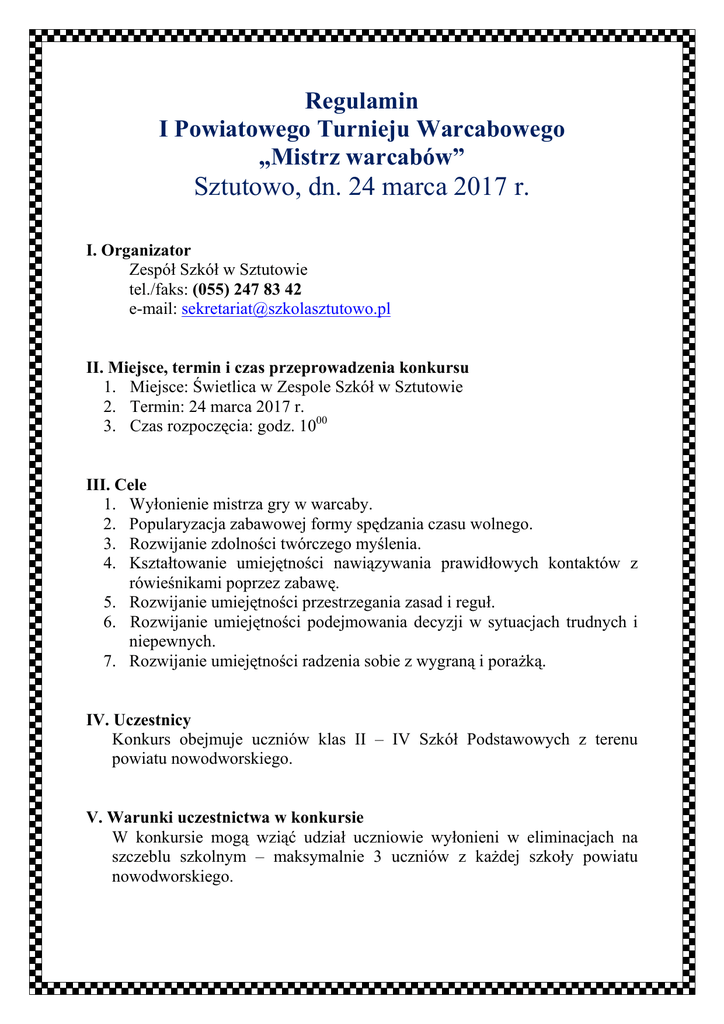 Regulamin I Powiatowego Turnieju Warcabowego „Mistrz warcabów” Sztutowo, dn. 24 marca 2017 r. I. Organizator Zespół Szkół w Sztutowie tel./faks: (055) 247 83 42 e-mail: [email protected] II. Miejsce, termin i czas przeprowadzenia konkursu 1. Miejsce: Świetlica w Zespole Szkół w Sztutowie 2. Termin: 24 marca 2017 r. 3. Czas rozpoczęcia: godz. 1000 III. Cele 1. Wyłonienie mistrza gry w warcaby. 2. Popularyzacja zabawowej formy spędzania czasu wolnego. 3. Rozwijanie zdolności twórczego myślenia. 4. Kształtowanie umiejętności nawiązywania prawidłowych kontaktów z rówieśnikami poprzez zabawę. 5. Rozwijanie umiejętności przestrzegania zasad i reguł. 6. Rozwijanie umiejętności podejmowania decyzji w sytuacjach trudnych i niepewnych. 7. Rozwijanie umiejętności radzenia sobie z wygraną i poraŜką. IV. Uczestnicy Konkurs obejmuje uczniów klas II – IV Szkół Podstawowych z terenu powiatu nowodworskiego. V. Warunki uczestnictwa w konkursie W konkursie mogą wziąć udział uczniowie wyłonieni w eliminacjach na szczeblu szkolnym – maksymalnie 3 uczniów z kaŜdej szkoły powiatu nowodworskiego. VI. Zasady turnieju 1. Gra w warcaby toczy się pomiędzy dwoma osobami. 2. Gra się 12 pionkami na czarnych polach, ustawia się je w 3 rzędach, 2 rzędy pól na środku planszy pozostają wolne. Plansza jest tak ułoŜona, aby obaj gracze mieli jasne pola naroŜne po prawej stronie. 3. Grę rozpoczyna gracz z białymi pionkami po uprzednim losowaniu. 4. Gracze wykonują kolejno po jednym ruchu, na przemian, własnymi pionkami. 5. W jednym ruchu dowolnie wybrany pionek moŜe zostać przesunięty o jedno pole naprzód po przekątnej (na ukos). Nie wolno wchodzić na białe pola ani na pola zajmowane przez inne pionki. 6. Bicie pionków przeciwnika odbywa się przez przeskoczenie przez bity pionek na następne pole za nim, o ile jest ono wolne. JeŜeli pionek, po przeskoczeniu pionka przeciwnika, ma moŜliwość bicia następnego pionka, to musi je wykonać. 7. Bić moŜna zarówno do przodu jak i do tyłu. 8. Bicie jest obowiązkowe i ma pierwszeństwo przed wykonaniem innego ruchu (zasada przymusu bicia). W przeciwnym razie traci się pionka. 9. Gdy pionek dojdzie do ostatniego rzędu szachownicy, zmienia się w damkę. W celu odróŜnienia damki nakłada się na nią warcaby tego samego koloru. 10. Damka porusza się po przekątnych (ciemnych polach) we wszystkich kierunkach (do przodu i do tyłu) na dowolnie wybrane pola. 11. W przypadku gdy istnieje wybór pomiędzy zbiciem róŜnych ilości warcabów przeciwnika, to obowiązkiem jest bicie większej ilości warcabów (zasada bicia większości). Przy czym damka ma obowiązek pierwszeństwa wykonania bicia. 12. ZwycięŜa gracz, który zbije lub zablokuje wszystkie pionki przeciwnika. Do remisu moŜe dojść, jeśli pozostaną dwie damki (po jednej u kaŜdego z graczy) lub dwa pionki (po jednym u kaŜdego z graczy). VII. Przebieg turnieju 1. Przedstawienie zasad turnieju. 2. Przeprowadzenie losowania – wyłonienie par walczących ze sobą. 3. Rozdanie dyplomów i nagród. Uroczyste wręczenie medali. VIII. Uwagi końcowe 1. Rozstrzygnięcie konkursu i wręczenie nagród nastąpi po rozgrywkach. 2. Organizatorzy zastrzegają sobie prawo do zmian w regulaminie. 3. Organizatorzy zastrzegają sobie prawo do utrwalenia przebiegu konkursu na zdjęciach fotograficznych w celu późniejszej publikacji. 4. Zaproszenie wraz z regulaminem dostępne jest równieŜ na stronie internetowej www.szkolasztutowo.com. IX. Termin składania zgłoszeń 1. Zgłoszenia naleŜy składać w Zespole Szkół w Sztutowie do 10 marca 2017r. drogą telefoniczną lub pocztą internetową: - droga telefoniczna (055)247 8342 - za pomocą poczty e-mail: [email protected] z dopiskiem w tytule w tytule: Konkurs „Mistrz Warcabów”. 2. Zgłoszenie powinno zawierać następujące dane: - imię i nazwisko ucznia, - klasę, nazwę oraz adres szkoły, do której uczęszcza, - telefon kontaktowy i adres e-mail szkoły.