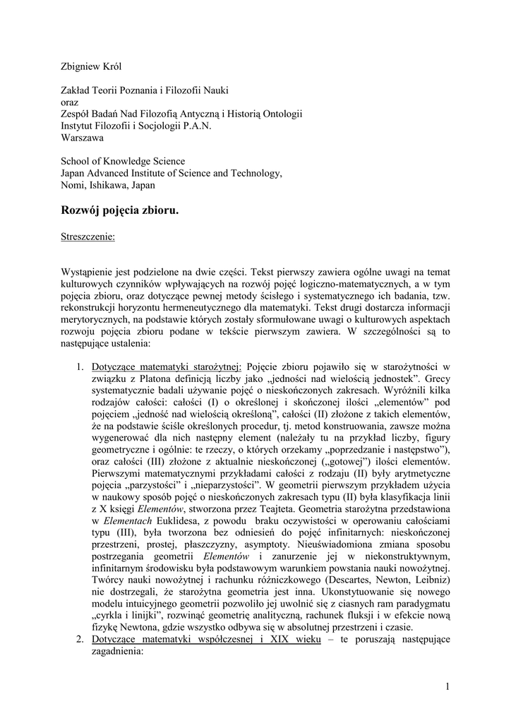 Zbigniew Król Zakład Teorii Poznania i Filozofii Nauki oraz Zespół Badań Nad Filozofią Antyczną i Historią Ontologii Instytut Filozofii i Socjologii P.A.N. Warszawa School of Knowledge Science Japan Advanced Institute of Science and Technology, Nomi, Ishikawa, Japan Rozwój pojęcia zbioru. Streszczenie: Wystąpienie jest podzielone na dwie części. Tekst pierwszy zawiera ogólne uwagi na temat kulturowych czynników wpływających na rozwój pojęć logiczno-matematycznych, a w tym pojęcia zbioru, oraz dotyczące pewnej metody ścisłego i systematycznego ich badania, tzw. rekonstrukcji horyzontu hermeneutycznego dla matematyki. Tekst drugi dostarcza informacji merytorycznych, na podstawie których zostały sformułowane uwagi o kulturowych aspektach rozwoju pojęcia zbioru podane w tekście pierwszym zawiera. W szczególności są to następujące ustalenia: 1. Dotyczące matematyki starożytnej: Pojęcie zbioru pojawiło się w starożytności w związku z Platona definicją liczby jako „jedności nad wielością jednostek”. Grecy systematycznie badali używanie pojęć o nieskończonych zakresach. Wyróżnili kilka rodzajów całości: całości (I) o określonej i skończonej ilości „elementów” pod pojęciem „jedność nad wielością określoną”, całości (II) złożone z takich elementów, że na podstawie ściśle określonych procedur, tj. metod konstruowania, zawsze można wygenerować dla nich następny element (należały tu na przykład liczby, figury geometryczne i ogólnie: te rzeczy, o których orzekamy „poprzedzanie i następstwo”), oraz całości (III) złożone z aktualnie nieskończonej („gotowej”) ilości elementów. Pierwszymi matematycznymi przykładami całości z rodzaju (II) były arytmetyczne pojęcia „parzystości” i „nieparzystości”. W geometrii pierwszym przykładem użycia w naukowy sposób pojęć o nieskończonych zakresach typu (II) była klasyfikacja linii z X księgi Elementów, stworzona przez Teajteta. Geometria starożytna przedstawiona w Elementach Euklidesa, z powodu braku oczywistości w operowaniu całościami typu (III), była tworzona bez odniesień do pojęć infinitarnych: nieskończonej przestrzeni, prostej, płaszczyzny, asymptoty. Nieuświadomiona zmiana sposobu postrzegania geometrii Elementów i zanurzenie jej w niekonstruktywnym, infinitarnym środowisku była podstawowym warunkiem powstania nauki nowożytnej. Twórcy nauki nowożytnej i rachunku różniczkowego (Descartes, Newton, Leibniz) nie dostrzegali, że starożytna geometria jest inna. Ukonstytuowanie się nowego modelu intuicyjnego geometrii pozwoliło jej uwolnić się z ciasnych ram paradygmatu „cyrkla i linijki”, rozwinąć geometrię analityczną, rachunek fluksji i w efekcie nową fizykę Newtona, gdzie wszystko odbywa się w absolutnej przestrzeni i czasie. 2. Dotyczące matematyki współczesnej i XIX wieku – te poruszają następujące zagadnienia: 1 a) różnice w podstawowych intuicjach wraz z propozycją rozważania tzw. intuicyjnych modeli matematycznych b) analiza najistotniejszych czynników dla ukonstytuowania się współczesnego pojęcia zbioru: ekstensjonalne i intensjonalne pojęcia zbioru, etc. c) podanie idei nowego, intuicyjnie jasnego pojęcia zbioru, na gruncie którego nie pojawia się antynomia Russella i które może być podstawą dla tworzenia nowych aksjomatycznych teorii zbiorów. Dyskusja powyższych zagadnień umożliwiła pokazanie, w których „miejscach” pojęcie zbioru było – i nadal jest – podatne na modyfikacje wywoływane przez czynniki kulturowe (por. tekst pierwszy). 2