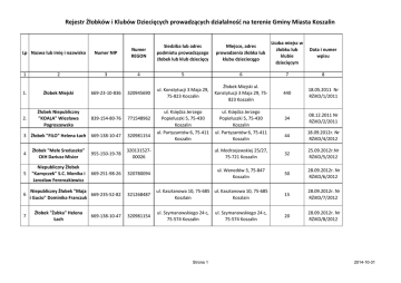 Rejestr Żłobków i Klubów Dziecięcych prowadzących działalność na terenie Gminy Miasta Koszalin Lp Nazwa lub imię i nazwisko Numer NIP Numer REGON Siedziba lub adres podmiotu prowadzącego żłobek lub klub dziecięcy Miejsce, adres prowadzenia żłobka lub klubu dzieciecęgo Liczba miejsc w żłobku lub klubie dziecięcym Data i numer wpisu 1 2 3 4 5 6 7 8 1. Żłobek Miejski 669-23-10-836 320945690 ul. Konstytucji 3 Maja 29, 75-823 Koszalin Żłobek Miejski ul. Konstytucji 3 Maja 29, 75823 Koszalin 440 18.05.2011 Nr RŻiKD/1/2011 2. Żłobek Niepubliczny "KOALA" Wiesława Pogroszewska 839-154-80-76 771548962 ul. Księdza Jerzego Popiełuszki 5, 75-430 Koszalin ul. Księdza Jerzego Popiełuszki 5, 75-430 Koszalin 34 08.12.2011 Nr RŻiKD/2/2011 3 Żłobek "FILO" Helena Łach 669-138-10-47 320981154 ul. Partyzantów 6, 75-411 Koszalin ul. Partyzantów 6, 75-411 Koszalin 44 18.09.2012r. Nr RŻiKD/4/2012 4 Żłobek "Małe Sreduszko" CKH Dariusz Misior 955-150-19-78 32013152700026 ul. Modrzejewskiej 25/27, 75-721 Koszalin 32 25.09.2012r.Nr RŻiKD/5/2012 5 Niepubliczny Żłobek "Kamyczek" S.C. Monika i Jarosław Ferenszkiewicz 669-251-98-26 320780094 ul. Wenedów 3, 75-847 Koszalin 50 28.09.2012r. Nr RŻiKD/6/2012 Niepubliczny Żłobek "Maja 669-235-52-82 i Gucio" Dominika Franczuk 321268487 ul. Kasztanowa 10, 75-685 ul. Kasztanowa 10, 75-685 Koszlain Koszlain 15 28.09.2012r. Nr RŻiKD/7/2012 320981154 ul. Szymanowskiego 24 c, 75-574 Koszalin 20 28.09.2012r. Nr RŻiKD/8/2012 6 7 Żłobek "Żabka" Helena Łach 669-138-10-47 Strona 1 ul. Szymanowskiego 24 c, 75-574 Koszalin 2014-10-31 Rejestr Żłobków i Klubów Dziecięcych prowadzących działalność na terenie Gminy Miasta Koszalin 8 Niepubliczny Żłobek "Krasnal" EM-MED Spółka Cywilna Małgorzata Chmielewska, Monika Jaruszewska 669-250-24-87 320886912 ul. Tytusa Chałubińskiego 12a, 75-950 Koszalin ul. Tytusa Chałubińskiego 12a, 75-950 Koszalin 33 28.09.2012r. Nr RŻiKD/9/2012 9 Klub Dziecięcy "BAŚNIOWA KRAINA" Tomasz Jaroszyk 669-189-50-59 331248264 ul. Spokojna 50b, 75-228 Koszalin ul. Spokojna 50b, 75-228 Koszalin 25 08.07.2013 r. Nr RŻiKD/10/2013 10 Żłobek Agugu Katarzyna Grzęda 843-153-58-62 321399976 ul. Francuska 4, 75-430 Koszalin ul. Francuska 4, 75-430 Koszalin 30 05.09.2013.Nr RŻIKD/11/2013 11 Żłobek MIŚ "B-3" Spółka z o.o. 525-247-42-89 142181075 ul. Krakowskie Przedmiescie 47/51, 00071 Warszawa ul. Piłsudskiego 52, budynek A, 75-512 Koszalin 55 05.09.2013.Nr RŻIKD/12/2013 12 Niepubliczny Żłobek "Promyczek" Patryk Szymański 669-238-58-05 321574729 ul. Wańkowicza 9b/2,75445 Koszalin ul. Robotnicza 8, 75-344 Koszalin 10 30.09.2014 r.NR RŻiKD/13/2014 Strona 2 2014-10-31