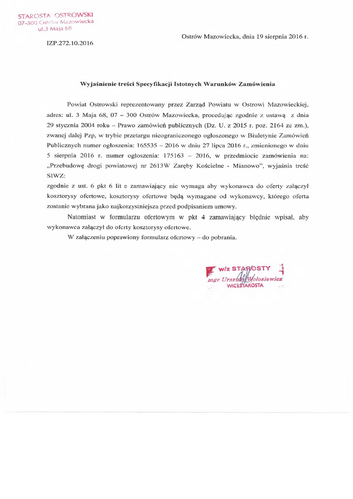 AROSTA O STRO W SKI -300 Ostrów Mazowiecka ul.3 Maja 68 O stró w M azo w ieck a, d n ia 19 sierp n ia 2 016 r. IZ P .2 7 2 .1 0 .2 0 1 6 W y ja śn ien ie treści S p ecy fik a cji Isto tn y ch W a ru n k ó w Z a m ó w ien ia P o w ia t O stro w sk i rep rezen to w an y p rz e z Z arząd P o w ia tu w O stro w i M azo w ieck iej, adres: ul. 3 M aja 68, 07 — 300 O stró w M azo w ieck a, p ro c ed u jąc zg o d n ie z u sta w ą z d n ia 29 sty czn ia 2004 ro k u — P raw o za m ó w ie ń p u b liczn y c h (D z. U . z 2015 r. p o z. 2 1 6 4 ze zm .), zw anej dalej P zp, w try b ie p rz etarg u n ieo g ra n iczo n e g o o g ło szo n eg o w B iu le ty n ie Z am ó w ie ń P u b lic zn y ch n u m e r ogłoszenia: 165535 — 201 6 w dniu 27 lip ca 201 6 r., z m ien io n eg o w dniu 5 sierp n ia 2 016 r. n u m e r ogłoszen ia: 175163 — 2016, w p rz e d m io c ie z a m ó w ie n ia na: „P rz eb u d o w ę d ro g i pow iatow ej n r 2 6 1 3 W Z aręb y K o ścieln e - M ia n o w o ” , w y ja śn ia treść S IW Z : zg o d n ie z ust. 6 p k t 6 lit e zam a w iając y nie w y m a g a aby w y k o n a w c a do o fe rty za łą czy ł k o szto ry sy ofertow e, k o szto ry sy o ferto w e b ę d ą w y m ag a n e od w y k o n a w cy , k tó reg o o fe rta zo stan ie w y b ra n a ja k o n ajk o rz y stn ie jsz a p rzed p o d p isan iem um ow y. Natomiast w formularzu ofertowym w pkt 4 zamawiający błędnie wpisał, aby w y k o n a w c a za łą czy ł do oferty k o szto ry sy o fertow e. W z a łą cze n iu p o p raw io n y fo rm u larz o ferto w y —do pobrania. Z a łą c zn ik n r 1 d o S IW Z na: „ P r ze b u d o w ę d r o g i p o w ia to w e j n r 2 6 1 3 W Z a r ę b y K o śc ie ln e - M ia n o w o ’’ (p ieczęć w y k o n a w c y ) F o rm u la rz o ferto w y N a w iązu jąc do o g ło szo n eg o p rz etarg u n ieo g ran iczo n eg o na ro b o ty b u d o w lan e p o leg ają ce na realizac ji z a d an ia pn.: „ P rzeb u d o w a d ro g i p o w ia to w e j n r 2 6 1 3 W Z a rę b y K o śc ie ln e - M ia n o w o ” O św ia d cza m y , że: - za p o zn aliśm y się ze sp ec y fik acją isto tn y ch w a ru n k ó w z a m ó w ie n ia i u z n a je m y się z a z w ią zan y c h o k re ślo n y m i w niej zasad am i p o stęp o w an ia, - za p o zn aliśm y się z istn iejący m stanem m ie jsc a robót. D o p o w y ż sz eg o n ie w n o sim y ż a d n y ch u w a g i zastrzeżeń . O feru jem y re alizac ję za m ó w ie n ia zg o d n ie ze S IW Z i załą czo n y m k o szto ry se m z a k w o tę n e t t o ........................................................................ o fe rto w y m zł p o d atek V A T ............................................................ zł k w o ta b ru tto zł sło w n ie zło ty ch U d zielam g w a ran cji na p rz ed m io t za m ó w ie n ia n a o k r e s .....m iesięcy. 1. P ła tn o ść fak tu ry n astąp i w ciąg u 30 dni od o trzy m a n ia fak tu ry z z a ch o w a n ie m p rz ep isó w art. 143b, 143c u staw y P zp. 2. Oświadczamy, że zapoznaliśmy się ze specyfikacją istotnych warunków zamówienia i n ie w n o sim y do niej za strzeż eń oraz zd o b y liśm y k o n iecz n e in fo rm ac je p o trzeb n e do w łaśc iw eg o w y k o n a n ia z a m ó w ie n ia (w tym : z a p o zn aliśm y się z d o k u m e n ta c ją p ro jek to w ą). 3. Z a strz eg am y je d n o c z e śn ie , że in fo rm acje zaw arte w za łą czn ik u n r ____do tajem n icę p rz ed sięb io rstw a w ro z u m ie n iu p rz e p isó w u staw y o o ferty stan o w ią z w a lc z a n iu n ieu czciw ej k o n k u re n cji i ja k o tak ie nie m o g ą b y ć u d o stęp n io n e in n y m w y k o n a w c o m b io rąc y m u d ział w p o stęp o w an iu . 4. U w ażam y się z a zw iązan y ch n in iejszą o fe rtą p rz ez okres 30 dni od u p ły w u te rm in u sk ład an ia ofert. 5. R o b o ty o b jęte za m ó w ie n iem za m ie rza m y w ykonać: 1) w e w łasn y m zak resie b ez u d ziału p o d w y k o n a w có w * , 2) z u d ziałem p o d w y k o n a w có w podw ykonaw ców *: * n ie p o trz eb n e skreślić — zak res p ra c p rz ew id zian y do w y k o n a n ia p rzez 6. W razie w y b ra n ia naszej oferty zo b o w ią zu jem y się do p o d p isa n ia u m o w y n a w a ru n k ach za w arty c h w załączo n y m w z o rze u m o w y o raz w m iejscu i te rm in ie o k re ślo n y m p rz ez zam aw iaj ąc e g o . N asz n r R E G O N ....................................................... N IP O fertę n in iejsz ą sk ła d a m y n a ..........................k olejn o p o n u m ero w a n y ch stro n a ch . Z ałączn ik am i do n in iejszeg o fo rm u larza stan o w iący m i in teg ra ln ą cz ęść o fe rty są d o k u m en ty w y m ag an e w sp ec y fik acji istotnych w a ru n k ó w zam ó w ien ia. P ro sim y o z w ro t p ien ięd z y w n iesio n y ch ty tu łe m w a d iu m n a konto*: *dotyczy tych wykonawców, którzy wnoszą wadium w pieniądzu D an e k o n tak to w e w ykonaw cy: nr teł. nr fax e-m ail (miejscowość i data) (podpis osoby uprawnionej do składania oświadczeń woli w imieniu wykonawcy)