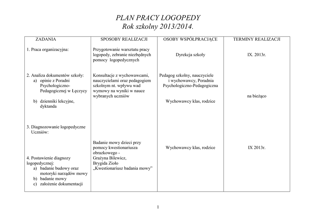 PLAN PRACY LOGOPEDY Rok szkolny 2013/2014.