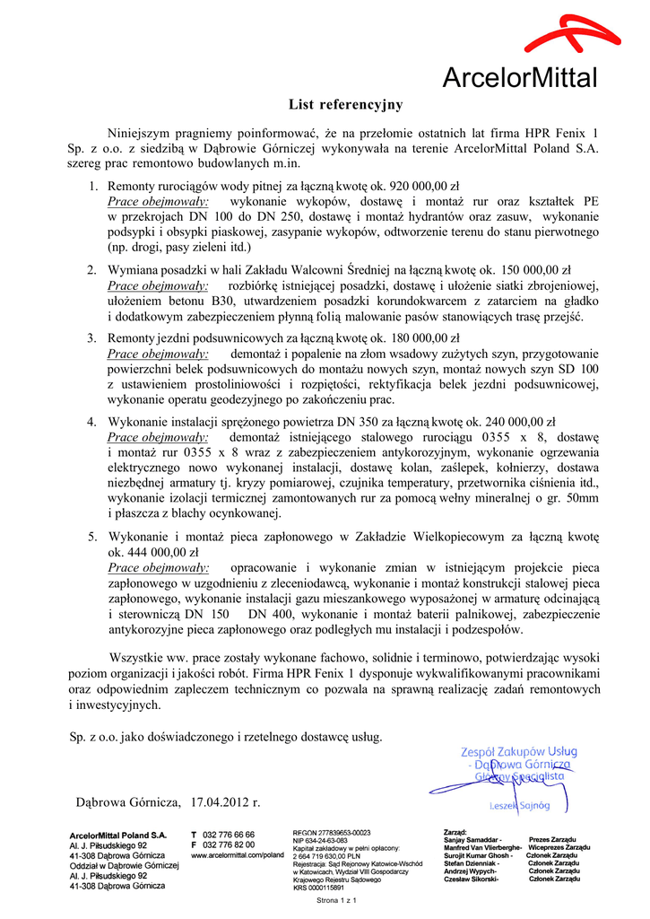 ArcelorMittal List referencyjny Niniejszym pragniemy poinformować, że na przełomie ostatnich lat firma HPR Fenix 1 Sp. z o.o. z siedzibą w Dąbrowie Górniczej wykonywała na terenie ArcelorMittal Poland S.A. szereg prac remontowo budowlanych m.in. 1. Remonty rurociągów wody pitnej za łączną kwotę ok. 920 000,00 zł Prace obejmowały: wykonanie wykopów, dostawę i montaż rur oraz kształtek PE w przekrojach DN 100 do DN 250, dostawę i montaż hydrantów oraz zasuw, wykonanie podsypki i obsypki piaskowej, zasypanie wykopów, odtworzenie terenu do stanu pierwotnego (np. drogi, pasy zieleni itd.) 2. Wymiana posadzki w hali Zakładu Walcowni Średniej na łączną kwotę ok. 150 000,00 zł Prace obejmowały: rozbiórkę istniejącej posadzki, dostawę i ułożenie siatki zbrojeniowej, ułożeniem betonu B30, utwardzeniem posadzki korundokwarcem z zatarciem na gładko i dodatkowym zabezpieczeniem płynną folią malowanie pasów stanowiących trasę przejść. 3. Remonty jezdni podsuwnicowych za łączną kwotę ok. 180 000,00 zł Prace obejmowały: demontaż i popalenie na złom wsadowy zużytych szyn, przygotowanie powierzchni belek podsuwnicowych do montażu nowych szyn, montaż nowych szyn SD 100 z ustawieniem prostoliniowości i rozpiętości, rektyfikacja belek jezdni podsuwnicowej, wykonanie operatu geodezyjnego po zakończeniu prac. 4. Wykonanie instalacji sprężonego powietrza DN 350 za łączną kwotę ok. 240 000,00 zł Prace obejmowały: demontaż istniejącego stalowego rurociągu 0355 x 8, dostawę i montaż rur 0355 x 8 wraz z zabezpieczeniem antykorozyjnym, wykonanie ogrzewania elektrycznego nowo wykonanej instalacji, dostawę kolan, zaślepek, kołnierzy, dostawa niezbędnej armatury tj. kryzy pomiarowej, czujnika temperatury, przetwornika ciśnienia itd., wykonanie izolacji termicznej zamontowanych rur za pomocą wełny mineralnej o gr. 50mm i płaszcza z blachy ocynkowanej. 5. Wykonanie i montaż pieca zapłonowego w Zakładzie Wielkopiecowym za łączną kwotę ok. 444 000,00 zł Prace obejmowały: opracowanie i wykonanie zmian w istniejącym projekcie pieca zapłonowego w uzgodnieniu z zleceniodawcą, wykonanie i montaż konstrukcji stalowej pieca zapłonowego, wykonanie instalacji gazu mieszankowego wyposażonej w armaturę odcinającą i sterowniczą DN 150 DN 400, wykonanie i montaż baterii palnikowej, zabezpieczenie antykorozyjne pieca zapłonowego oraz podległych mu instalacji i podzespołów. Wszystkie ww. prace zostały wykonane fachowo, solidnie i terminowo, potwierdzając wysoki poziom organizacji i jakości robót. Firma HPR Fenix 1 dysponuje wykwalifikowanymi pracownikami oraz odpowiednim zapleczem technicznym co pozwala na sprawną realizację zadań remontowych i inwestycyjnych. Sp. z o.o. jako doświadczonego i rzetelnego dostawcę usług. Dąbrowa Górnicza, 17.04.2012 r. Strona 1 z 1