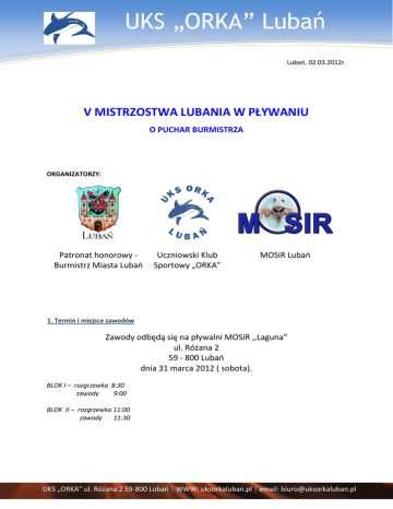 UKS „ORKA” Lubań Lubań, 02.03.2012r. V MISTRZOSTWA LUBANIA W PŁYWANIU O PUCHAR BURMISTRZA ORGANIZATORZY: Patronat honorowy Burmistrz Miasta Lubań Uczniowski Klub Sportowy „ORKA” MOSiR Lubań 1. Termin i miejsce zawodów Zawody odbędą się na pływalni MOSiR ,,Laguna” ul. Różana 2 59 - 800 Lubań dnia 31 marca 2012 ( sobota). BLOK I – rozgrzewka 8:30 zawody 9:00 BLOK II – rozgrzewka 11:00 zawody 11:30 UKS „ORKA” ul. Różana 2 59-800 Lubań | WWW: uksorkaluban.pl | email: [email protected] 2. Uczestnictwo W zawodach mogą uczestniczyć zawodnicy posiadający aktualne badania lekarskie w następujących kategoriach wiekowych: Kategoria I rocznik 2004 Kategoria II rocznik 2003 I BLOK Kategoria III rocznik 2002 ---------------------------------------------------------------------------------------------------------- Kategoria IV rocznik 2001 Kategoria V rocznik 2000 Kategoria VI rocznik 1999 II BLOK Kategoria VII rocznik 1998 Kategoria VIII rocznik 1997 Kategoria Open W sztafecie startuje po jednym zawodniku w kategorii V, VI, VII, VIII W bloku I zawodnicy mogą startować w dwóch konkurencjach. W bloku II zawodnicy mogą startować w dwóch konkurencjach i sztafecie. 3. Informacje techniczne Basen: 25m, temperatura wody: 27,5 °C Pomiar czasu: ręczny Ilość torów: 5 BLOK I godz.: 9:00 (rozgrzewka 8:30) DZIEWCZYNY (rocznik 2004, 2003) CHŁOPCY (rocznik 2004,2003) 1 25 m st. dowolnym 2 25 m st. dowolnym 3 25 m st. grzbietowym 4 25 m st. grzbietowym DZIEWCZYNY (rocznik 2002) CHŁOPCY (rocznik 2002) 5 50 m st. dowolnym 6 50 m st. dowolnym 6 50 m st. grzbietowym 7 50 m st. Grzbietowym BLOK I - dekoracja po bloku BLOK II godz.: 11:30 (rozgrzewka 11:00) DZIEWCZYNY (rocznik 2001 i starsi) CHŁOPCY (rocznik 2001 i starsi) 1 50 m st. motylkowym 2 50 m st. motylkowym 3 50 m st. grzbietowym 4 50 m st. grzbietowym 5 50 m st. klasycznym 6 50 m st. klasycznym 7 100 m st. dowolnym 8 100m st. dowolnym 9 4 x 50 m st. dowolnym (97,98,99,2000) 10 4 x 50 st. dowolnym (97,98,99,2000) 2|Strona 4. Zgłoszenia Zgłoszenia za pomocą edytora zgłoszeń – zaproszenie (plik.lxf) dostępne na stronie http://omegatiming.pl i http://www.arybacki.pl .Plik zgłoszenia należy przesłać na adres: [email protected] do 27 marca 2012r. W razie problemów prosimy o bezpośredni kontakt pod numerem: 668-233-744. Wyniki live zawodów na stronie http://omegatiming.pl/zawody/okregowe 5. Zasady finansowania Koszty organizacyjne pokrywa organizator. Opłata startowa w I bloku wynosi 10 zł od zgłoszonego zawodnika Opłata startowa w II bloku wynosi 20 zł od zgłoszonego zawodnika. 6. Nagrody W każdej konkurencji trzy pierwsze zawodniczki i trzech pierwszych zawodników w swojej kategorii wiekowej otrzyma pamiątkowe dyplomy. W bloku II do trzeciego miejsca najlepsza zawodniczka i zawodnik w swojej kategorii wiekowej według tabeli wielobojowej (za 2 najlepsze starty) otrzyma nagrodę rzeczową. W bloku I wszystkie dzieci otrzymują pamiątkowe dyplomy za udział. Najlepsze sztafety w danej konkurencji otrzymują puchar Burmistrza Miasta Lubań. 7. Postanowienia końcowe Odprawa trenerów odbędzie się w trakcie rozgrzewki bloku I i II na terenie pływalni. W sprawach nie objętym regulaminem decyduje naczelnik zawodów oraz sędzia główny. Podczas trwania zawodów obowiązuje regulamin wewnętrzny pływalni „Laguna”. Organizator nie ponosi odpowiedzialności z tytułu ubezpieczeń zdrowotnych i następstw nieszczęśliwych wypadków. Organizator zabezpiecza obiady – kontakt: po 14:00 75 646 57 00; całą dobę: 507 021 582 ŻYCZYMY UDANYCH STARTÓW I DOBRYCH WYNIKÓW ! 3|Strona