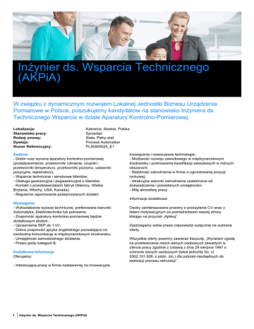 Inżynier ds. Wsparcia Technicznego (AKPiA) W związku z dynamicznym rozwojem Lokalnej Jednostki Biznesu Urządzenia Pomiarowe w Polsce, poszukujemy kandydatów na stanowisko Inżyniera ds. Technicznego Wsparcia w dziale Aparatury Kontrolno-Pomiarowej. Lokalizacja: Stanowisko pracy: Rodzaj umowy: Dywizja: Numer Referencyjny: Katowice, Slaskie, Polska Sprzedaż Stała, Pełny etat Process Automation PL55505525_E1 Zadania - Dobór oraz wycena aparatury kontrolno-pomiarowej (przepływomierze, przetworniki ciśnienia, czujniki i przetworniki temperatury, przetworniki poziomu, ustawniki pozycyjne, rejestratory); - Wsparcie techniczne i serwisowe klientów; - Obsługa gwarancyjna i pogwarancyjna u klientów; - Kontakt z przedstawicielami fabryk (Niemcy, Wielka Brytania, Włochy, USA, Kanada); - Regularne raportowanie podejmowanych działań. rozwiązania i nowoczesne technologie; - Możliwość rozwoju zawodowego w międzynarodowym środowisku i podnoszenia kwalifikacji zawodowych w różnych obszarach; - Stabilność zatrudnienia w firmie o ugruntowanej pozycji rynkowej; - Atrakcyjne warunki zatrudnienia uzależnione od doświadczenia i posiadanych umiejętności; - Miłą atmosferę pracy. Informacje dodatkowe: Wymagania - Wykształcenie wyższe techniczne, preferowane kierunki: Automatyka, Elektrotechnika lub pokrewne; - Znajomość aparatury kontrolno-pomiarowej będzie dodatkowym atutem; - Uprawnienia SEP do 1 kV; - Dobra znajomość języka angielskiego pozwalająca na swobodną komunikację w międzynarodowym środowisku; - Umiejętność samodzielnego działania; - Prawo jazdy kategorii B. Dodatkowe Informacje Oferujemy: - Interesującą pracę w firmie nastawionej na innowacyjne 1 Inżynier ds. Wsparcia Technicznego (AKPiA) Osoby zainteresowane prosimy o przesyłanie CV wraz z listem motywacyjnym za pośrednictwem naszej strony klikając na przycisk „Aplikuj”. Zastrzegamy sobie prawo odpowiedzi wyłącznie na wybrane oferty. Wszystkie oferty powinny zawierać klauzulę: „Wyrażam zgodę na przetwarzanie moich danych osobowych zawartych w ofercie pracy zgodnie z Ustawą z dnia 29 sierpnia 1997 o ochronie danych osobowych (tekst jednolity Dz. U. 2002.101.926. z późn. zm.) dla potrzeb niezbędnych do realizacji procesu rekrutacji”. ABB (www.abb.com) jest liderem w technologiach dla energetyki i automatyki, które pozwalają klientom przemysłowym oraz zakładom użyteczności publicznej zwiększyć swoją efektywność przy minimalizowaniu oddziaływania na środowisko. Grupa ABB zatrudnia 150 000 pracowników w ponad 100 krajach świata. Our ambition. Your legacy. 2 Inżynier ds. Wsparcia Technicznego (AKPiA)
