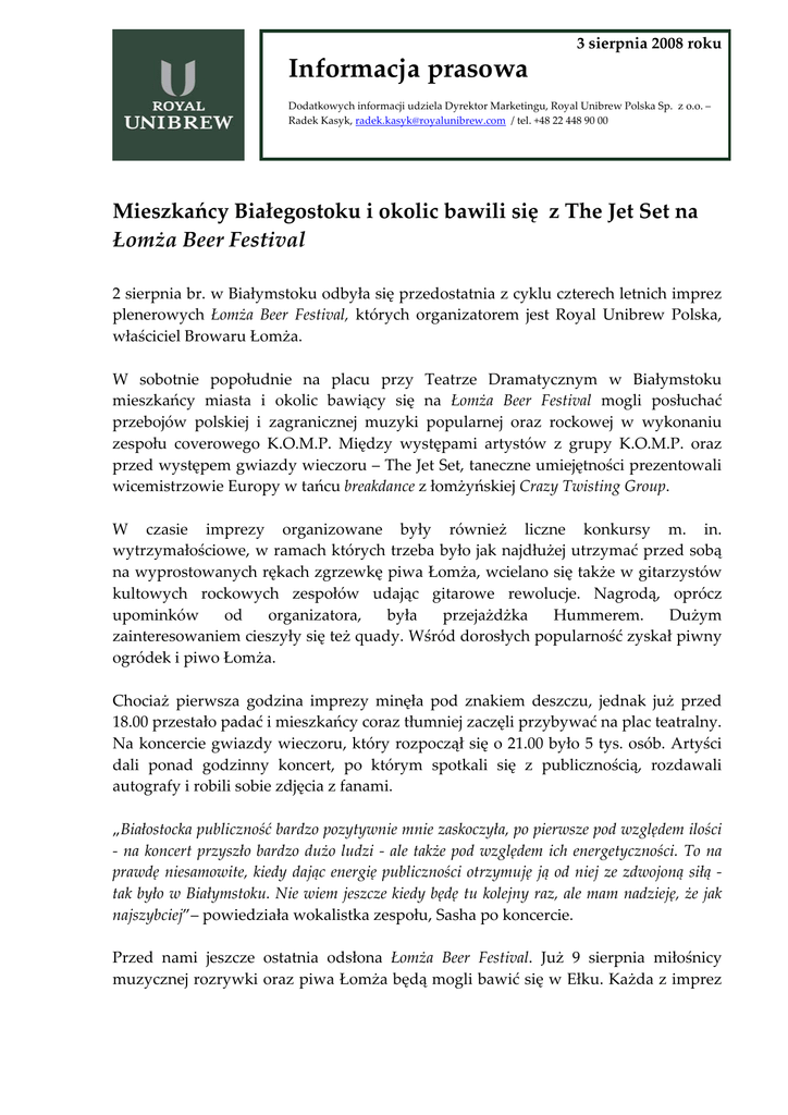 3 sierpnia 2008 roku Informacja prasowa Dodatkowych informacji udziela Dyrektor Marketingu, Royal Unibrew Polska Sp. z o.o. – Radek Kasyk, [email protected] / tel. +48 22 448 90 00 Mieszkańcy Białegostoku i okolic bawili się z The Jet Set na Łomża Beer Festival 2 sierpnia br. w Białymstoku odbyła się przedostatnia z cyklu czterech letnich imprez plenerowych Łomża Beer Festival, których organizatorem jest Royal Unibrew Polska, właściciel Browaru Łomża. W sobotnie popołudnie na placu przy Teatrze Dramatycznym w Białymstoku mieszkańcy miasta i okolic bawiący się na Łomża Beer Festival mogli posłuchać przebojów polskiej i zagranicznej muzyki popularnej oraz rockowej w wykonaniu zespołu coverowego K.O.M.P. Między występami artystów z grupy K.O.M.P. oraz przed występem gwiazdy wieczoru – The Jet Set, taneczne umiejętności prezentowali wicemistrzowie Europy w tańcu breakdance z łomżyńskiej Crazy Twisting Group. W czasie imprezy organizowane były również liczne konkursy m. in. wytrzymałościowe, w ramach których trzeba było jak najdłużej utrzymać przed sobą na wyprostowanych rękach zgrzewkę piwa Łomża, wcielano się także w gitarzystów kultowych rockowych zespołów udając gitarowe rewolucje. Nagrodą, oprócz upominków od organizatora, była przejażdżka Hummerem. Dużym zainteresowaniem cieszyły się też quady. Wśród dorosłych popularność zyskał piwny ogródek i piwo Łomża. Chociaż pierwsza godzina imprezy minęła pod znakiem deszczu, jednak już przed 18.00 przestało padać i mieszkańcy coraz tłumniej zaczęli przybywać na plac teatralny. Na koncercie gwiazdy wieczoru, który rozpoczął się o 21.00 było 5 tys. osób. Artyści dali ponad godzinny koncert, po którym spotkali się z publicznością, rozdawali autografy i robili sobie zdjęcia z fanami. „Białostocka publiczność bardzo pozytywnie mnie zaskoczyła, po pierwsze pod względem ilości ‐ na koncert przyszło bardzo dużo ludzi ‐ ale także pod względem ich energetyczności. To na prawdę niesamowite, kiedy dając energię publiczności otrzymuję ją od niej ze zdwojoną siłą ‐ tak było w Białymstoku. Nie wiem jeszcze kiedy będę tu kolejny raz, ale mam nadzieję, że jak najszybciej”– powiedziała wokalistka zespołu, Sasha po koncercie. Przed nami jeszcze ostatnia odsłona Łomża Beer Festival. Już 9 sierpnia miłośnicy muzycznej rozrywki oraz piwa Łomża będą mogli bawić się w Ełku. Każda z imprez Łomża Beer Festival to wiele atrakcji, niezapomniana zabawa i koncerty gwiazd takich jak: In‐Grid, Kasia Cerekwicka, Łzy czy The Jet Set. Dodatkowe informacje: Iwona Gniedziejko-Płuciennik Telefon Faks GSM Email: +48 22 448 90 00 +48 22 448 91 00 +48 604 45 40 09 [email protected] ––––––––––––––––––––––––––––––––––––––––––––––––––––––––––––––––––––––––––––––––––––– Royal Unibrew A/S jest drugą co do wielkości grupą w branży piwnej oraz największym eksporterem piwa w Skandynawii. Główna siedziba firmy mieści się w Faxe, w Danii. W skład Grupy Royal Unibrew wchodzi 13 browarów oraz jedna firma produkująca napoje. W Danii Grupa posiada 3 browary: Albani, Ceres i Faxe, na Litwie jest właścicielem marki Kalnapilis, a na Łotwie - Lacplesa oraz rozlewni napojów Cido. W Polsce posiada 100% udziałów w browarach Brok, Strzelec oraz Łomża, a na Karaibach dwa przedsiębiorstwa na Antigui i Dominice.