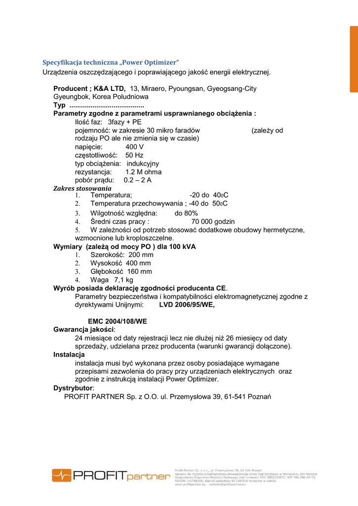 Specyfikacja techniczna „Power Optimizer” Urządzenia oszczędzającego i poprawiającego jakość energii elektrycznej. Producent ; K&A LTD, 13, Miraero, Pyoungsan, Gyeogsang-City Gyeungbok, Korea Poludniowa Typ ....................................... Parametry zgodne z parametrami usprawnianego obciążenia : Ilość faz: 3fazy + PE pojemność: w zakresie 30 mikro faradów (zależy od rodzaju PO ale nie zmienia się w czasie) napięcie: 400 V częstotliwość: 50 Hz typ obciążenia: indukcyjny rezystancja: 1.2 M ohma pobór prądu: 0.2 – 2 A Zakres stosowania 1. Temperatura; -20 do 400C 2. Temperatura przechowywania ; -40 do 500C 3. Wilgotność względna: do 80% 4. Średni czas pracy : 70 000 godzin 5. W zależności od potrzeb stosować dodatkowe obudowy hermetyczne, wzmocnione lub kroploszczelne. Wymiary (zależą od mocy PO ) dla 100 kVA 1. Szerokość: 200 mm 2. Wysokość 400 mm 3. Głębokość 160 mm 4. Waga 7,1 kg Wyrób posiada deklarację zgodności producenta CE. Parametry bezpieczeństwa i kompatybilności elektromagnetycznej zgodne z dyrektywami Unijnymi: LVD 2006/95/WE, EMC 2004/108/WE Gwarancja jakości: 24 miesiące od daty rejestracji lecz nie dłużej niż 26 miesięcy od daty sprzedaży, udzielana przez producenta (warunki gwarancji dołączone). Instalacja instalacja musi być wykonana przez osoby posiadające wymagane przepisami zezwolenia do pracy przy urządzeniach elektrycznych oraz zgodnie z instrukcją instalacji Power Optimizer. Dystrybutor: PROFIT PARTNER Sp. z O.O. ul. Przemysłowa 39, 61-541 Poznań