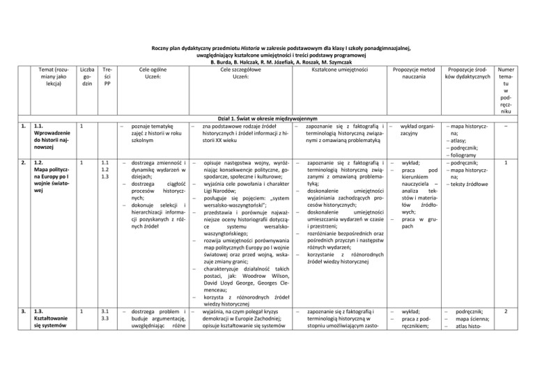 Temat (rozumiany jako lekcja) Liczba godzin 1. 1.1. Wprowadzenie do historii najnowszej 1 2. 1.2. Mapa polityczna Europy po I wojnie światowej 1 Roczny plan dydaktyczny przedmiotu Historia w zakresie podstawowym dla klasy I szkoły ponadgimnazjalnej, uwzględniający kształcone umiejętności i treści podstawy programowej B. Burda, B. Halczak, R. M. Józefiak, A. Roszak, M. Szymczak Cele ogólne Cele szczegółowe Kształcone umiejętności Propozycje metod Uczeń: Uczeń: nauczania Treści PP − 1.1 1.2 1.3 − − − poznaje tematykę zajęć z historii w roku szkolnym − dostrzega zmienność i dynamikę wydarzeń w dziejach; dostrzega ciągłość procesów historycznych; dokonuje selekcji i hierarchizacji informacji pozyskanych z różnych źródeł − − − − − − − 3. 1.3. Kształtowanie się systemów 1 3.1 3.3 − dostrzega problem i − buduje argumentację, uwzględniając różne Dział 1. Świat w okresie międzywojennym zna podstawowe rodzaje źródeł − zapoznanie się z faktografią i − historycznych i źródeł informacji z hiterminologią historyczną związastorii XX wieku nymi z omawianą problematyką opisuje następstwa wojny, wyróżniając konsekwencje polityczne, gospodarcze, społeczne i kulturowe; wyjaśnia cele powołania i charakter Ligi Narodów; posługuje się pojęciem: „system wersalsko-waszyngtoński”; przedstawia i porównuje najważniejsze oceny historiografii dotyczące systemu wersalskowaszyngtońskiego; rozwija umiejętności porównywania map politycznych Europy po I wojnie światowej oraz przed wojną, wskazuje zmiany granic; charakteryzuje działalność takich postaci, jak: Woodrow Wilson, David Lloyd George, Georges Clemenceau; korzysta z różnorodnych źródeł wiedzy historycznej wyjaśnia, na czym polegał kryzys demokracji w Europie Zachodniej; opisuje kształtowanie się systemów − − − − − − zapoznanie się z faktografią i terminologią historyczną związanymi z omawianą problematyką; doskonalenie umiejętności wyjaśniania zachodzących procesów historycznych; doskonalenie umiejętności umieszczania wydarzeń w czasie i przestrzeni; rozróżnianie bezpośrednich oraz pośrednich przyczyn i następstw różnych wydarzeń; korzystanie z różnorodnych źródeł wiedzy historycznej − − zapoznanie się z faktografią i terminologią historyczną w stopniu umożliwiającym zasto- − − − wykład organizacyjny wykład; praca pod kierunkiem nauczyciela – analiza tekstów i materiałów źródłowych; praca w grupach wykład; praca z podręcznikiem; Propozycje środków dydaktycznych Numer tematu w podręczniku − mapa historyczna; − atlasy; − podręcznik; − foliogramy − podręcznik; − mapa historyczna; − teksty źródłowe – − − − podręcznik; mapa ścienna; atlas histo- 1 2 totalitarnych we Włoszech oraz w Niemczech − − aspekty procesu historycznego; analizuje wydarzenia, zjawiska i procesy historyczne w kontekście epoki oraz dostrzega zależności pomiędzy różnymi dziedzinami życia społecznego; integruje informacje pozyskane z różnych źródeł − − − − − − − 4. 1.4. System totalitarny w ZSRR 1 4.1 4.2 − − − 5. 1.5. Systemy totalitarne w Europie 1 3.2 4.3 − analizuje wydarzenia, zjawiska i procesy historyczne w kontekście epoki oraz dostrzega zależności pomiędzy różnymi dziedzinami życia społecznego; dostrzega wielość perspektyw badawczych oraz odmienne interpretacje zdarzeń historycznych i ich przyczyny; korzysta z różnorodnych źródeł wiedzy historycznej porządkuje i synchronizuje wydarzenia z historii powszechnej; − − − − − − totalitarnych w Europie; charakteryzuje ideologię faszyzmu oraz nazizmu, a także organizację państwa totalitarnego; dostrzega i ocenia zachodzącą pod wpływem wojny brutalizację życia społecznego oraz słabość i niestabilność rządów parlamentarnych; ocenia politykę państw europejskich wobec Hitlera i wskazuje na jej uwarunkowania; dostrzega związki sytuacji gospodarczej z działaniami politycznymi w Niemczech i Włoszech; lokalizuje na mapie Niemcy oraz Włochy; posługuje się terminami: „faszyzm”, „nazizm”, „III Rzesza”, „polityka appeasementu”; charakteryzuje działalność Adolfa Hitlera i Benito Mussoliniego opisuje zmiany w życiu politycznym, społecznym i gospodarczym ZSRR po dojściu do władzy Stalina, z uwzględnieniem uprzemysłowienia kraju, kolektywizacji rolnictwa oraz jej następstw (Wielki Głód) i Wielkiej Czystki; posługuje się terminami: „system totalitarny”, „komunizm”, „kolektywizacja”, „nacjonalizacja”, „gospodarka centralnie planowana”; wskazuje na mapie granice ZSRR w latach 30., Moskwę, Kijów oraz (ówczesny) Leningrad; charakteryzuje działalność Józefa Stalina dokonuje analizy porównawczej systemów totalitarnych w Europie; porównuje faszyzm z nazizmem pod − − − − − − − − sowanie ich do opisu i zrozumienia przeszłości, a także wyjaśnienia i oceny różnych zagadnień; umieszczanie faktów, wydarzeń, zjawisk i procesów historycznych w przestrzeni; kształtowanie umiejętności krytycznej analizy enuncjacji programowych faszystów oraz nazistów; dokonywanie krytycznej analizy zjawisk historycznych – na przykładzie fragmentów nazistowskich filmów propagandowych − stosowanie faktografii i terminologii historycznej do wyjaśniania procesu historycznego; umieszczanie faktów, wydarzeń, zjawisk i procesów historycznych w przestrzeni – doskonalenie umiejętności wskazywania na mapie granic ZSRR w latach 30., Moskwy, Kijowa oraz (ówczesnego) Leningradu; wskazywanie cech charakterystycznych omawianego okresu; korzystanie z różnorodnych źródeł wiedzy historycznej (wyszukiwanie informacji) − − − stosowanie faktografii i terminologii historycznej do wyjaśniania procesu historycznego; − − − analiza tekstów i materiałów źródłowych; praca z filmem p