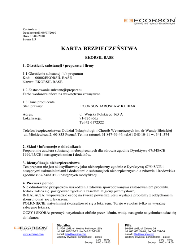 Kontrola nr 1 Data kontroli: 09/07/2010 Druk 10/09/2010 Strona 1/5 KARTA BEZPIECZEŃSTWA EKORSIL BASE 1. Określenie substancji / preparatu i firmy 1.1 Określenie substancji lub preparatu Kod: 00002EKORSIL BASE Nazwa: EKORSIL BASE 1.2 Zastosowanie substancji/preparatu Farba wodorozcieńczalna wewnętrzno zewnętrzna 1.3 Dane producenta Stan prawny: ECORSON JAROSŁAW KUBIAK Adres: Lokalizacja: ul. Wojska Polskiego 165 A 91-726 łódź Tel 42 6172322 Telefon bezpieczeństwa: Oddział Toksykologii i Chorób Wewnętrznych im. dr Wandy Błeńskiej ul. Mickiewicza 2, 60-833 Poznań Tel. na ratunek 61 847-69-46, tel.61 848-10-11 w. 341, 374 2. Skład / informacje o składnikach Preparat nie zawiera substancji niebezpiecznych dla zdrowia zgodnie Dyrektywą 67/548/CE 1999/45/CE i następnych zmian i dodatków. 3. Identyfikacja niebezpieczeństwa Ten preparat nie jest sklasyfikowany jako niebezpieczny zgodnie z Dyrektywą 67/548/CE i następnymi uaktualnieniami i dodatkami o substancjach niebezpiecznych dla zdrowia i środowiska zgodnie z 67/548/CEE i następnych modyfikacji. 4. Pierwsza pomoc. Nie odnotowano przypadków uszkodzenia zdrowia spowodowanymi zastosowaniem produktu. Jednak zaleca się postępować zgodnie z zasadami higieny przemysłowej. INHALACJA: wyprowadzić osobę na świeże powietrze, jeśli wystąpią problemy z oddychaniem skonsultować się z lekarzem. POŁKNIĘCIE: natychmiast skonsultować się z lekarzem. Torsje wywołać tylko na wyraźne zalecenie lekarza. OCZY i SKÓRA: przemyć natychmiast obficie przez 15min. wodą, następnie natychmiast udać się do lekarza. www.ecorson.com Siedziba: Filia: 91-726 Łódź, ul. Wojska Polskiego 165a tel. 042 617-23-22, fax 042 617-23-21 e-mail: [email protected] Godziny otwarcia: poniedziałek – piątek 7.00 – 18.00 Soboty 8.00 – 15.00 90-604 Łódź, ul. Zielona 34 tel. 042 632-24-01, fax 042 634-36 e-mail: [email protected] Godziny otwarcia: poniedziałek – piątek 9.00 – 18.00 Soboty 9.00 – 14.00 5. Środki przeciwpożarowe. INFORMACJE PODSTAWOWE Schłodzić pojemniki w celu uniknięcia rozkładu produktu i powstania szkodliwych substancji dla człowieka i bezpieczeństwa. Zawsze zakładać kompletne ubranie przeciwpożarowe. Schłodzić pojemniki w celu uniknięcia rozkładu produktu i powstania szkodliwych substancji dla człowieka i bezpieczeństwa. Zawsze zakładać kompletne ubranie przeciwpożarowe. ŚRODKI GAŚNICZE Stosować tradycyjne środki gaśnicze: piana, proszek gaśniczy, woda. Do zabezpieczenia rozlanych resztek produktu, które nie zostały jeszcze podpalone można zastosować rozpyloną wodę, w celu rozproszenia łatwopalnych oparów oraz do ochrony osób zajętych gaszeniem pożaru. ŚRODKI GAŚNICZE NIE WSKAZANE Nie ma. NIEBEZPIECZEŃSTWA JAKIE MOGĄ WYSTĄPIĆ W WYPADKU POŻARU Unikać wdychania produktów powstałych w wyniku pożaru (tlenków węgla, produktów toksycznych powstałych w procesie spalania, itp.) WYPOSAŻENIE Elementy ochronne z wizjerem, strój przeciwogniowy (kurtka i spodnie ogniochronne z dodatkową osłoną ramion, nóg) szczelna maska pokrywająca całą twarz ew z aparatem tlenowym w przypadku dużej ilości dymu. 6. Środki zapobiegawcze w przypadku rozlania. Otoczyć ziemią lub innym materiałem stałym. Zebrać większą część materiału i resztki usunąć wodą. 7. Mieszanie i magazynowanie. Zapewnić dostępność urządzeń do schłodzenia pojemników, aby uniknąć niebezpieczeństwa nadmiernego ciśnienia i przegrzania w przypadku wystąpienia pożaru w pobliżu. 8. Wielkości emisji Przestrzegać środków bezpieczeństwa stosowanych przy pracach z substancjami chemicznymi. OCHRONA DRÓG ODDECHOWYCH Nie wymagana OCHRONA OCZU Nie wymagana OCHRONA RĄK Nie wymagana OCHRONA SKÓRY Nie wymagana 9. Właściwości fizyczne i chemiczne Kolor Biały Stan fizyczny Ciecz Gęstość oparów Brak danych Rozcieńczalność Miesza się Lepkość Brak danych Szybkość parowania Brak danych Właściwości palne Brak danych pH. 8 - 8,80 www.ecorson.com Siedziba: Filia: 91-726 Łódź, ul. Wojska Polskiego 165a tel. 042 617-23-22, fax 042 617-23-21 e-mail: [email protected] Godziny otwarcia: poniedziałek – piątek 7.00 – 18.00 Soboty 8.00 – 15.00 90-604 Łódź, ul. Zielona 34 tel. 042 632-24-01, fax 042 634-36 e-mail: [email protected] Godziny otwarcia: poniedziałek – piątek 9.00 – 18.00 Soboty 9.00 – 14.00 Punkt wrzenia Punkt zapalny Właściwości wybuchowe Natężenie oparów Ciężar właściwy Zawartość ciał stałych VOC (Dyrektywa 2004/42/CE) : VOC (lotne zw. węgla): Brak danych >61oC Brak danych Brak danych 1,510 kg/litr 66,35% 2,48% - 36,0 g/litr preparatu 1,20% - 20,85 g/litr preparatu 10. Stabilność i zdolność reagowania Produkt stabilny w normalnych warunkach użytkowania i magazynowania. W przypadku rozkładu pod wpływem działania temperatury lub pożaru mogą się uwolnić opary potencjalnie szkodliwe dla zdrowia. 11. Informacje toksykologiczne Nie odnotowano przypadków uszkodzenia zdrowia spowodowanych działaniem produktu. Zaleca się w każdym wypadku przestrzegać zasad higieny przemysłowej. W przypadku osób szczególnie wrażliwych, produkt może wywołać lekkie efekty na zdrowiu podczas kontaktu, wdychania, wchłonięcia przez skórę, kontakt z oczami lub połknięcie. 12. Informacje ekologiczne Używać zgodnie z zasadami przeznaczenia, unikać rozprowadzenia produktu w środowisku. Poinformować odpowiednie służby jeżeli produkt przedostanie się do wody, do ścieku lub zanieczyścił glebę. 13. Uwagi na temat odpadów Puste pojemniki powinny być poddane recyklingowi jeśli to możliwe, zgodnie z instrukcją znajdującą się na nich. 14. Informacje na temat transportu Preparat nie stwarza zagrożenia w sensie istniejących przepisów w dziedzinie transportu dotyczących towarów niebezpiecznych na drodze (A.D.R.), na kolei (R.I.D.), na morzu (IMDG kod) i w powietrzu (IATA). 15. Informacje o normach. Symbole niebezpiec