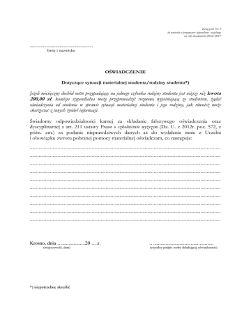 Załącznik Nr 2 do wniosku o przyznanie stypendium socjalnego na rok akademicki 2016/2017 ......................................................... Imię i nazwisko OŚWIADCZENIE Dotyczące sytuacji materialnej studenta/rodziny studenta*) Jeżeli miesięczny dochód netto przypadający na jednego członka rodziny studenta jest niższy niż kwota 200,00 zł, komisja stypendialna może przeprowadzić rozmowę wyjaśniającą ze studentem, żądać oświadczenia od studenta w sprawie sytuacji materialnej studenta i jego rodziny, jak również może skorzystać z innych źródeł informacji. Świadomy odpowiedzialności karnej za składanie fałszywego oświadczenia oraz dyscyplinarnej z art. 211 ustawy Prawo o szkolnictwie wyższym (Dz. U. z 2012r. poz. 572, z późn. zm.) za podanie nieprawdziwych danych aż do wydalenia mnie z Uczelni i obowiązku zwrotu pobranej pomocy materialnej oświadczam, co następuje: ....................................................................................................................................................... ....................................................................................................................................................... ....................................................................................................................................................... ....................................................................................................................................................... ....................................................................................................................................................... ....................................................................................................................................................... ....................................................................................................................................................... ....................................................................................................................................................... ....................................................................................................................................................... ....................................................................................................................................................... Krosno, dnia …..................20 ….r. (miejscowość, data) *) niepotrzebne skreślić …............................................... (czytelny podpis osoby składającej oświadczenie)