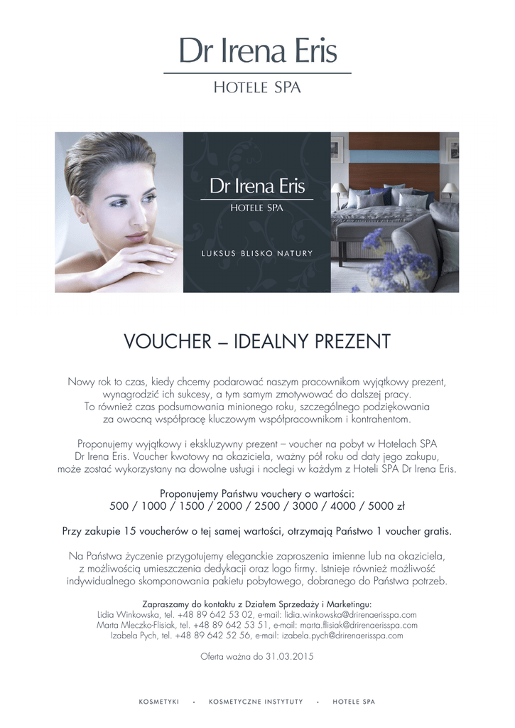 VOUCHER – IDEALNY PREZENT Nowy rok to czas, kiedy chcemy podarować naszym pracownikom wyjątkowy prezent, wynagrodzić ich sukcesy, a tym samym zmotywować do dalszej pracy. To również czas podsumowania minionego roku, szczególnego podziękowania za owocną współpracę kluczowym współpracownikom i kontrahentom. Proponujemy wyjątkowy i ekskluzywny prezent – voucher na pobyt w Hotelach SPA Dr Irena Eris. Voucher kwotowy na okaziciela, ważny pół roku od daty jego zakupu, może zostać wykorzystany na dowolne usługi i noclegi w każdym z Hoteli SPA Dr Irena Eris. Proponujemy Państwu vouchery o wartości: 500 / 1000 / 1500 / 2000 / 2500 / 3000 / 4000 / 5000 zł Przy zakupie 15 voucherów o tej samej wartości, otrzymają Państwo 1 voucher gratis. Na Państwa życzenie przygotujemy eleganckie zaproszenia imienne lub na okaziciela, z możliwością umieszczenia dedykacji oraz logo firmy. Istnieje również możliwość indywidualnego skomponowania pakietu pobytowego, dobranego do Państwa potrzeb. Zapraszamy do kontaktu z Działem Sprzedaży i Marketingu: Lidia Winkowska, tel. +48 89 642 53 02, e-mail: [email protected] Marta Mleczko-Flisiak, tel. +48 89 642 53 51, e-mail: [email protected] Izabela Pych, tel. +48 89 642 52 56, e-mail: [email protected] Oferta ważna do 31.03.2015