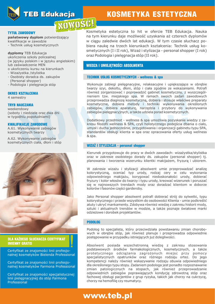 KOSMETYKA ESTETYCZNA TYTUŁ ZAWODOWY państwowy dyplom potwierdzający kwalifikacje w zawodzie - Technik usług kosmetycznych dyplomy TEB Edukacja ukończenia szkoły policealnej (w języku polskim i w języku angielskim) lub zaświadczenie MEN o ukończeniu kursu na kierunkach - Wizażystka /stylistka - Osobisty doradca ds. zakupów (Personal shopper) - Podologia i pielęgnacja stóp OKRES KSZTAŁCENIA 4 semestry TRYB NAUCZANIA weekendowy (soboty i niedziele oraz dwa dni w tygodniu popołudniami) KWALIFIKACJE ZAWODOWE A.61. Wykonywanie zabiegów kosmetycznych twarzy A.62. Wykonywanie zabiegów kosmetycznych ciała, dłoni i stóp Kosmetyka estetyczna to hit w ofercie TEB Edukacja. Nauka na tym kierunku daje możliwość uzyskania aż czterech dyplomów w ciągu zaledwie dwóch lat edukacji. W tym czasie słuchacz pobiera naukę na trzech kierunkach kształcenia: Technik usług kosmetycznych (I i II rok), Wizaż i stylizacja - personal shopper (I rok) oraz Podologia i pielęgnacja stóp (II rok). WIEDZA I UMIEJĘTNOŚCI ABSOLWENTA TECHNIK USŁUG KOSMETYCZNYCH - wellness & spa Wykonuje zabiegi pielęgnacyjne, relaksacyjne i upiększające w obrębie twarzy szyi, dekoltu, dłoni, stóp i ciała zgodnie ze wskazaniami. Potrafi również zorganizować i poprowadzić gabinet kosmetyczny, z wyszczególnieniem tzw. miejskiego spa. W ramach swoich zadań zawodowych przeprowadza diagnozę kosmetyczną, dobiera i stosuje właściwe preparaty kosmetyczne, dobiera metody i techniki wykonywania określonych zabiegów, dobiera aparaturę, narzędzia i przybory do wykonywania zabiegów pielęgnacyjnych, a także udziela porad kosmetycznych. Dodatkowy przedmiot - wellness & spa umożliwia pozyskanie wiedzy z zakresu filozofii wellness & SPA, czyli holistycznego podejścia dbania o ciało, umysł i ducha jednocześnie, przygotowania i organizacji gabinetu typu SPA, standardów obsługi klienta w spa oraz opracowania oferty usług wellness & spa. WIZAŻ I STYLIZACJA - personal shopper Kierunek przygotowuje do pracy w dwóch zawodach: wizażystka/stylistka oraz w zakresie osobistego dorady ds. zakupów (personal shopper) tj. planowania i tworzenia wizerunku klientki makijażem, fryzurą i ubiorem. W zakresie wizażu i stylizacji absolwent umie przeprowadzać analizę kolorystyczną, oceniać typ urody, rodzaj cery w celu wykonania odpowiedniego makijażu, korygować niedoskonałości urody, dobierać fryzury i kolor włosów do twarzy i typu urody, kreować wizerunek i poruszać się w najnowszych trendach mody oraz doradzać klientom w doborze kolorów i fasonów części garderoby. Jako Personal shopper absolwent potrafi dobierać strój do sylwetki, typu kolorystycznego i przede wszystkim do osobowości Klienta - umie podkreślić atuty i ukryć mankamenty. Zdobywa również wiedzę z zakresu historii mody, sztuki i aktualnych trendów w modzie, a także poznaje światowe marki odzieżowe i dorobek projektantów. PODOLOG DLA KAŻDEGO SŁUCHACZA CERTYFIKAT IMIENNY GRATIS Certyfikat ze znajomości linii profesjonalnej kosmetyków Bielenda Professional Certyfikat ze znajomości linii profesjonalnej kosmetyków Farmona Professional Certyfikat ze znajomości specjalistycznej linii pielęgnacyjnej do stóp Farmona Professional Podolog to specjalista, który przeciwdziała powstawaniu zmian chorobowych w obrębie stóp, jak również planuje i przeprowadza odpowiednie postępowanie w przypadku istniejących już dolegliwości. Absolwent posiada wszechstronną wiedzę z zakresu stosowania podstawowych środków farmakologicznych, kosmetycznych, a także protetycznego odciążania zagrożonych miejsc przy pomocy specjalistycznych opatrunków oraz różnego rodzaju ortez. Do jego kompetencji należy również wskazywanie rodzaju obuwia odpowiedniego dla określonego typu stopy. Zadaniem podologa jest ponadto rozpoznawanie zmian patologicznych na stopach, jak również przeprowadzanie odpowiednich zabiegów poprawiających kondycję zdrowotną stóp oraz fachowej obsługi pacjentów z grup ryzyka, takich jak chorzy na cukrzycę, chorzy na hemofilię czy reumatycy. www.teb.pl KOSMETYKA ESTETYCZNA PRZEDMIOTY KSZTAŁCENIA ZAWODOWEGO TECHNIK USŁUG KOSMETYCZNYCH - Kosmetyka pielęgnacyjna i upiększająca twarzy, szyi i dekoltu - Kosmetyka pielęgnacyjna i upiększająca dłoni, stóp i ciała - Zabiegi pielęgnacyjne i upiększające twarzy, szyi i dekoltu - Zabiegi pielęgnacyjne i upiększające dłoni, stóp i ciała - Wellness & SPA DODATKOWE KURSY - Przedłużanie i zagęszczanie rzęs – 7 godz. - Manicure hybrydowy – 5 godz. - Masaż gorącymi kamieniami – 10 godz. - Drenaż limfatyczny – 40 godz. - Masażu bańką chińską – 10 godz. - Przedłużanie i stylizacja paznokci – 20 godz. - Trwała na rzęsy – 5 godz. - Henna i regulacja brwi – pielęgnacja i korekta oprawy oka – 8 godz. - Podstawy anatomiczno-dermatologiczne w kosmetyce - Język angielski w kosmetyce WIZAŻ I STYLIZACJA - Podstawy kosmetyki - Podstawy makijażu - Psychologia zawodu z komunikacją interpersonalną PERSPEKTYWY ZATRUDNIENIA - gabinety kosmetyczne, salony urody - gabinety odnowy biologicznej, gabinety masażu - ośrodki SPA i Wellness, centra fitness - agencje modelek, agencje reklamowe, teatr – jako wizażysta - Elementy makijażu stylizowanego - firmy kosmetyczne jako przedstawiciele handlowi oraz szkoleniowcy, drogerie, sklepy kosmetyczne - Analiza kolorystyczna - sanatoria, domy opieki społecznej i hospicja - Stylizacja fryzur - placówki oświatowe (przyszkolne i międzyszkolne ośrodki gimnastyki korekcyjnej) - Stylizacja ubioru - Shopping - Kreowanie wizerunku - gabinety stopy cukrzycowej i trudno gojących się ran, gabinety podologiczne, gabinety pedicure - Makijaż w fotografii - przychodnie specjalistyczne, poradnie i gabinety rehabilitacyjne, gabinety terapii manualnej i usprawniania - Technika wykonania makijażu - pracownie zaopatrzenia ortopedycznego i ortotycznego - Przygotowanie do egzaminu czelad
