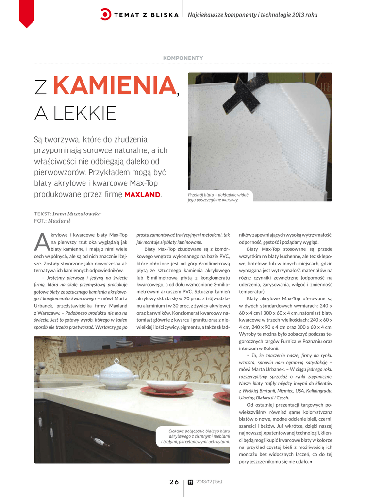 t e m at z b l i s k a Najciekawsze komponenty i technologie 2013 roku komponenty Z kamienia, a lekkie Są tworzywa, które do złudzenia przypominają surowce naturalne, a ich właściwości nie odbiegają daleko od pierwowzorów. Przykładem mogą być blaty akrylowe i kwarcowe Max-Top produkowane przez firmę Maxland. Przekrój blatu – dokładnie widać jego poszczególne warstwy. TEKST: Irena Muszałowska fot.: Maxland A krylowe i kwarcowe blaty Max-Top na pierwszy rzut oka wyglądają jak blaty kamienne, i mają z nimi wiele cech wspólnych, ale są od nich znacznie lżejsze. Zostały stworzone jako nowoczesna alternatywa ich kamiennych odpowiedników. – Jesteśmy pierwszą i jedyną na świecie firmą, która na skalę przemysłową produkuje gotowe blaty ze sztucznego kamienia akrylowego i konglomeratu kwarcowego – mówi Marta Urbanek, przedstawicielka firmy Maxland z Warszawy. – Podobnego produktu nie ma na świecie. Jest to gotowy wyrób, którego w żaden sposób nie trzeba przetwarzać. Wystarczy go po prostu zamontować tradycyjnymi metodami, tak jak montuje się blaty laminowane. Blaty Max-Top zbudowane są z komórkowego wnętrza wykonanego na bazie PVC, które obłożone jest od góry 6-milimetrową płytą ze sztucznego kamienia akrylowego lub 8-milimetrową płytą z konglomeratu kwarcowego, a od dołu wzmocnione 3-miliometrowym arkuszem PVC. Sztuczny kamień akrylowy składa się w 70 proc. z trójwodzianu aluminium i w 30 proc. z żywicy akrylowej oraz barwników. Konglomerat kwarcowy natomiast głównie z kwarcu i granitu oraz z niewielkiej ilości żywicy, pigmentu, a także skład- Ciekawe połączenie białego blatu akrylowego z ciemnymi meblami i białymi, porcelanowymi uchwytami. 26 2013/12 (156) ników zapewniających wysoką wytrzymałość, odporność, gęstość i pożądany wygląd. Blaty Max-Top stosowane są przede wszystkim na blaty kuchenne, ale też sklepowe, hotelowe lub w innych miejscach, gdzie wymagana jest wytrzymałość materiałów na różne czynniki zewnętrzne (odporność na uderzenia, zarysowania, wilgoć i zmienność temperatur). Blaty akrylowe Max-Top oferowane są w dwóch standardowych wymiarach: 240 x 60 x 4 cm i 300 x 60 x 4 cm, natomiast blaty kwarcowe w trzech wielkościach: 240 x 60 x 4 cm, 240 x 90 x 4 cm oraz 300 x 60 x 4 cm. Wyroby te można było zobaczyć podczas tegorocznych targów Furnica w Poznaniu oraz interzum w Kolonii. – To, że znaczenie naszej firmy na rynku wzrasta, sprawia nam ogromną satysfakcję – mówi Marta Urbanek. – W ciągu jednego roku rozszerzyliśmy sprzedaż o rynki zagraniczne. Nasze blaty trafiły między innymi do klientów z Wielkiej Brytanii, Niemiec, USA, Kaliningradu, Ukrainy, Białorusi i Czech. Od ostatniej prezentacji targowych powiększyliśmy również gamę kolorystyczną blatów o nowe, modne odcienie bieli, czerni, szarości i beżów. Już wkrótce, dzięki naszej najnowszej, opatentowanej technologii, klienci będą mogli kupić kwarcowe blaty w kolorze na przykład czystej bieli z możliwością ich montażu bez widocznych łączeń, co do tej pory jeszcze nikomu się nie udało. •