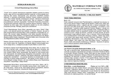 INTENCJA MI NA MAJ 2012 O triumf Niepokalanego Serca Maryi MATERIAŁY FORMACYJNE DLA WSPÓLNOT RYCERSTWA NIEPOKALANEJ MAJ 2012 „Triumf” był w czasach starożytnych pogańskim świętem powrotu do stolicy wodza i jego armii po zwycięskiej kampanii wojennej, w której zginęło przynajmniej pięć tysięcy nieprzyjaciół, przy stosukowo niewielkich stratach własnych, a wyprawa przysporzyła imperium nowych zdobyczy terytorialnych. Ulice miasta falowały wiwatującymi tłumami. Żołnierze maszerowali miarowym krokiem. Na czele kroczył wódz. Stał na rydwanie z czołem przyozdobionym wieńcem zwycięstwa. Triumfował! Przecudna uroczystość. Jej absolutnie podniosły nastrój psuł wodzowi jedynie niewolnik, stojący na rydwanie tuż obok niego, który nieustannie szeptał mu do ucha urzędowo przepisaną formułę: Pamiętaj, jesteś tylko człowiekiem! Triumf Niepokalanego Serca Maryi zapowiada ona sama. Kiedy? Większość z nas odpowie pewnie bez wahania: w Fatimie. Owszem, ale jest to tylko przypomnienie proroctwa Maryi, które znajdujemy w Ewangelii św. Łukasza: Oto bowiem odtąd błogosławić mnie będą wszystkie pokolenia śpiewa Maryja wobec Elżbiety. A wcześniej anioł powiedział do niej: Błogosławiona jesteś między niewiastami. Również Matka Jana Chrzciciela mówi Jej: Błogosławiona jesteś, któraś uwierzyła. Właśnie Ojcowie Kościoła łącząc wiarę Maryi i jej Niepokalane Serce, mówią, choćby ustami św. Augustyna, że Maryja najpierw wiarą przyjęła Jezusa do swego serca, a następnie poczęła Go jako Matka w swoim łonie. TEMAT: KOŚCIÓŁ O OBLICZU MARYI TEKST PISMA ŚWIĘTEGO: Dz 2, 1-11 Kiedy nadszedł wreszcie dzień Pięćdziesiątnicy, znajdowali się wszyscy razem na tym samym miejscu. Nagle dał się słyszeć z nieba szum, jakby uderzenie gwałtownego wichru, i napełnił cały dom, w którym przebywali. Ukazały się im też jakby języki ognia, które się rozdzielały, i na każdym z nich spoczął jeden. I wszyscy zostali napełnieni Duchem Świętym, i zaczęli mówić obcymi językami, tak jak im Duch pozwalał mówić. Przebywali wtedy w Jeruzalem pobożni Żydzi ze wszystkich narodów pod słońcem. Kiedy więc powstał ów szum, zbiegli się tłumnie i zdumieli, bo każdy słyszał, jak tamci przemawiali w jego własnym języku. Czyż ci wszyscy, którzy przemawiają, nie są Galilejczykami? mówili pełni zdumienia i podziwu. Jakżeż więc każdy z nas słyszy swój własny język ojczysty? Partowie i Medowie, i Elamici, i mieszkańcy Mezopotamii, Judei oraz Kapadocji, Pontu i Azji, Frygii oraz Pamfilii, Egiptu i tych części Libii, które leżą blisko Cyreny, i przybysze z Rzymu, Żydzi oraz prozelici, Kreteńczycy i Arabowie – słyszymy ich głoszących w naszych językach wielkie dzieła Boże. NAUCZANIE KOŚCIOŁA Przedziwny będzie triumf Niepokalanego Serca Maryi. Nie na ulicach miasta, ale w sercach ludzi. Ludzie nie będą wznosić głośnych okrzyków, ale bez reszty przylgną do Serca Matki, a przez Nie zanurzą się w nieskończonym oceanie miłości Serca Jezusowego. Nie będzie to czas liczenia pobitych nieprzyjaciół, ale ostatecznego zwycięstwa nad grzechem, starcia głowy starodawnemu wężowi - szatanowi. Nie będzie niewolnika, szepczącego „jesteś tylko człowiekiem” - bo przecież Dziewica ma świadomość, że „wejrzał Bóg na pokorę swojej służebnicy”. Nie będzie to pora radości ze zdobycia jakiegoś nowego obszaru, ale czas oddania Bogu przez Niepokalaną wszystkich i wszystkiego, całego świata. Niepokalane Serce Maryi, zacznij swój triumf w moim sercu. Niech - jak Ty rozważam i zachowuję w nim wszystkie sprawy Boże, niech będzie ono jak Twoje serce - wolne od zła, niech będzie godnym przybytkiem, tabernakulum, namiotem spotkania, mieszkaniem Boga samego. Centrum św. Maksymiliana, Harmęże, ul. Franciszkańska 12, 32-600 Oświęcim www.harmeze.franciszkanie.pl; e-mail: [email protected] Jan Paweł II, Encyklika Redemptoris Mater, nr 24 Tak więc w ekonomii łaski, sprawowanej pod działaniem Ducha Świętego, zachodzi szczególna odpowiedniość pomiędzy momentem Wcielenia Słowa a momentem narodzin Kościoła. Osobą, która łączy te dwa momenty, jest Maryja: Maryja w Nazarecie i Maryja w Wieczerniku Zielonych Świąt. W obu wypadkach Jej obecność w sposób dyskretny, a równocześnie wymowny, ukazuje drogę „narodzin z Ducha”. W ten sposób Maryja, obecna w tajemnicy Chrystusa jako Matka, staje się, z woli Syna i za sprawą Ducha Świętego, obecna w tajemnicy Kościoła. Z PISM ŚWIĘTEGO MAKSYMILIANA: Wola Boża – a wola Niepokalanej Pisma, cz. 2, nr 1147, s. 636 Niepokalana jest tylko dziełem Bożym i jak każde dzieło jest bez porównania niższa i całkowicie zależna od swego Stwórcy. Ale jest Ona zarazem dziełem najdoskonalszym i najświętszym, bo jak twierdzi św. Bonawentura: „Bóg może stworzyć większy świat i doskonalszy, ale nie może wynieść stworzenia do większej godności, niż wyniósł Maryję". WYJAŚNIENIE TEKSTÓW: ROZWAŻANIE: Owoce Zesłania Ducha Świętego W ostatnim numerze Materiałów Formacyjnych rozważaliśmy skutki Zesłania Ducha Świętego na Apostołów. Wskazaliśmy na dwa bardzo konkretne: dar męstwa (odwagi) w głoszeniu prawdy o Zmartwychwstaniu oraz dar modlitwy (mówienia językami). Kolejnym skutkiem zesłania Ducha Świętego, którym chcemy się zająć w dzisiejszych rozważaniach, są narodziny Kościoła i objawienie się Kościoła światu. Według Ewangelisty Łukasza, autora Dziejów Apostolskich, Kościół jest najważniejszym owocem Zesłania Ducha Świętego i przepowiadania Apostoła Piotra. Cechy pierwotnej wspólnoty Łukasz w Dziejach Apostolskich nie poprzestaje na opisie narodzin Kościoła. Sporo miejsca poświęca życiu pierwszej wspólnoty uczniów. Przede wszystkim uwypukla misyjny charakter pierwszego Kościoła. Apostołowie głoszą Jezusa Zmartwychwstałego zarówno Ż