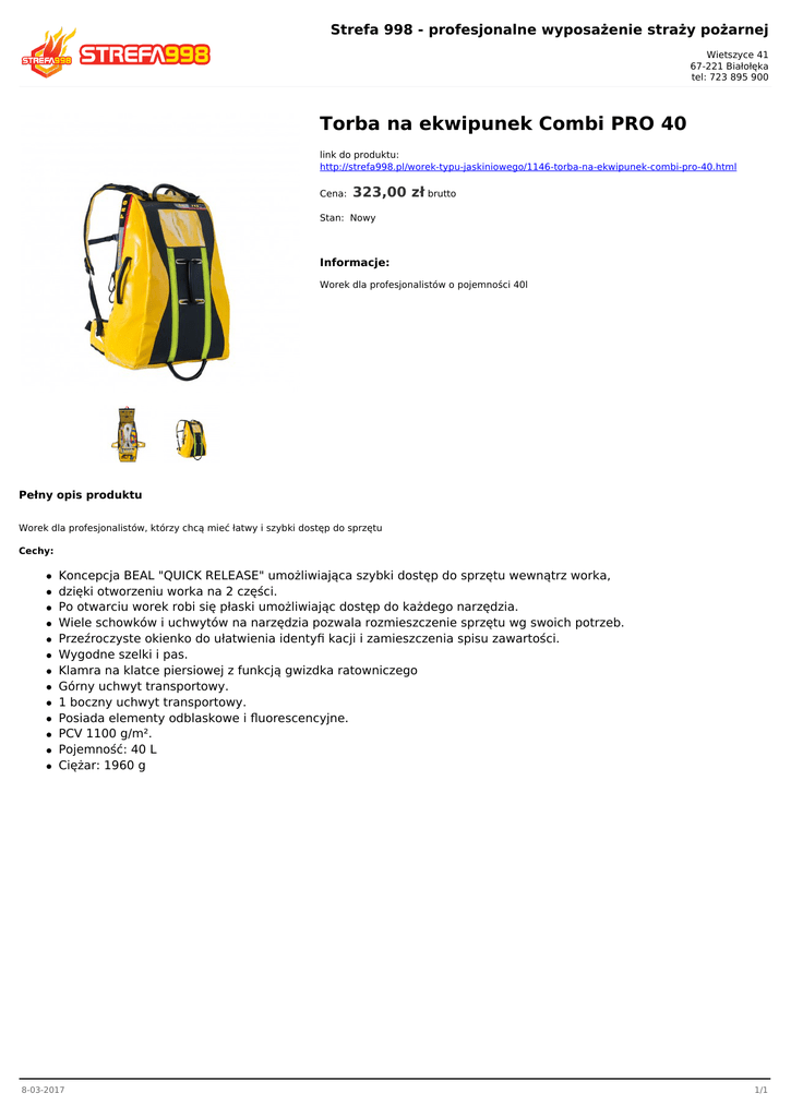 Strefa 998 - profesjonalne wyposażenie straży pożarnej Wietszyce 41 67-221 Białołęka tel: 723 895 900 Torba na ekwipunek Combi PRO 40 link do produktu: http://strefa998.pl/worek-typu-jaskiniowego/1146-torba-na-ekwipunek-combi-pro-40.html Cena: 323,00 zł brutto Stan: Nowy Informacje: Worek dla profesjonalistów o pojemności 40l Pełny opis produktu Worek dla profesjonalistów, którzy chcą mieć łatwy i szybki dostęp do sprzętu Cechy: Koncepcja BEAL "QUICK RELEASE" umożliwiająca szybki dostęp do sprzętu wewnątrz worka, dzięki otworzeniu worka na 2 części. Po otwarciu worek robi się płaski umożliwiając dostęp do każdego narzędzia. Wiele schowków i uchwytów na narzędzia pozwala rozmieszczenie sprzętu wg swoich potrzeb. Przeźroczyste okienko do ułatwienia identyfi kacji i zamieszczenia spisu zawartości. Wygodne szelki i pas. Klamra na klatce piersiowej z funkcją gwizdka ratowniczego Górny uchwyt transportowy. 1 boczny uchwyt transportowy. Posiada elementy odblaskowe i fluorescencyjne. PCV 1100 g/m². Pojemność: 40 L Ciężar: 1960 g 8-03-2017 1/1
