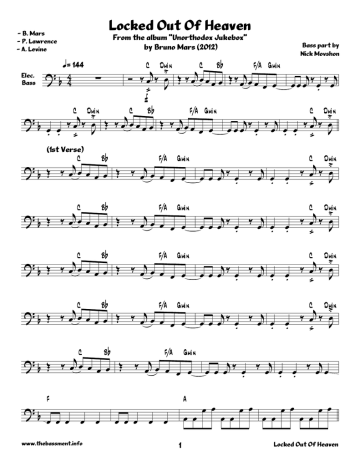 Locked Out Of Heaven - B. Mars - P. Lawrence - A. Levine From the album "Unorthodox Jukebox" by Bruno Mars (2012) ? b 44 ã 144 Elec. Bass C ∑ D min C D min Bb C f Bb C F/A G min j j ?b ‰ œ ‰ œ̆ Œ ‰ œ œ œ œ œ Œ ‰ œj œ œ œ. œ. fl J œ œ C Bb F/A G min C Bb F/A G min C Bb F/A G min (1st Verse) F/A G min Ó ‰ œj ‰ œ̆ Œ ‰ œj œ œ œ œ Œ ‰ œj œ œ œ œ fl J ? b Œ ‰ œj œ œ œ Œ ‰ j œ œ œ œ œ œ ? b Œ ‰ œj œ œ œ Œ ‰ j œ œ œ œ œ œ ? b Œ ‰ œj œ œ j œ œ Œ ‰ œ œ œ œ œ b Bass part by Nick Movshon j ‰ j œ œ œ ‰ œ. œ C D min C D min C D min C D min j j‰ ‰ j ‰ œ ‰ œ̆ œ œ œ œ. œ œ. œ. fl J j j‰ j ‰ ‰ ‰ œ̆ œ œ œ œ œ. œ œ. œ. fl J j j‰ j ‰ ‰ ‰ œ̆ œ œ œ œ œ. œ œ. œ. fl J j j‰ j ‰ ‰ ‰ œ̆ œ œ œ œ œ. œ œ. œ. fl J C B F/A G min C D min j j œ̆ ?b Œ ‰ œ œ œ œ Œ ‰ j j‰ j ‰ ‰ ‰ œ œ œ œ œ œ œ œ œ œ œ. œ œ. œ. fl J C Bb ? b Œ ‰ œj œ œ œ œ Œ ?b F œ œ œ œ œ www.thebassment.info G min F/A ‰ œj œ œ œ œ œ œ œ A œ œ œ œ 1 j j j œ œ œ ‰ œ. ‰ œ œ. œ. ‰ œ œ œ œ œ œ œ œ œ œ œ œ œ œ œ œ Locked Out Of Heaven Locked Out Of Heaven (Chorus) Bb ? b .. œ œ œ œ œ œ œ œ ?b œ œ œ œ œ œ œ œ C œ œ œ œ œ œ œ œ F œ œ œ œ œ œ œ œ C G min œ œ œ œ œ œ œ œ œ œ œ œ œ œ œ œ C D min ? b œ œ œ œ œ œ œ œ œ œ œ œ œ œ œ œ .. œ œ œ œ œ œ œ œ œ œ œ œ œ œ ‰ œ̆ fl J 1. 2. b C B F/A G min C D min j ‰ œ̆ ? b Œ ‰ œj œ œ j j j Œ ‰ ‰ ‰ ‰ œ œ œ œ œ œ œ œ œ œ œ œ. œ œ. œ. fl J Bb F/A G min C Bb F/A G min C Bb F/A G min C Bb F/A G min C Bb F/A G min C ? b Œ ‰ œj œ œ j œ œ Œ ‰ œ œ œ œ œ (2nd Verse) ? b Œ ‰ œj œ œ j œ œ Œ ‰ œ œ œ œ œ ? b Œ ‰ œj œ œ j œ œ Œ ‰ œ œ œ œ œ ? Œ ‰ œj œ œ j b œ œ Œ ‰ œ œ œ œ œ ? b Œ ‰ œj œ œ œ Œ ‰ j œ œ œ œ œ œ www.thebassment.info 2 C D min C D min C D min C D min C D min j j‰ j ‰ ‰ ‰ œ̆ œ œ œ œ œ. œ œ. œ. fl J j j‰ j ‰ ‰ ‰ œ̆ œ œ œ œ œ. œ œ. œ. fl J j‰ ‰ j ‰ œj ‰ œ̆ œ œ œ œ. œ œ. œ. fl J j j‰ j ‰ ‰ ‰ œ̆ œ œ œ œ œ. œ œ. œ. fl J j‰ ‰ j ‰ œj ‰ œ̆ œ œ œ œ. œ œ. œ. fl J Locked Out Of Heaven C Locked Out Of Heaven Bb ? b Œ ‰ œj œ œ œ Œ œ F ?b œ œ œ œ œ Bb (Chorus) ‰ œj œ œ œ œ œ œ œ ? b .. œ œ œ œ œ œ œ œ ?b œ œ œ œ œ œ œ œ C G min F/A j j j œ œ œ ‰ œ. ‰ œ œ. œ. ‰ œ œ A œ œ œ œ œ œ œ œ œ œ œ œ œ œ œ œ œ œ G min œ œ œ œ œ œ œ œ œ œ œ œ œ œ F œ œ œ œ œ œ œ œ œ œ œ œ œ œ œ œ C ? b œ œ œ œ œ œ œ œ œ œ œ œ œ œ œ œ .. œ œ œ œ œ œ œ œ ˙ 1. 2. C œ œ .. Ó C ? b œ œ œ œ œ œ œ œ œ œ œ œ œ œ œ œ .. œ œ œ œ œ œ œ œ œ œ œ œ œ œ œ œ 3. 4. Bb (Bridge) ? b .. w w C ?b w 1. (Outro) G min C Bb C Bb w C .. w 2. w F/A G min F/A G min ? b Œ ‰ œj œ œ j œ œ Œ ‰ œ œ œ œ œ ? b Œ ‰ œj œ œ j œ œ Œ ‰ œ œ œ œ œ www.thebassment.info 3 F w w ˙ C w D min œ œ ‰ œ̆J fl C D min j‰ ‰ j ‰ œj ‰ œ̆ œ œ œ œ. œ œ. œ. fl J C D min j j‰ j ‰ ‰ ‰ œ̆ œ œ œ œ œ. œ œ. œ. fl J Locked Out Of Heaven