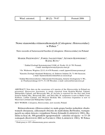 Wiad. entomol. 25 (2): 79-87 Poznań 2006 Nowe stanowiska różnorożkowatych (Coleoptera: Heteroceridae) w Polsce * New records of heterocerid beetles (Coleoptera: Heteroceridae) in Poland MAREK PRZEWOŹNY 1, PAWEŁ JAŁOSZYŃSKI 2, SZYMON KONWERSKI 3, RAFAŁ RUTA 4 1 4 Zakład Zoologii Systematycznej UAM, ul. Fredry 10, 61-701 Poznań; e-mail: [email protected] 2 Os. Wichrowe Wzgórze 22/13, 61-678 Poznań; e-mail: [email protected] 3 Katedra Zoologii Akademii Rolniczej, ul. Doktora Judyma 20, 71-466 Szczecin; e-mail: [email protected] Zakład Bioróżnorodności i Taksonomii Ewolucyjnej, Instytut Zoologiczny U.Wr., ul. Przybyszewskiego 63/77, 51-148 Wrocław; e-mail: [email protected] ABSTRACT: New data on the occurrence of 6 species of the Heteroceridae in Poland are presented. Heterocerus fenestratus is newly reported from Kraków-Wieluń Upland, Małopolska Upland, and Bieszczady Mts. H. fusculus is reported for the first time from Eastern Sudety Mts., Bieszczady Mts., and Tatra Mts. H. marginatus is new to Baltic Coast, Podlasie, Lublin Upland, and Western Beskidy Mts. Littorimus hispidulus is new to Mazovian Lowland and Małopolska Upland. KEY WORDS: Coleoptera, Heteroceridae, new records, Poland. Różnorożkowate (Heteroceridae) to mała grupa bardzo jednolicie zbudowanych chrząszczy, zaliczanych obecnie do nadrodziny Byrrhoidea, występujących na całym świecie z wyjątkiem Nowej Zelandii (LAWRENCE 1981). Rodzina ta liczy ok. 300 gatunków zgrupowanych – zależnie od ujęcia – w 15–20 rodzajach (KATOVICH 2002 za PACHECO 1964; LAWRENCE 1981). W Polsce * Druk pracy w 10% sfinansowany przez autorów. 80 M. PRZEWOŹNY, P. JAŁOSZYŃSKI, SZ. KONWERSKI, R. RUTA znaleziono dotychczas 11 gatunków Heteroceridae należących do dwóch rodzajów: Heterocerus FABRICIUS, 1972 i Littorimus GOZIS, 1885. Różnią się one układem submetakoksalnych rys strydulacyjnych, które u Heterocerus rozwinięte są tylko po bokach pierwszego sternitu odwłoka, podczas gdy u Littorimus są one widoczne również w części środkowej. Zarówno larwy, jak i imagines omawianej rodziny należą do grupy ekologicznej organizmów litoralnych (zamieszkujących wszelkiego rodzaju brzegi wód) czy też ripikoli; to drugie pojęcie bywa stosowane w węższym znaczeniu, obejmując tylko organizmy związane z wodami śródlądowymi (JÄCH 1998). Heteroceridae spędzają większość czasu w tunelach drążonych w wilgotnej glebie czy mule w bezpośredniej bliskości wody. Tunele te mogą pełnić różne funkcje; KAUFMANN i STANSLY (1979) (cyt. za KATOVICH 2002) wyróżnili u północnoamerykańskiego gatunku Neoheterocerus pallidus (SAY) cztery ich rodzaje – służące odżywianiu się, hibernacji, składaniu jaj i przepoczwarczeniu. Chrząszcze te odżywiają się glonami, planktonem i szczątkami organicznymi (SILVEY 1935 za KATOVICH 2002). Zbieranie różnorożkowatych nie nastręcza większych trudności, są one stosunkowo pospolite i łatwe do napotkania we właściwych im biotopach, ponadto imagines doskonale latają i bywają w wielkich ilościach wabione do światła. Metodą często stosowaną przez autorów jest wydeptywanie błotnistych brzegów zbiorników wodnych; w krótkim czasie chrząszcze wychodzą na powierzchnię z uszkodzonych tuneli. Rodzina ta nie cieszyła się dotychczas dużym zainteresowaniem krajowych badaczy, stąd informacji o niej w polskiej literaturze jest niewiele, a dane faunistyczne wymagają aktualizacji. Wszystkie starsze dane podsumowano w „Katalogu fauny Polski” (BURAKOWSKI i in. 1983). W późniejszym czasie PAWŁOWSKI i współautorzy (1994) podali 3 gatunki z Wyżyny Krakowsko-Wieluńskiej (na podstawie okazów poławianych w latach sześćdziesiątych ubiegłego wieku), MAJEWSKI (1994) wykazał 3 gatunki z Niziny Mazowieckiej, Pojezierza Mazurskiego i Puszczy Białowieskiej (na podstawie okazów odłowionych blisko 30 lat wcześniej), a KUBISZ i SZWAŁKO (1991) oraz KUBISZ (1993) odnotowali obecność 4 gatunków na terenie Puszczy Białowieskiej i Pojezierza Pomorskiego. Ostatnio GUTOWSKI i RUTA (2004) wykazali dwa gatunki z Pojezierza Pomorskiego. Poniżej podejmujemy próbę uzupełnienia fragmentarycznej wiedzy o rozmieszczeniu Heteroceridae na terenach Polski podając, na podstawie bogatego materiału liczącego ponad 1400 okazów, nowe stanowiska 6 gatunków. Dziękujemy Edwardowi BARANIAKOWI, Pawłowi BUCZYŃSKIEMU, Markowi BUNALSKIEMU, Radomirowi JASKULE, Maciejowi KAŹMIERCZAKOWI, Wojciechowi KOWALIKOWI, Wojciechowi KUBASIKOWI, Danielowi KUBI- NOWE STANOWISKA RÓŻNOROŻKOWATYCH W POLSCE 81 SZOWI, Andrzejowi LASONIOWI, Wojciechowi MICHALSKIEMU , Markowi M IŁKOWSKIEMU , Mariuszowi MLECZAKOWI , Januszowi N OWACKIEMU , Edycie SERAFIN, Janowi SIEKIERSKIEMU, Pawłowi SIENKIEWICZOWI, Urszuli WALCZAK i Markowi WANATOWI za przekazanie okazów lub udostępnienie danych wykorzystanych w niniejszej pracy. O ile nie zaznaczono inaczej, materiał dowodowy znajduje się w kolekcjach autorów. W pracy zastosowano następujące skróty: AL – A. LASOŃ, DK – D. KUBISZ, EB – E. BARANIAK, ES – E. SERAFIN, JN – J. NOWACKI, JS – J. SIEKIERSKI, MB – M. BUNALSKI, MK – M. KAŹMIERCZAK, MM – M. MIŁKOWSKI , MMl – M. M LECZAK, MP – M. PRZEWOŹNY , MW – M. WANAT, PB – P. BUCZYŃSKI, PJ – P. JAŁOSZYŃSKI, PS – P. SIENKIEWICZ, RJ – R. JASKUŁA; RR – R. RUTA, SK – Sz. KONWERSKI, UW – U. WALCZAK, WK – W. KUBASIK, WKo – W. KOWALIK, WM – W. MICHALSKI, ad luc. – ad lucem (do światła), no – płeć nie określana. Heterocerus fenestratus (THUNBERG, 1784) – Pobrzeże Bałtyku: Wyspa Wolin, Międzywodzie (UTM: VV88), 5 VII 1991 – 9 exx. (1%, 8&& ), ad luc., leg. MB; Mierzeja Wiślana, Piaski (DF03), 7–14 VII 1992 – 49 exx. (19%%, 30&&), 22–26 VII 1992 – 50 exx. (14%%, 36&& ), samołówka świetlna na wydmie, leg. MB; Kołobrzeg (WA30), 9 VIII 2005 – 3 exx. (no), na brzegu rz. Parsęty przy wysiękach słonych wód, 