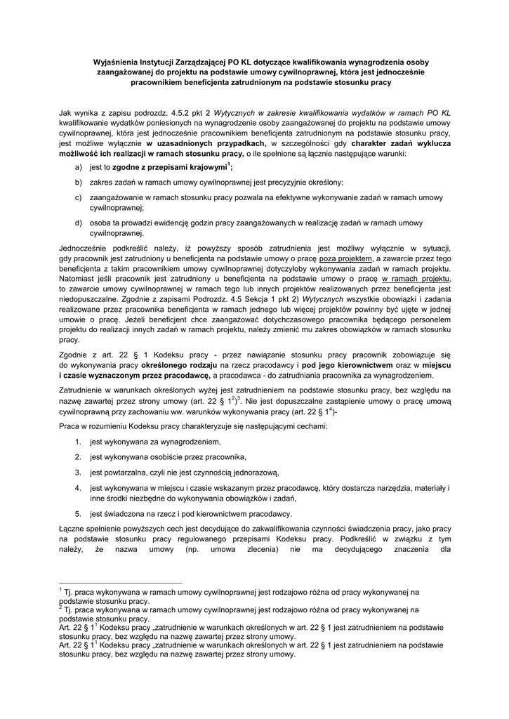 Wyjaśnienia Instytucji Zarządzającej PO KL dotyczące kwalifikowania wynagrodzenia osoby zaangażowanej do projektu na podstawie umowy cywilnoprawnej, która jest jednocześnie pracownikiem beneficjenta zatrudnionym na podstawie stosunku pracy Jak wynika z zapisu podrozdz. 4.5.2 pkt 2 Wytycznych w zakresie kwalifikowania wydatków w ramach PO KL kwalifikowanie wydatków poniesionych na wynagrodzenie osoby zaangażowanej do projektu na podstawie umowy cywilnoprawnej, która jest jednocześnie pracownikiem beneficjenta zatrudnionym na podstawie stosunku pracy, jest możliwe wyłącznie w uzasadnionych przypadkach, w szczególności gdy charakter zadań wyklucza możliwość ich realizacji w ramach stosunku pracy, o ile spełnione są łącznie następujące warunki: 1 a) jest to zgodne z przepisami krajowymi ; b) zakres zadań w ramach umowy cywilnoprawnej jest precyzyjnie określony; c) zaangażowanie w ramach stosunku pracy pozwala na efektywne wykonywanie zadań w ramach umowy cywilnoprawnej; d) osoba ta prowadzi ewidencję godzin pracy zaangażowanych w realizację zadań w ramach umowy cywilnoprawnej. Jednocześnie podkreślić należy, iż powyższy sposób zatrudnienia jest możliwy wyłącznie w sytuacji, gdy pracownik jest zatrudniony u beneficjenta na podstawie umowy o pracę poza projektem, a zawarcie przez tego beneficjenta z takim pracownikiem umowy cywilnoprawnej dotyczyłoby wykonywania zadań w ramach projektu. Natomiast jeśli pracownik jest zatrudniony u beneficjenta na podstawie umowy o pracę w ramach projektu, to zawarcie umowy cywilnoprawnej w ramach tego lub innych projektów realizowanych przez beneficjenta jest niedopuszczalne. Zgodnie z zapisami Podrozdz. 4.5 Sekcja 1 pkt 2) Wytycznych wszystkie obowiązki i zadania realizowane przez pracownika beneficjenta w ramach jednego lub więcej projektów powinny być ujęte w jednej umowie o pracę. Jeżeli beneficjent chce zaangażować dotychczasowego pracownika będącego personelem projektu do realizacji innych zadań w ramach projektu, należy zmienić mu zakres obowiązków w ramach stosunku pracy. Zgodnie z art. 22 § 1 Kodeksu pracy - przez nawiązanie stosunku pracy pracownik zobowiązuje się do wykonywania pracy określonego rodzaju na rzecz pracodawcy i pod jego kierownictwem oraz w miejscu i czasie wyznaczonym przez pracodawcę, a pracodawca - do zatrudniania pracownika za wynagrodzeniem. Zatrudnienie w warunkach określonych wyżej jest zatrudnieniem na podstawie stosunku pracy, bez względu na 2 3 nazwę zawartej przez strony umowy (art. 22 § 1 ) . Nie jest dopuszczalne zastąpienie umowy o pracę umową 4 cywilnoprawną przy zachowaniu ww. warunków wykonywania pracy (art. 22 § 1 )Praca w rozumieniu Kodeksu pracy charakteryzuje się następującymi cechami: 1. jest wykonywana za wynagrodzeniem, 2. jest wykonywana osobiście przez pracownika, 3. jest powtarzalna, czyli nie jest czynnością jednorazową, 4. jest wykonywana w miejscu i czasie wskazanym przez pracodawcę, który dostarcza narzędzia, materiały i inne środki niezbędne do wykonywania obowiązków i zadań, 5. jest świadczona na rzecz i pod kierownictwem pracodawcy. Łączne spełnienie powyższych cech jest decydujące do zakwalifikowania czynności świadczenia pracy, jako pracy na podstawie stosunku pracy regulowanego przepisami Kodeksu pracy. Podkreślić w związku z tym należy, że nazwa umowy (np. umowa zlecenia) nie ma decydującego znaczenia dla 1 Tj. praca wykonywana w ramach umowy cywilnoprawnej jest rodzajowo różna od pracy wykonywanej na podstawie stosunku pracy. 2 Tj. praca wykonywana w ramach umowy cywilnoprawnej jest rodzajowo różna od pracy wykonywanej na podstawie stosunku pracy. 1 Art. 22 § 1 Kodeksu pracy „zatrudnienie w warunkach określonych w art. 22 § 1 jest zatrudnieniem na podstawie stosunku pracy, bez względu na nazwę zawartej przez strony umowy. 1 Art. 22 § 1 Kodeksu pracy „zatrudnienie w warunkach określonych w art. 22 § 1 jest zatrudnieniem na podstawie stosunku pracy, bez względu na nazwę zawartej przez strony umowy. oceny, czy jest to umowa cywilnoprawna, czy też umowa o pracę. Zawsze należy uznać, że kreuje ona stosunek pracy, jeśli praca jest wykonywana w warunkach określonych powyżej. Pracownik zatrudniony na podstawie umowy o pracę jest zobowiązany do wykonywania pracy określonego rodzaju. Wobec powyższego dla oceny kwalifikowalności wydatków osoby stanowiącej personel projektu zatrudnionej na warunkach określonych w podrozdz. 4.5.2 pkt 2 Wytycznych znaczenie ma ustalenie w szczególności: 1. jaki rodzaj pracy jest wykonywany w ramach umowy o pracę i w ramach umowy cywilnoprawnej, przy czym należy wziąć pod uwagę w szczególności cel istnienia danego stanowiska pracy oraz rodzaj usług świadczonych przez beneficjenta oraz 2. czy w ramach umowy cywilnoprawnej występuje element podporządkowania osoby stanowiącej personel projektu wobec beneficjenta. Określenie rodzaju pracy jest niezbędnym elementem umowy o pracę. Rodzaj pracy musi być określony w akcie będącym podstawą stosunku pracy. Rodzaj pracy oznacza zespół (typ) czynności, składających się na umówioną pracę, które będą należały do obowiązków pracownika. Rodzaj pracy, jako składnik przedmiotowo istotny, powinien być wskazany w sposób niebudzący wątpliwości poprzez wymienienie konkretnych czynności, do wykonywania których pracownik jest zobowiązany, bądź poprzez określenie pracy wchodzącej w zakres danego zawodu lub funkcji. Nie jest wystarczające wskazanie jako rodzaju pracy ogólnie jakiegoś zawodu. Jednocześnie w akcie będącym podstawą powstania stosunku pracy można określić więcej niż jeden rodzaj pracy. W razie wykonywania na rzecz tego samego pracodawcy kilku rodzajów pracy podporządkowanej należy domniemywać, że strony łączy jeden stosunek pracy (tak: Sąd Najwyższy w wyroku z dnia 14 lutego 2002 r., I PKN 876/00 (OSNP 2004, nr 4, poz. 60). G