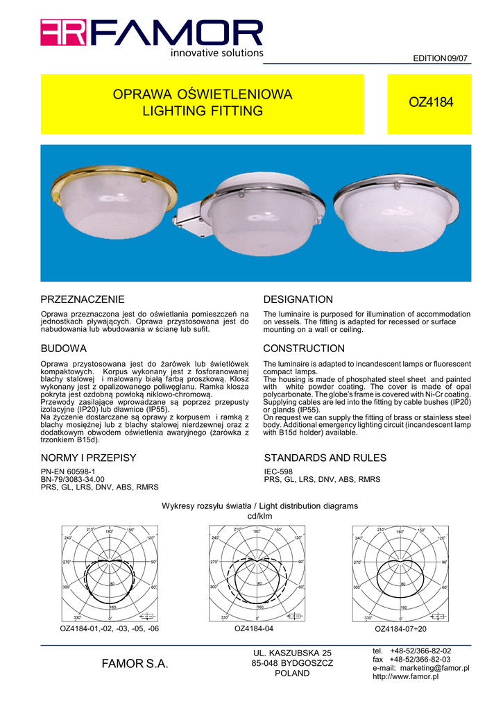 EDITION 09/07 OPRAWA OŚWIETLENIOWA LIGHTING FITTING OZ4184 PRZEZNACZENIE DESIGNATION Oprawa przeznaczona jest do oświetlania pomieszczeń na jednostkach pływających. Oprawa przystosowana jest do nabudowania lub wbudowania w ścianę lub sufit. The luminaire is purposed for illumination of accommodation on vessels. The fitting is adapted for recessed or surface mounting on a wall or ceiling. BUDOWA CONSTRUCTION Oprawa przystosowana jest do żarówek lub świetlówek kompaktowych. Korpus wykonany jest z fosforanowanej blachy stalowej i malowany białą farbą proszkową. Klosz wykonany jest z opalizowanego poliwęglanu. Ramka klosza pokryta jest ozdobną powłoką niklowo-chromową. Przewody zasilające wprowadzane są poprzez przepusty izolacyjne (IP20) lub dławnice (IP55). Na życzenie dostarczane są oprawy z korpusem i ramką z blachy mosiężnej lub z blachy stalowej nierdzewnej oraz z dodatkowym obwodem oświetlenia awaryjnego (żarówka z trzonkiem B15d). The luminaire is adapted to incandescent lamps or fluorescent compact lamps. The housing is made of phosphated steel sheet and painted with white powder coating. The cover is made of opal polycarbonate. The globe's frame is covered with Ni-Cr coating. Supplying cables are led into the fitting by cable bushes (IP20) or glands (IP55). On request we can supply the fitting of brass or stainless steel body. Additional emergency lighting circuit (incandescent lamp with B15d holder) available. NORMY I PRZEPISY STANDARDS AND RULES PN-EN 60598-1 BN-79/3083-34.00 PRS, GL, LRS, DNV, ABS, RMRS IEC-598 PRS, GL, LRS, DNV, ABS, RMRS Wykresy rozsyłu światła / Light distribution diagrams cd/klm OZ4184-01,-02, -03, -05, -06 FAMOR S.A. OZ4184-04 UL. KASZUBSKA 25 85-048 BYDGOSZCZ POLAND OZ4184-07÷20 tel. +48-52/366-82-02 fax +48-52/366-82-03 e-mail: [email protected] http://www.famor.pl OZ4184 Rysunki gabarytowe Dimensioned drawings fig. 1 Typ oprawy Rodzaj źródła światła fig. 2 Mocowanie fig. 3 Moc źródła Rodzaj światła trzonka OZ4184-01 R OZ4184-04 żarówka incandescent lamp Napięcie zasilające Spraw. Stopień świetlna ochrony IP20 d-2xT IP55 2 (b=40) IP20 3 IP44 4 IP55 1 p-2xT 60W Rys. p-2xT 75W OZ4184-02 OZ4184-03 Wejście kabli fig. 4 E27 Omax=45mm p-2xT OZ4184-05 75W d-1xB OZ4184-06 100W d-2xB max 250V AC/DC 0,65 Masa /kg/ 1,3 S OZ4184-07 p-2xT 230V 50Hz OZ4184-08 p-2xT 220V 60Hz d-2xT 230V 50Hz świetlówka kompaktowa d-2xT 220V 60Hz p-2xT 230V 50Hz compact fluorescent lamp p-2xT 220V 60Hz p-2xT 230V 50Hz p-2xT 220V 60Hz d-2xT 230V 50Hz d-2xT 220V 60Hz OZ4184-17 d-1xB 230V 50Hz OZ4184-18 d-1xB 220V 60Hz OZ4184-19 d-2xB 230V 50Hz OZ4184-20 d-2xB 220V 60Hz Cable entry Supply voltage IP20 2 (b=20) R OZ4184-09 IP55 OZ4184-10 OZ4184-11 OZ4184-12 OZ4184-13 OZ4184-14 OZ4184-15 OZ4184-16 PL-C/2P-18W (Philips) DULUX D18W (Osram) 18W G24d-2 0‚60 IP20 3 IP44 4 S 1,6 3 IP55 1 Type Kind of light source Fixing Light source power Lamp holder type Light output ratio Protect. grade d- dławnice / glands, p - przepust izolacyjny / cable bushes, T - z tyłu / from rear, B - z boku / from side R- do wbudowania / recessed, S - do nabudowania / surface Dostawa bez źródeł światła / Lamps not included Drwg. Mass /kg/