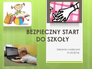BEZPIECZNY START DO SZKOŁY Zebranie z rodzicami 21.05.2014r. ROZWIAĆ OBAWY... W okresie średniego dzieciństwa (między 4 a 6 rokiem życia) postępuje dojrzewanie mózgu i wzrasta jego sprawność. Powstają nowe połączenia między neuronami i wzrasta synchronizacja między półkulami mózgowymi. Zmiany te prowadzą do zwiększenia sprawności w kierowaniu uwagą, umożliwiają refleksję nad własnym postępowaniem oraz sprzyjają skutecznemu rozwiązywaniu problemów. Rozwój układu nerwowego dziecka przyczynia się do większej integracji odbieranych bodźców, ujmowania stosunków przestrzennych w świecie, zdobywania orientacji w czasie i przestrzeni oraz zmian w zakresie pamięci, myślenia i zabawy. STANDARDY BEZPIECZNEJ ADAPTACJI DZIECKA DO SZKOŁY Ważną sprawą od samego początku przygotowań do szkoły jest ujęcie życia dziecka w pewne ramy organizacyjne. Chodzi o to, by u pierwszoklasistów ukształtować właściwe przyzwyczajenia. Należy więc ustalić rozkład dnia i nie powinien on ulegać większym zmianom. Wszelkie odchylenia od pory wstawania i zasypiania, posiłków, ustalonych godzin odrabiania lekcji są niekorzystne, bo nie pozwalają wytworzyć trwałych przyzwyczajeń u dziecka. STANDARDY BEZPIECZNEJ ADAPTACJI DZIECKA DO SZKOŁY Czego ZATEM uczyć dzieci? · Posługiwania się czarodziejskimi słowami: proszę, przepraszam, dziękuję · Witania osób znajomych (w szkole, w domu, w najbliższym otoczeniu) · Spokojnego i właściwego zachowania się przy stole · Nie przerywania rozmowy osób dorosłych · Słuchania rodziców, dziadków, innych członków rodziny, nauczycieli, pracowników szkoły itp. · Pytania o zgodę, gdy chce się coś wziąć cudzego lub coś zrobić. Dziecko, które prowadziło w domu „swobodny” tryb życia, nie miało w wieku przedszkolnym obowiązków, z trudnością może przystosowywać się do wymogów szkolnych. 10 WAKACYJNYCH RAD DLA RODZICÓW 5-6-LATKÓW 1.Zabawki jak podręczniki. Zabierając się z plaży, nie pakuj zabawek dziecka. Poproś, by samo odszukało wiaderka i łopatki. Dzięki temu nauczy się odpowiedzialności za swoje rzeczy. Dziś nagminnie zdarza się, że gdy zadzwoni dzwonek po ostatniej lekcji, pierwszaki zrywają się i biegną do domu, zostawiając swoje rzeczy na ławkach. 2. Lodziarz jak nauczyciel. Gdy będziecie mijać lodziarnię i dziecko zawoła „tato kup mi”, daj mu pieniądze i poproś „podejdź do pana i kup sam”. Jeśli będzie się wstydziło, trudno, lodów nie ma. Wytłumacz dziecku, że gdy na nie patrzysz, nie musi się bać obcych. I następnym razem ponów prośbę. W końcu dziecko się przełamie i nawet mu się to spodoba. Dzięki temu mniej będzie się bało kontaktów z dorosłymi i gdy na przerwie w szkole straci z oczu znaną wychowawczynię, bez obaw podejdzie do innej nauczycielki. 10 WAKACYJNYCH RAD DLA RODZICÓW 5-6-LATKÓW 3. Bajki jak lekcje. Dużym problemem wielu 6-latków w szkołach jest to, że nie potrafią słuchać. Za to świetnie odbierają rzeczywistość oczami. Spróbujmy w wakacje zmniejszyć dziecku dawki komputera i telewizji. Zamiast tego zacznijmy mu opowiadać bajki, historyjki, ciekawostki o zwierzętach, o tym, jak byliśmy mali, cokolwiek. Rozmawiajmy z nimi. Dzięki temu nauczymy je słuchać i odpowiadać na pytania. 4. Zamki z piasku jak zadania. Czas rozwijać wytrwałość. Dziecko zaczęło budować zamek z piasku - niech skończy, zanim pójdzie pluskać się w wodzie. Zamek się rozsypał - niech zacznie jeszcze raz, może drugi będzie ładniejszy. Dziecko samo nie potrafi - pomóż mu. Wyrobisz w nim zdolność mobilizacji do doprowadzania przedsięwzięć do końca. Dzięki temu łatwiej mu będzie kończyć zadania w szkole. 10 WAKACYJNYCH RAD DLA RODZICÓW 5-6-LATKÓW 5. Łopatka jak podnoszenie ręki. Niektóre maluchy mogą się wstydzić zgłaszać w szkole, choć znają odpowiedź. To wynikać może z tego, że rodzice je wyręczali. Gdy inne dziecko zabrało łopatkę i był płacz, tata szedł i prosił o zwrot. W te wakacje powiedzcie dzieciom, by to one szły odbierać swoje łopatki. 6. Dziecko ubiera się samo. Szkoła wymaga samodzielności. Warto, by maluch np. sam się ubierał, zakładał buty. Wiele 6latków to potrafi, ale rodzice pomagają im, żeby było szybciej. W wakacje dajmy dziecku czas na codzienne samodzielne ubieranie się. Zrozumie, że ma już obowiązki. 10 WAKACYJNYCH RAD DLA RODZICÓW 5-6-LATKÓW 7. Nie strasz szkołą. Wielu rodziców przeprowadza dzieciom przyspieszony kurs samodzielności: „Nie przyniosę ci tego jogurtu. Sam możesz wziąć go ze stołu. Już niedługo idziesz do szkoły, tam musisz być samodzielny”. Ucząc dziecko obowiązków, nie wolno ich wiązać z perspektywą czekającej je szkoły. To budzi strach przed szkołą. Powyższą rozmowę skończmy na dwóch pierwszych zdaniach. 8. Nie idealizuj. Opowiadajmy dziecku, że po wakacjach pójdzie do szkoły, będzie miało swoją grupę, klasę, ławkę, nowych kolegów. Ale nie czarujmy, że wszyscy nowi koledzy i koleżanki będą wspaniali. Będą tacy jak w przedszkolu - jedni mili, inni nie. To pozwoli ustrzec dzieci przed rozczarowaniami. 10 WAKACYJNYCH RAD DLA RODZICÓW 5-6-LATKÓW 9. Odwiedźcie szkołę. Jeszcze przed wakacjami warto przejść się z dzieckiem po korytarzach podczas przerwy, wytłumaczyć, dlaczego jest taki gwar. Odczekać do dzwonka na lekcję, wyjaśnić, gdzie wszyscy poszli. Dzięki temu we wrześniu mniej rzeczy będzie dla dziecka zaskoczeniem. Będziecie też mieli o czym rozmawiać, bo dziecko pewnie będzie zadawać pytania, np. - a co ja będę robiła podczas przerwy? 10. Poznajcie wychowawczynię. Najlepiej odwiedzić ją w szkole podczas którejś z przerw. Nie musisz przedstawiać jej dziecka, wystarczy, że maluch zobaczy, iż rodzic swobodnie rozmawia z nauczycielem. To wzbudzi w nim poczucie bezpieczeństwa. Warto podczas wakacji wspominać dziecku, że to ta pani bę