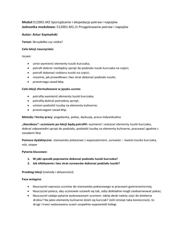 Moduł:512001.M2 Sporządzanie i ekspedycja potraw i napojów Jednostka modułowa: 512001.M2.J1 Przygotowanie potraw i napojów Autor: Artur Szymański Temat: Skrzydełko czy nóżka? Cele lekcji nauczyciela: Uczeń: umie wymienić elementy tuszki kurczaka; potrafi dobrać niezbędny sprzęt do podziału tuszki kurczaka na części; potrafi dokonać rozbioru tuszki na części; rozumie, jak prawidłowo i bez strat dokonać podziału tuszki; przestrzega zasad bhp. Cele lekcji sformułowane w języku ucznia: potrafię wymienić elementy tuszki kurczaka; potrafię dobrać potrzebny sprzęt; umiem podzielić tuszkę na elementy kulinarne; przestrzegam zasad bhp. Metody i formy pracy: pogadanka, pokaz, dyskusja, praca indywidualna „Nacobezu”: uczniowie po lekcji będą potrafili: wymienić i wskazać elementy tuszki kurczaka, dobrać odpowiedni sprzęt do podziału, podzielić tuszkę na elementy kulinarne, pracować zgodnie z zasadami bhp Pomoce dydaktyczne: stanowisko pokazowe z wyposażeniem, surowiec – świeża tuszka kurczaka, nóż, stoper Pytania kluczowe: 1. W jaki sposób poprawnie dokonać podziału tuszki kurczaka? 2. Jak efektywnie i bez strat surowców dokonać podziału tuszki? Przebieg lekcji (metody i aktywności): Faza wstępna: Nauczyciel zaprasza uczniów do stanowiska pokazowego w pracowni gastronomicznej; Nauczyciel poleca, aby uczniowie ustawili się tak, żeby dokładnie mogli zaobserwować pokaz; Nauczyciel zadaje pytania wylosowanym uczniom: Jakiej deski należy użyć do dzielenia drobiu? Na jakie elementy kulinarne dzieli się kurczak? Jeśli istnieje taka konieczność, to drugi i trzeci wylosowany uczeń uzupełnia wypowiedź kolegi. Faza zasadnicza: Nauczyciel dokonuje podsumowania fazy wstępnej, na podstawie wstępu określa, co będzie tematem lekcji, a następnie podaje cele lekcji językiem ucznia; Nauczyciel inicjuje dyskusję na temat istoty podziału tuszki na elementy kulinarne; Nauczyciel dokonuje wycięcia jednego elementu tuszki po lewej stronie kurczaka, wybrany losowo uczeń dokonuje analogicznego wycięcia po prawej; Nauczyciel zwraca uwagę na stosowanie zasad bhp; Kolega stojący najbliżej ucznia przeprowadzającego podział tuszki dokonuje oceny koleżeńskiej. Nauczyciel sprawdza poprawność wykonanego zadania; Losowo wybrani uczniowie dokonują podziału tuszki na kolejne części, natomiast koledzy przeprowadzają ocenę koleżeńską; Uczniowie sprawdzają gramaturę wykrojonych części i porównują ją z elementami, jakie przygotował nauczyciel. Faza podsumowująca: Nauczyciel prosi o zrobienie zdjęcia wykrojonym elementom kulinarnym. Na zakończenie wybrani przez nauczyciela uczniowie na podstawie notatek zrobionych na lekcji przypominają najważniejsze zagadnienia tematu – czas 5 minut. Nauczyciel zadaje pracę domową: „Przećwicz dzielenie tuszki kurczaka na elementy w domu”. Udokumentuj zrobione zadanie wykonując zdjęcie. Pamiętaj o tym, żeby : 1. Stosować zasady bhp 2. Wykorzystać informację zdobyte na zajęciach 3. Prawidłowo i bez strat dokonać podziału * nauczyciel dokonuje ewaluacji zajęć: uczniowie wychodząc z lekcji mają postawić + lub - na kartce przy drzwiach