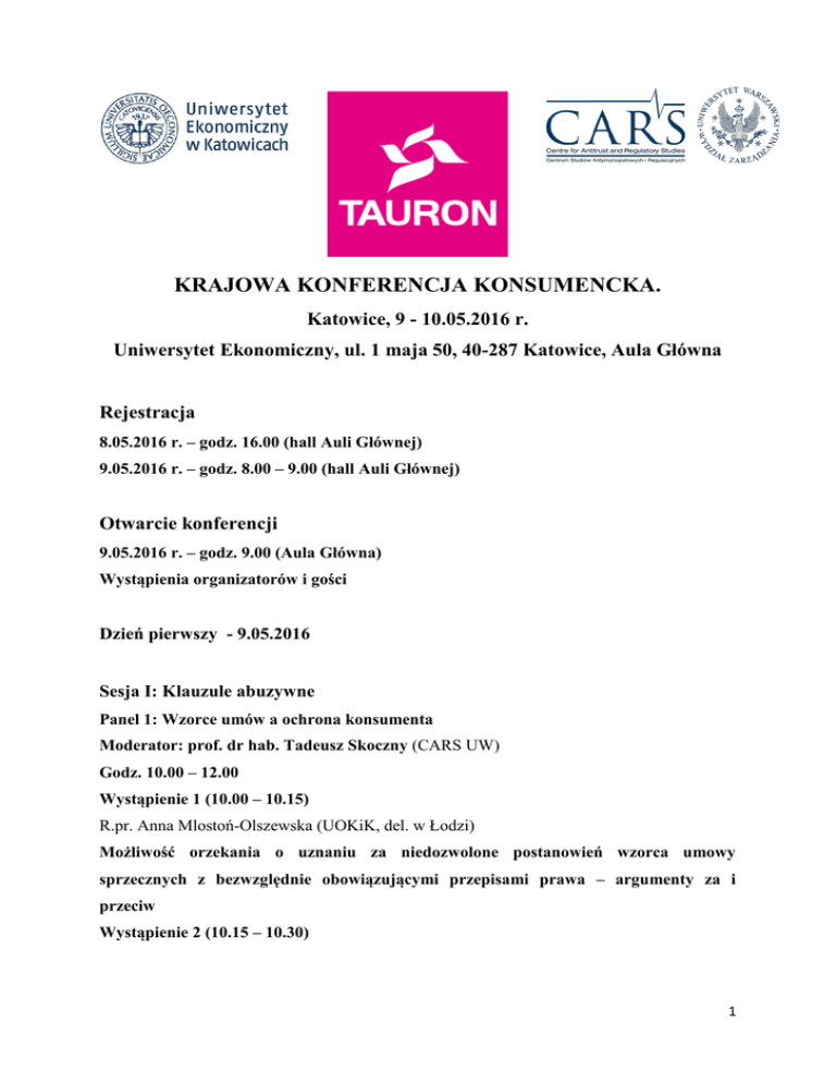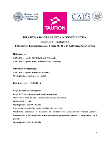 KRAJOWA KONFERENCJA KONSUMENCKA. Katowice, 9 - 10.05.2016 r. Uniwersytet Ekonomiczny, ul. 1 maja 50, 40-287 Katowice, Aula Główna Rejestracja 8.05.2016 r. – godz. 16.00 (hall Auli Głównej) 9.05.2016 r. – godz. 8.00 – 9.00 (hall Auli Głównej) Otwarcie konferencji 9.05.2016 r. – godz. 9.00 (Aula Główna) Wystąpienia organizatorów i gości Dzień pierwszy - 9.05.2016 Sesja I: Klauzule abuzywne Panel 1: Wzorce umów a ochrona konsumenta Moderator: prof. dr hab. Tadeusz Skoczny (CARS UW) Godz. 10.00 – 12.00 Wystąpienie 1 (10.00 – 10.15) R.pr. Anna Mlostoń-Olszewska (UOKiK, del. w Łodzi) Możliwość orzekania o uznaniu za niedozwolone postanowień wzorca umowy sprzecznych z bezwzględnie obowiązującymi przepisami prawa – argumenty za i przeciw Wystąpienie 2 (10.15 – 10.30) 1 Dr hab. Marek Świerczyński, prof. UKSW (Uniwersytet Kardynała Stefana Wyszyńskiego) i r.pr. Marcin Kolasiński (Kancelaria Kieszkowska Rutkowska Kolasiński; afiliowany przy CARS) Wybór prawa obcego w internetowych wzorcach umownych a ochrona konsumenta Wystąpienie 3 (10.30 – 10.45) Jacek Krzemiński (WPiA UMK) Przyszłość arbitrażu konsumenckiego – zapis na polski sąd polubowny jako niedozwolone postanowienie w umowach z konsumentami Kawa – 10.45 – 11.15 Panel 2: Modele kontroli wzorców umownych Moderator: dr Aneta Wiewiórowska-Domagalska (Uniwersytet w Osnabrück) Wystąpienie 1 (godz. 11.15 – 11.30) Krzysztof Lehmann (Del. UOKiK w Bydgoszczy) Eliminowanie postanowień niedozwolonych z wykonywanych umów o charakterze ciągłym w obrocie konsumenckim Wystąpienie 2 (godz. 11.30 – 11.45) Dr Antoni Bolecki (Kancelaria Greenberg Traurig, afiliowany przy CARS) Kontrola incydentalna klauzul abuzywnych Wystąpienie 3 (godz. 11.45 – 12.00) Patrycja Kozik (doktorantka WPiA UJ) Administracyjny może Prezesa efektywnie UOKiK model kontroli kontrolować na gruncie wzorców treść nowelizacji umownych umowy? ustawy Czyli o – nowe ochronie czy organ kompetencje konkurencji i konsumentów Łączna dyskusja do panelu 1 i 2 (godz. 12.00 – 12.30) Sesja II: Zakaz naruszania zbiorowych interesów konsumentów Panel 3: Istota naruszania zbiorowych interesów konsumentów Moderator: Dorota Karczewska (Wiceprezes UOKiK) Godz. 12.30 – 13.15 Wystąpienie 1 (12.30 – 12.45) 2 R.pr. Michał Strzelecki (autor bloga praworeklamy.pl) Praktyki naruszające zbiorowe interesy konsumentów w świetle zupełnej harmonizacji praktyk handlowych wynikającej z dyrektywy 2005/29/WRE o nieuczciwych praktykach handlowych Wystąpienie 2: (12.45 – 13.00) Adw. dr Małgorzata Sieradzka (Kancelaria Adwokacka MSW, WPiA Uczelni Łazarskiego) Próba dookreślenia terminu ,,zbiorowy interes konsumentów”- definicja oraz jej wyznaczniki Wystąpienie 3: (13.00 – 13.15) Dr Aleksandra Kunkiel-Kryńska (Kancelaria Wierzbowski Eversheds), Naruszenie dobrych obyczajów a praktyka naruszająca zbiorowe interesy konsumentów Dyskusja do panelu 3 – 13.15 – 14.00 Lunch 14.00 – 15.00 Panel 4: Nowe rozwiązania w obszarze przeciwdziałania praktykom naruszającym zbiorowe interesy konsumentów Moderator: dr hab. Monika Namysłowska, prof. UŁ Godz. 15.00 - 16.00 Wystąpienie 1(15.00 – 15.15) Dr Patrycja Dolniak-Mądrzycka (Akademia Wychowania Fizycznego w Katowicach) Nowy otwarty katalog praktyk naruszających zbiorowe interesy konsumentów Wystąpienie 2 (15.15 – 15.30) Dr Małgorzata Ganzar (WPiA KUL) Art. 24 ust. 2 pkt 4 - nowa praktyka naruszająca zbiorowe interesy konsumentów w świetle nowelizacji ustawy o ochronie konkurencji i konsumentów z 2015 r. Wystąpienie 3 (15.30 – 15.45) R.pr Marta Burnecka-Szczepańska (Gł. Specj. w del. UOKiK w Bydgodszczy) Nowe kompetencje Prezesa UOKiK w sprawach praktyk naruszających zbiorowe interesy konsumentów – instytucja tajemniczego klienta (mystery shopper) Wystąpienie 4 (15.45 – 16.00) Jan Szczygieł (doktorant UŚl) Nowa prerogatywa Prezesa Urzędu Ochrony Konkurencji i Konsumentów do przedstawienia istotnego poglądu w sprawie 3 Dyskusja do panelu 4 – 16.00 – 16.30 Kawa – 16.30 – 17.00 Panel 5: Materialne i proceduralne konsekwencje stosowania zakazu praktyk naruszających zbiorowe interesy konsumentów Moderator: Dr hab. Anna Piszcz, prof. UwB Godz. 17.00 – 17.45 Wystąpienie 1 (17.00 – 17.15) R.pr. Łukasz Wroński (UOKiK, z-ca dyr. DOIK w UOKiK) Skutki stosowania praktyk naruszających zbiorowe interesy konsumentów a środki ich usunięcia w decyzjach Prezesa UOKiK Wystąpienie 2 (17.15 – 17.30) R. pr. Piotr Suski (doktorant WPiA, UJ, Kancelaria Markiewicz Sroczyński) Modyfikacja warunków umów zawieranych przez przedsiębiorstwa energetyczne i telekomunikacyjne z konsumentami na tle orzecznictwa Prezesa UOKiK w sprawach dotyczących naruszenia zbiorowych interesów konsumentów Wystąpienie 3 (17.30 – 17.45) R.pr. Jan Ulański (doktorant na WPiA UŁ; Dep. Prawny UOKiK) i Agnieszka Szafran (Gł. Specj. w Del. UOKiK w Bydgoszczy) Prejudycjalny charakter decyzji Prezesa UOKiK w indywidualnym sporze konsumenta z przedsiębiorcą (kwestie konsumenckiego private enforcement) Łączna dyskusja do panelu 5 – godz. 17.30 – 18.00 Uroczysta kolacja – 19.00 Dzień drugi – 10.05.2016 Sesja III: Ekonomia ochrony konsumentów Panel 6: Ekonomia ochrony konsumentów - przysporzenie konsumenckie Moderator: dr Marzena Czarnecka (UE w Katowicach) Godz. 10.00 – 11.30 Wystąpienie 1 (10.00 – 10.15) Dr. hab. Monika Namysłowska, prof. UŁ (WPiA Uniwersytetu Łódzkiego) 4 Ekonomia ochrony konsumentów w prawie UE i w prawie polskim Wystąpienie 2 (10.15 – 10.30) R.pr. Jarosław Sroczyński (Kancelaria Markiewicz Sroczyński; afiliowany przy CARS) UOKiK – co my z niego mamy? Próba metodologii badań tzw. przysporzenia konsumenckiego Wystąpienie 3 (10.30 – 10.45) R.pr. Jacek Marczak (Del. UOKiK w Bydgoszczy) Dobrowolne przysporzenie konsumenckie na przykładzie decyzji zobowiązujących Wystąpienie 4 (10.45 – 11.00) R.p