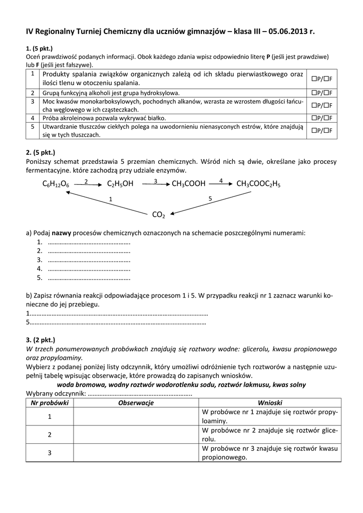 IV Regionalny Turniej Chemiczny dla uczniów gimnazjów – klasa III – 05.06.2013 r. 1. (5 pkt.) Oceń prawdziwość podanych informacji. Obok każdego zdania wpisz odpowiednio literę P (jeśli jest prawdziwe) lub F (jeśli jest fałszywe). 1 Produkty spalania związków organicznych zależą od ich składu pierwiastkowego oraz P/F ilości tlenu w otoczeniu spalania. 2 3 4 5 Grupą funkcyjną alkoholi jest grupa hydroksylowa. Moc kwasów monokarboksylowych, pochodnych alkanów, wzrasta ze wzrostem długości łańcucha węglowego w ich cząsteczkach. Próba akroleinowa pozwala wykrywać białko. Utwardzanie tłuszczów ciekłych polega na uwodornieniu nienasyconych estrów, które znajdują się w tych tłuszczach. P/F P/F P/F P/F 2. (5 pkt.) Poniższy schemat przedstawia 5 przemian chemicznych. Wśród nich są dwie, określane jako procesy fermentacyjne. które zachodzą przy udziale enzymów. C6H12O6 2 C2H5OH 3 4 CH3COOH CH3COOC2H5 5 1 CO2 a) Podaj nazwy procesów chemicznych oznaczonych na schemacie poszczególnymi numerami: 1. …………………………………………. 2. …………………………………………. 3. …………………………………………. 4. …………………………………………. 5. …………………………………………. b) Zapisz równania reakcji odpowiadające procesom 1 i 5. W przypadku reakcji nr 1 zaznacz warunki konieczne do jej przebiegu. 1.…………………………………………………………………………………………… 5…………………………………………………………………………………………… 3. (2 pkt.) W trzech ponumerowanych probówkach znajdują się roztwory wodne: glicerolu, kwasu propionowego oraz propyloaminy. Wybierz z podanej poniżej listy odczynnik, który umożliwi odróżnienie tych roztworów a następnie uzupełnij tabelę wpisując obserwacje, które prowadzą do zapisanych wniosków. woda bromowa, wodny roztwór wodorotlenku sodu, roztwór lakmusu, kwas solny Wybrany odczynnik: …………………………………………………….. Nr probówki Obserwacje Wnioski W probówce nr 1 znajduje się roztwór propy1 loaminy. W probówce nr 2 znajduje się roztwór glice2 rolu. W probówce nr 3 znajduje się roztwór kwasu 3 propionowego. 4. (4 pkt.) Masa cząsteczkowa pewnego węglowodoru Y występującego w szeregu homologicznym bezpośrednio po pewnym węglowodorze X jest od niego o 14,3% większa. Wiedząc, że zawartość procentowa wodoru w węglowodorze X wynosi 14,3% ustal jego wzór strukturalny (lub półstrukturalny) oraz podaj jego nazwę. Wzór półstrukturalny: (lub strukturalny) Nazwa węglowodoru:……………….. 5. (4 pkt.) Pewien ester, którego masa cząsteczkowa wynosi 130 u, poddano hydrolizie. Jednym z produktów hydrolizy jest kwas nasycony monokarboksylowy, zawierający w cząsteczce trzy atomy węgla. Na podstawie odpowiednich obliczeń ustal wzór tego estru, podaj jego nazwę i zapisz równanie jego hydrolizy. Wzór estru: ……………………………………………… Nazwa estru:…………………………………………….. Równanie reakcji hydrolizy estru:………………………………………………………………………………………………….. Klucz odpowiedzi Zad. 1 max. 5 pkt. Za każdy poprawny wpis 1 pkt. 1 P; 2 P; 3 F; 4 F; 5 P. Zad. 2 max. 5 pkt. a. 1.fotosynteza 2. fermentacja alkoholowa 3.fermentacja octowa 4. estryfikacja 5.spalanie b. 6 CO2 + 6 H2O energia słoneczna, chlorofil C6H12O6 + 6 O2 (1) CH3COOC2H5 + 5O2 → 4CO2 + 4H2O (5) za podanie 5 nazw 3 pkt. 4-3 2 pkt. 2-1 1 pkt. poprawne zapisanie równania reakcji po 1 pkt. Zad. 3 max. 2 pkt. Wybrany odczynnik: roztwór lakmusu. Nr probówki 1 2 3 Obserwacje Lakmus zmienia barwę na niebieską. Lakmus nie zmienia zabarwienia. Lakmus zmienia barwę na czerwoną (różową). poprawny wybór odczynnika poprawne 3 obserwacje Wnioski W probówce nr 1 znajduje się roztwór propyloaminy. W probówce nr 2 znajduje się roztwór glicerolu. W probówce nr 3 znajduje się roztwór kwasu propionowego. 1 pkt. 1 pkt. Zad. 4 max. 4 pkt. CxHy = mCxHy = 98u 14,3% z 98u = 14u (98 – 14) : 12 = 7 C7H14 CH2=CH –CH2−CH2−CH2−CH2–CH3 hepten (lub inny izomeryczny węglowodór spełniający warunki zadania) obliczenie masy cząsteczkowej węglowodoru 1 pkt. ustalenie w oparciu o obliczenia liczby atomów C i H 1 pkt. poprawny wzór strukturalny lub półstrukturalny 1 pkt. poprawna nazwa 1 pkt. Zad. 5 max. 4 pkt. C2H5COOCxHy 130u – (3 ∙ 12u + 5u + 32u) = 57u 57u : 12u = 4 r.9 C2H5COOC4H9 propionian butylu lub propanian butylu C2H5COOC4H9 + H2O → C2H5COOH + C4H9OH poprawne zapisanie wzoru grupy węglowodorowej od kwasu metoda ustalenia liczby atomów C i H w grupie węglowodorowej od alkoholu poprawna nazwa estru zapis równania reakcji hydrolizy Łączna liczba punktów 20. 1 pkt. 1 pkt. 1 pkt. 1 pkt.