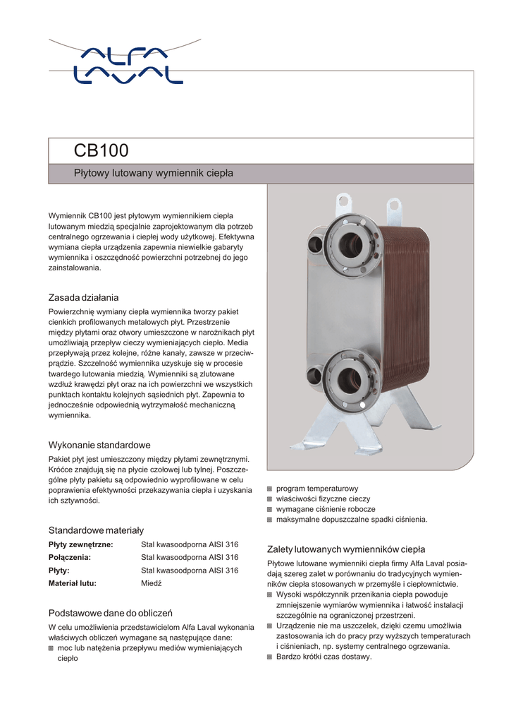 CB100 P³ytowy lutowany wymiennik ciep³a Wymiennik CB100 jest p³ytowym wymiennikiem ciep³a lutowanym miedzi¹ specjalnie zaprojektowanym dla potrzeb centralnego ogrzewania i ciep³ej wody u¿ytkowej. Efektywna wymiana ciep³a urz¹dzenia zapewnia niewielkie gabaryty wymiennika i oszczêdnoœæ powierzchni potrzebnej do jego zainstalowania. Zasada dzia³ania Powierzchniê wymiany ciep³a wymiennika tworzy pakiet cienkich profilowanych metalowych p³yt. Przestrzenie miêdzy p³ytami oraz otwory umieszczone w naro¿nikach p³yt umo¿liwiaj¹ przep³yw cieczy wymieniaj¹cych ciep³o. Media przep³ywaj¹ przez kolejne, ró¿ne kana³y, zawsze w przeciwpr¹dzie. Szczelnoœæ wymiennika uzyskuje siê w procesie twardego lutowania miedzi¹. Wymienniki s¹ zlutowane wzd³u¿ krawêdzi p³yt oraz na ich powierzchni we wszystkich punktach kontaktu kolejnych s¹siednich p³yt. Zapewnia to jednoczeœnie odpowiedni¹ wytrzyma³oœæ mechaniczn¹ wymiennika. Wykonanie standardowe Pakiet p³yt jest umieszczony miêdzy p³ytami zewnêtrznymi. Króæce znajduj¹ siê na p³ycie czo³owej lub tylnej. Poszczególne p³yty pakietu s¹ odpowiednio wyprofilowane w celu poprawienia efektywnoœci przekazywania ciep³a i uzyskania ich sztywnoœci. - program temperaturowy w³aœciwoœci fizyczne cieczy wymagane ciœnienie robocze maksymalne dopuszczalne spadki ciœnienia. Standardowe materia³y P³yty zewnêtrzne: Stal kwasoodporna AISI 316 Po³¹czenia: Stal kwasoodporna AISI 316 P³yty: Stal kwasoodporna AISI 316 Materia³ lutu: MiedŸ Podstawowe dane do obliczeñ W celu umo¿liwienia przedstawicielom Alfa Laval wykonania w³aœciwych obliczeñ wymagane s¹ nastêpuj¹ce dane: - moc lub natê¿enia przep³ywu mediów wymieniaj¹cych ciep³o Zalety lutowanych wymienników ciep³a P³ytowe lutowane wymienniki ciep³a firmy Alfa Laval posiadaj¹ szereg zalet w porównaniu do tradycyjnych wymienników ciep³a stosowanych w przemyœle i ciep³ownictwie. - Wysoki wspó³czynnik przenikania ciep³a powoduje zmniejszenie wymiarów wymiennika i ³atwoœæ instalacji szczególnie na ograniczonej przestrzeni. - Urz¹dzenie nie ma uszczelek, dziêki czemu umo¿liwia zastosowania ich do pracy przy wy¿szych temperaturach i ciœnieniach, np. systemy centralnego ogrzewania. - Bardzo krótki czas dostawy. Wymiary (mm) Dane techniczne Temperatura projektowa 175 °C Ciœnienie projektowe S3, S4/S1, S2 25/16 bar Pojemnoœæ kana³u 0.17 litra Maksymalny przep³yw 70 m3/h Waga 4 + 0.35 x n, gdzie n = liczba p³yt Króæce A = 10 + 2.15 x n, gdzie n = liczba plyt Ko³nierzowe DN65, zewnêtrzny gwint ISOG 2”, koñcówka spawana f76.1 mm Wyposa¿enie dodatkowe - Izolacja, temperatura maksymalna 140 °C Z³¹czki Przyk³ady wydajnoœci cieplnej Ciep³a woda u¿ytkowa 70 ->25/10 ->55°C Centralne ogrzewanie Liczba p³yt Liczba p³yt 120 -> 65/60 -> 85°C Litry/s Alfa Laval Polska Sp. z o.o. Dzia³ Ciep³ownictwa ul. J.D¹browskiego 113, 93-208 £ódŸ tel.: (42) 642-66-00, fax: (42) 642-70-55, www.alfalaval.pl kW