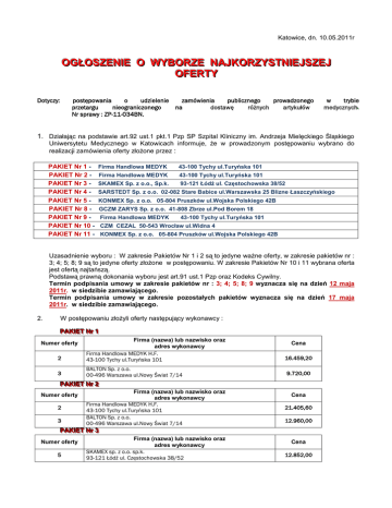 Katowice, dn. 10.05.2011r O OG GŁŁO OS SZZE EN NIIE E O O W WY YB BO OR RZZE E N NA AJJK KO OR RZZY YS STTN NIIE EJJS SZZE EJJ O OFFE ER RTTY Y Dotyczy: postępowania o udzielenie zamówienia publicznego prowadzonego przetargu nieograniczonego na dostawę różnych artykułów Nr sprawy : ZP-11-034BN. w trybie medycznych.. 1. Działając na podstawie art.92 ust.1 pkt.1 Pzp SP Szpital Kliniczny im. Andrzeja Mielęckiego Śląskiego Uniwersytetu Medycznego w Katowicach informuje, że w prowadzonym postępowaniu wybrano do realizacji zamówienia oferty złożone przez : PAKIET Nr 1 PAKIET Nr 2 PAKIET Nr 3 PAKIET Nr 4 PAKIET Nr 5 PAKIET Nr 8 PAKIET Nr 9 PAKIET Nr 10 PAKIET Nr 11 - Firma Handlowa MEDYK 43-100 Tychy ul.Turyńska 101 Firma Handlowa MEDYK 43-100 Tychy ul.Turyńska 101 SKAMEX Sp. z o.o., Sp.k. 93-121 Łódź ul. Częstochowska 38/52 SARSTEDT Sp. z o.o. 02-082 Stare Babice ul.Warszawska 25 Blizne Łaszczyńskiego KONMEX Sp. z o.o. 05-804 Pruszków ul.Wojska Polskiego 42B GCZM ZARYS Sp. z o.o. 41-808 Zbrze ul.Pod Borem 18 Firma Handlowa MEDYK 43-100 Tychy ul.Turyńska 101 CZM CEZAL 50-543 Wrocław ul.Widna 4 KONMEX Sp. z o.o. 05-804 Pruszków ul.Wojska Polskiego 42B Uzasadnienie wyboru : W zakresie Pakietów Nr 1 i 2 są to jedyne ważne oferty, w zakresie pakietów nr : 3; 4; 5; 8; 9 są to jedyne oferty złożone w postępowaniu. W zakresie Pakietów Nr 10 i 11 wybrana oferta jest ofertą najtańszą. Podstawą prawną dokonania wyboru jest art.91 ust.1 Pzp oraz Kodeks Cywilny. Termin podpisania umowy w zakresie pakietów nr : 3; 4; 5; 8; 9 wyznacza się na dzień 12 maja 2011r. w siedzibie zamawiającego. Termin podpisania umowy w zakresie pozostałych pakietów wyznacza się na dzień 17 maja 2011r. w siedzibie zamawiającego. 2. W postępowaniu złożyli oferty następujący wykonawcy : PPA AK KIIEETT N Nrr 11 2 Firma (nazwa) lub nazwisko oraz adres wykonawcy Firma Handlowa MEDYK H.F. 43-100 Tychy ul.Turyńska 101 16.459,20 3 BALTON Sp. z o.o. 00-496 Warszawa ul.Nowy Świat 7/14 9.720,00 Numer oferty Cena PPA AK KIIEETT N Nrr 22 Numer oferty 2 3 Firma (nazwa) lub nazwisko oraz adres wykonawcy Firma Handlowa MEDYK H.F. 43-100 Tychy ul.Turyńska 101 BALTON Sp. z o.o. 00-496 Warszawa ul.Nowy Świat 7/14 Cena 21.405,60 12.960,00 PPA AK KIIEETT N Nrr 33 Numer oferty 5 Firma (nazwa) lub nazwisko oraz adres wykonawcy SKAMEX sp. z o.o. sp.k. 93-121 Łódź ul. Częstochowska 38/52 Cena 12.852,00 PPA AK KIIEETT N Nrr 44 Numer oferty 1 Firma (nazwa) lub nazwisko oraz adres wykonawcy SARSTEDT Sp. z o.o. 02-082 Stare Babice ul.warszawska 25 Blizne Łaszczyńskiego Cena 51.284,88 PPA AK KIIEETT N Nrr 55 Firma (nazwa) lub nazwisko oraz adres wykonawcy Numer oferty 7 KONMEX sp. z o.o. 05-804 Pruszków ul.Wojska Polskiego 42 B Cena 13.063,68 PPA AK KIIEETT N Nrr 66 Numer oferty 5 Firma (nazwa) lub nazwisko oraz adres wykonawcy SKAMEX sp. z o.o. sp.k. 93-121 Łódź ul. Częstochowska 38/52 Cena 42.314,40 PPA AK KIIEETT N Nrr 77 Numer oferty 5 Firma (nazwa) lub nazwisko oraz adres wykonawcy SKAMEX sp. z o.o. sp.k. 93-121 Łódź ul. Częstochowska 38/52 Cena 84.774,06 PPA AK KIIEETT N Nrr 88 Numer oferty 6 Firma (nazwa) lub nazwisko oraz adres wykonawcy GCZM ZARYS sp. z o.o. 41-808 Zabrze ul. Pod Borem 18 Cena 5.132,16 PPA AK KIIEETT N Nrr 99 Numer oferty 2 Firma (nazwa) lub nazwisko oraz adres wykonawcy Firma Handlowa MEDYK H.F. 43-100 Tychy ul.Turyńska 101 Cena 4.730,40 PPA AK KIIEETT N Nrr 1100 Numer oferty 4 Firma (nazwa) lub nazwisko oraz adres wykonawcy Centrum Zaopatrzenia Medycznego CEZAL S.A. 50-543 Wrocław ul.Widna 4 GCZM ZARYS sp. z o.o. 41-808 Zabrze ul. Pod Borem 18 PPPAAAK K N KIIIEEETTT N Nrrr 111111 Firma (nazwa) lub nazwisko oraz Numer oferty adres wykonawcy GCZM ZARYS sp. z o.o. 6 41-808 Zabrze ul. Pod Borem 18 KONMEX sp. z o.o. 7 05-804 Pruszków ul.Wojska Polskiego 42 B 6 Cena 2.721,60 6.350,40 Cena 2.427,57 2.371,68 Działając na podstawie art.92 ust.1 pkt.2 Pzp Zamawiający informuje, że w prowadzonym postępowaniu nie został wykluczony żaden wykonawca. 4. Działając na podstawie art.92 ust.1 pkt.2 Pzp Zamawiający informuje, że w prowadzonym postępowaniu została odrzucona oferta złozona przez BALTON Sp. z o.o. w zakresie Pakietów Nr 1 i 2. Podstawa prawna odrzucenia : art.89 ust.1 pkt.2. Oferowany przedmiot zamówienia nie spełniał wymogów określonych w SIWZ. 5. Środki ochrony prawnej : Od decyzji niniejszej przysługują wykonawcom środki ochrony prawnej określone w ustawie Prawo zamówień publicznych – dział VI „ Środki ochrony prawnej”. Wobec czynności podjętych przez zamawiającego w toku postępowania można wnieść odwołanie. Odwołanie wnosi się w terminie 5 dni od dnia, w którym powzięto lub można było powziąć wiadomość o okolicznościach stanowiących podstawę jego wniesienia. 3. Z upoważnienia Dyrektora SPSKM Z-ca Dyr. Ds. Ekonomicznych - Główny Księgowy mgr Ewa Mołek