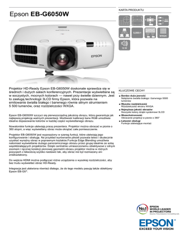 KARTA PRODUKTU Epson EB-G6050W Projektor HD-Ready Epson EB-G6050W doskonale sprawdza się w średnich i dużych salach konferencyjnych. Prezentacje wyświetlane są w soczystych, mocnych kolorach — nawet przy świetle dziennym. Jest to zasługą technologii 3LCD firmy Epson, która pozwala na emitowanie światła białego i barwnego równie silnym strumieniem 5 500 lumenów, oraz rozdzielczości WXGA. Epson EB-G6050W szczyci się pierwszorzędną jakością obrazu, która gwarantuje jak najlepszą projekcję ważnych prezentacji. Możliwość kalibracji barw RGB umożliwia idealne dopasowanie kolorów w każdej części wyświetlanego obrazu. Nowatorskie funkcje ułatwiają pracę prezentera. Projektor można obracać w pionie o 360 stopni, a więc wyświetlany obraz może okrążać całe pomieszczenie. Projektor EB-G6050W jest wyposażony w szereg funkcji, które ułatwiają jego konfigurowanie i obsługę. Na przykład wyrównanie pikseli pozwala łatwo i skutecznie uzyskać wyraźny obraz w poprawnym kształcie.Funkcja Edge Blending umożliwia natomiast wyświetlanie dużego panoramicznego obrazu przez grupę idealnie ze sobą współdziałających projektorów. Dzięki centralnie umieszczonemu obiektywowi z silnym zoomem i ręcznej korekcji pionowej geometrii obrazu projektor można w różnych pozycjach z łatwością szybko nastawić tak, aby obraz nie był rozmazany ani zniekształcony. Do wejścia HDMI można podłączać różne urządzenia o wysokiej rozdzielczości, aby bez trudu wyświetlać obraz HD-Ready. Integracja jest ułatwiona również dlatego, że do tego modelu pasują także obiektywy Epson EB-G51. KLUCZOWE CECHY Bardzo duża jasność Natężenie światła białego i barwnego 5500 lumenów Wysoka rozdzielczość Rozdzielczość ekranu WXGA Najwyższa jakość obrazów Soczyste kolory dzięki systemowi 3LCD Wszechstronność Obracanie projekcji w pionie o 360° Łatwość obsługi Funkcje ułatwiające montaż Epson EB-G6050W ZAWARTOŚĆ ZESTAWU SPECYFIKACJE PRODUKTU TECHNIKA System projekcyjny Technologia 3LCD, Ciekłokrystaliczna migawka RGB Panel LCD 0,76 cal z C2 Fine OBRAZ Lampa 380 W, 3.000 h Żywotność, 4.000 h Żywotność (w trybie oszczędnym) Natężenie światła barwnego 5.500 lumen-4.455 lumen (tryb ekonomiczny) Natężenie światła białego 5.500 lumen - 4.455 lumen (tryb ekonomiczny) Korekcja obrazu Ręczna obsługa (lub "Instrukcja obsługi") pionowo: ± 30 °, Ręczna obsługa (lub "Instrukcja Pokrywa kabli Kabel komputerowy Zacisk przewodu HDMI Kabel zasilający Instrukcja obsługi (CD) OPCJONALNE AKCESORIA obsługi") poziomo ± 30 ° Rozdzielczość WXGA, 1280 x 800, 16:10 Stosunek kontrastu 5.000 : 1 Air Filter - ELPAF43 - EB-G6xxx Series V13H134A43 Lamp - ELPLP76 - EB-G6xxx Series V13H010L76 Ceiling Mount ELPMB22 V12H003B22 Quick Wireless Connect USB key - ELPAP09 V12H005M09 Adapter - ELPAP07 Wireless LAN b/g/n V12H418P13 3D Polarizer - ELPPL01 - EB-G6xxx & EB-48/4950WU V12H618A01 UKŁAD OPTYCZNY Zoom Manual, Factor: 1 - 1,8 Rozmiar projekcji 50 cale - 300 cale Odległość projekcyjna, system 1,4 m - 8,4 m (300 cal ekran) szerokokątny Stosunek projekcji 1,26 - 2,30:1 Odległość ogniskowa 21,28 mm - 37,94 mm Fokus Ręcznie Odległość projekcyjna, system 2,5 m - 15 m (300 cal ekran) Tele Wartość przesłony obiektywu 1,65 - 2,55 OPTIONAL LENSES projekcyjnego INNE Gwarancja 36 miesiące/miesięcy Klient zanosi do serwisu lub 15.000 h, Lampa: 36 miesiące/miesięcy lub 1.000 h INFORMACJA LOGISTYCZNA SKU V11H511040 Kod kreskowy 8715946513829 Wymiary opakowania pojedynczego 517 x 342 x 196 mm Waga pudełka 5,51 kg szt. 6 Liczba jednostek Kraj pochodzenia Chiny Rozmiar palety 7 szt. (1 x 7) Epson Europe B.V. Sp. z o.o. Oddział w Polsce ul. Bokserska 66 02-690 Warszawa Tel.: +48 22 375 7500 Faks: +48 22 375 7501 Infolinia: 801 64 64 53 (Opłata za połączenie wg taryfy operatora.) www.epson.pl Znaki towarowe oraz zastrzeżone znaki towarowe są własnością firmy Seiko Epson Corporation lub odpowiednich firm. Informacje o produkcie mogą ulec zmianie bez uprzedzenia. Long Throw Zoom Lens ELPLL06 V12H004L06 Middle Throw Zoom Lens1 ELPLM04 V12H004M04 Middle Throw Zoom Lens2 ELPLM05 V12H004M05 Rear Projection Wide Lens ELPLR03 V12H004R03 Lens - ELPLU01 - EB-G6xxx ST Off Axis V12H004U01 Lens - ELPLS06 - EB-G6xxx Standard V12H004S06 1. Z wyjątkiem obiektywu ELPLS05