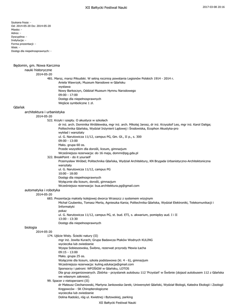 20 maja (wtorek) - Bałtycki Festiwal Nauki