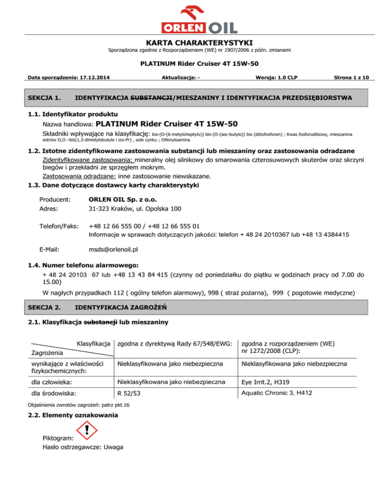 KARTA CHARAKTERYSTYKI Sporządzona zgodnie z Rozporządzeniem (WE) nr 1907/2006 z późn. zmianami PLATINUM Rider Cruiser 4T 15W-50 Data sporządzenia: 17.12.2014 SEKCJA 1. Aktualizacja: - Wersja: 1.0 CLP Strona 1 z 10 IDENTYFIKACJA SUBSTANCJI/MIESZANINY I IDENTYFIKACJA PRZEDSIĘBIORSTWA 1.1. Identyfikator produktu Nazwa handlowa: PLATINUM Rider Cruiser 4T 15W-50 Składniki wpływające na klasyfikację: bis-(O-(6-metyloheptylo)) bis-(O-(sec-butylo)) bis (ditiofosforan) ; Kwas fosforoditiowy, mieszanina estrów O,O –bis(1,3-dimetylobutylo i izo-Pr) , sole cynku ; Difenyloamina 1.2. Istotne zidentyfikowane zastosowania substancji lub mieszaniny oraz zastosowania odradzane Zidentyfikowane zastosowania: mineralny olej silnikowy do smarowania czterosuwowych skuterów oraz skrzyni biegów i przekładni ze sprzęgłem mokrym. Zastosowania odradzane: inne zastosowanie niewskazane. 1.3. Dane dotyczące dostawcy karty charakterystyki Producent: ORLEN OIL Sp. z o.o. Adres: 31-323 Kraków, ul. Opolska 100 Telefon/Faks: +48 12 66 555 00 / +48 12 66 555 01 Informacje w sprawach dotyczących jakości: telefon + 48 24 2010367 lub +48 13 4384415 E-Mail: [email protected] 1.4. Numer telefonu alarmowego: + 48 24 20103 67 lub +48 13 43 84 415 (czynny od poniedziałku do piątku w godzinach pracy od 7.00 do 15.00) W nagłych przypadkach 112 ( ogólny telefon alarmowy), 998 ( straż pożarna), 999 ( pogotowie medyczne) SEKCJA 2. IDENTYFIKACJA ZAGROŻEŃ 2.1. Klasyfikacja substancji lub mieszaniny Klasyfikacja zgodna z dyrektywą Rady 67/548/EWG: zgodna z rozporządzeniem (WE) nr 1272/2008 (CLP): wynikające z właściwości fizykochemicznych: Nieklasyfikowana jako niebezpieczna Nieklasyfikowana jako niebezpieczna dla człowieka: Nieklasyfikowana jako niebezpieczna Eye Irrit.2, H319 dla środowiska: R 52/53 Aquatic Chronic 3, H412 Zagrożenia Objaśnienia zwrotów zagrożeń: patrz pkt.16 2.2. Elementy oznakowania Piktogram: Hasło ostrzegawcze: Uwaga KARTA CHARAKTERYSTYKI Sporządzona zgodnie z Rozporządzeniem (WE) nr 1907/2006 z późn. zmianami PLATINUM Rider Cruiser 4T 15W-50 Data sporządzenia: 17.12.2014 Aktualizacja: - Wersja: 1.0 CLP Strona 2 z 10 Zwroty wskazujące rodzaj zagrożenia: H319 - Działa drażniąco na oczy. H412 – Działa szkodliwie na organizmy wodne powodując długotrwałe zmiany. Zwroty wskazujące środki ostrożności: P280 - Stosować rękawice ochronne/ochronę oczu. P305+P351+P338 - W PRZYPADKU DOSTANIA SIĘ DO OCZU: Ostrożnie płukać wodą przez kilka minut. Wyjąć soczewki kontaktowe, jeżeli są i można je łatwo usunąć. P337+P313 W przypadku utrzymywania się działania drażniącego na oczy zasięgnąć porady lekarza. P273 – Unikać uwolnienia do środowiska P501 - Zawartość/pojemnik usuwać do upoważnionego odbiorcy odpadów. 2.3. Inne zagrożenia Produkt nie spełnia kryteriów PBT lub vPvB zgodnie z załącznikiem XIII Rozporządzenia REACH. Produkt palny o wysokiej temperaturze zapłonu. SEKCJA 3. SKŁAD/INFORMACJA O SKŁADNIKACH 3.1. Substancje – nie dotyczy 3.2. Mieszaniny: mieszanina mineralnych olejów bazowych i dodatków uszlachetniających Niebezpieczne składniki, zakresy ich stężeń w mieszaninie: Nazwa substancji/ Nr rejestracji REACH bis-(O-(6-metyloheptylo)) bis-(O(sec-butylo)) bis (ditiofosforan) 01-2119953275-34 Produkt reakcji benzoaminy, Npenylu z nonenem Nr CAS / Nr WE % wag. Nr indeksowy Klasyfikacja wg 67/548/EWG Klasyfikacja wg 1272/2008 (CLP) Skin Irrit.2;H315 Eye Dam.1; H318 Aquatic Chronic 2;H411 Aquatic Chronic 4;H413 218-679-9 0,37 – 0,73 - Xi;R41, R38 N;R51/53 253-249-4 0,07 – 0,36 - R53 283-392-8 0,07 – 0,36 - Xi;R41, R38 N;R51/53 Skin Irrit.2;H315 Eye Dam.1; H318 Aquatic Chronic 2;H411 310-154-3 <0,06 - N Xn R36/38, R50/53 R62 Kwas benzosulfonowy 290-641-4 0,07 – 0,36 - Xi, R36 Aquatic Acute 1; H400 Aquatic Chronic 1; H410 Eye Irrit. 2; H319 Repr. 2; H361 Skin Irrit. 2; H315 Eye Irrit. 2; H319 Difenyloamina 204-539-4 <0,06 - NT R23/24/25, R33, R50/53 01-2119488911-28 Kwas fosforoditiowy, mieszanina estrów O,O –bis (1,3-dimetylobutylo i izo-Pr) , sole cynku 01-2119493626-26 Fenol, dodecyl-, mieszanina 01-2119513207-49 Acute Tox. 3; H301 Acute Tox. 3; H311 Acute Tox. 3; H331 Aquatic Acute 1; H400 Aquatic Chronic 1; H410 STOT RE 2; H373 Opis zwrotów R,H oraz pełne brzmienie klasyfikacji podano w Sekcji 16. Stosowane oleje bazowe nie są klasyfikowane jako rakotwórcze. Zawartość ekstraktu DMSO (wg IP 346) < 3%. Na podstawie lepkości produkt nie stwarza zagrożenia spowodowanego aspiracją. SEKCJA 4. ŚRODKI PIERWSZEJ POMOCY KARTA CHARAKTERYSTYKI Sporządzona zgodnie z Rozporządzeniem (WE) nr 1907/2006 z późn. zmianami PLATINUM Rider Cruiser 4T 15W-50 Data sporządzenia: 17.12.2014 Aktualizacja: - Wersja: 1.0 CLP Strona 3 z 10 4.1. Opis środków pierwszej pomocy Wdychanie: Poszkodowanego usunąć (wyprowadzić/wynieść) z miejsca narażenia na świeże powietrze; zapewnić spokój i ciepło. Nieprzytomnego ułożyć w pozycji bocznej ustalonej, rozluźnić uciskające części ubrania; kontrolować i utrzymywać drożność dróg oddechowych. W przypadku zaburzeń w oddychaniu podawać tlen, w przypadku braku oddechu stosować sztuczne oddychanie. W przypadku utraty przytomności, zaburzeń oddychania lub utrzymującego się złego samopoczucia natychmiast zapewnić pomoc lekarską. Kontakt ze skórą: Natychmiast zdjąć zanieczyszczoną/nasiąkniętą odzież i buty. Zanieczyszczoną skórę umyć dokładnie wodą z mydłem lub łagodnym detergentem, a następnie spłukać wodą. W przypadku wystąpienia i utrzymywania się objawów podrażnienia skonsultować się z lekarzem. UWAGA: Zanieczyszczoną/nasiąkniętą odzież usunąć w bezpieczne miejsce z dala od źródeł ciepła i źródeł zapłonu. Kontakt z oczami: Zanieczyszczone oczy natychmiast płukać ciągłym strumieniem wody, usunąć szkła kontaktowe (jeśli są) i kontynuować płukanie przez ok. 15 minut. Podczas płukania trzymać powie