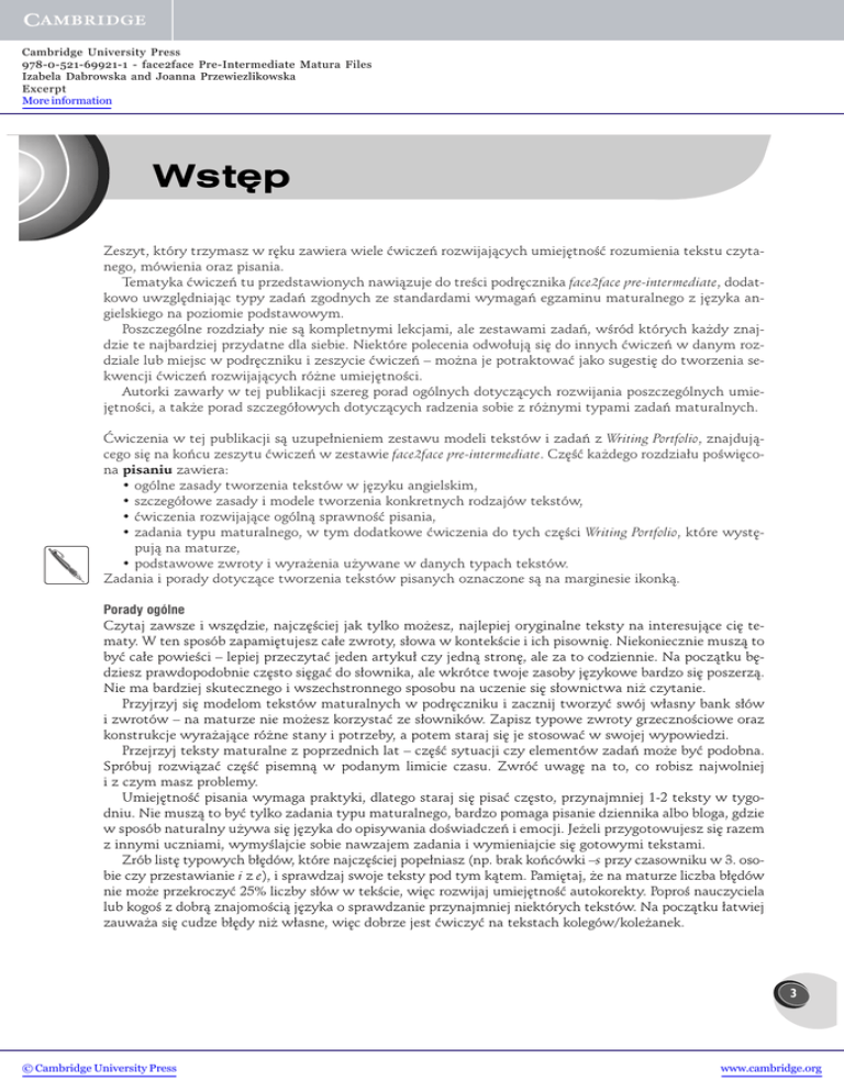 Cambridge University Press 978-0-521-69921-1 - face2face Pre-Intermediate Matura Files Izabela Dabrowska and Joanna Przewiezlikowska Excerpt More information Wst´p Zeszyt, który trzymasz w r´ku zawiera wiele çwiczeƒ rozwijajàcych umiej´tnoÊç rozumienia tekstu czytanego, mówienia oraz pisania. Tematyka çwiczeƒ tu przedstawionych nawiàzuje do treÊci podr´cznika face2face pre-intermediate, dodatkowo uwzgl´dniajàc typy zadaƒ zgodnych ze standardami wymagaƒ egzaminu maturalnego z j´zyka angielskiego na poziomie podstawowym. Poszczególne rozdzia∏y nie sà kompletnymi lekcjami, ale zestawami zadaƒ, wÊród których ka˝dy znajdzie te najbardziej przydatne dla siebie. Niektóre polecenia odwo∏ujà si´ do innych çwiczeƒ w danym rozdziale lub miejsc w podr´czniku i zeszycie çwiczeƒ – mo˝na je potraktowaç jako sugesti´ do tworzenia sekwencji çwiczeƒ rozwijajàcych ró˝ne umiej´tnoÊci. Autorki zawar∏y w tej publikacji szereg porad ogólnych dotyczàcych rozwijania poszczególnych umiej´tnoÊci, a tak˝e porad szczegó∏owych dotyczàcych radzenia sobie z ró˝nymi typami zadaƒ maturalnych. åwiczenia w tej publikacji sà uzupe∏nieniem zestawu modeli tekstów i zadaƒ z Writing Portfolio, znajdujàcego si´ na koƒcu zeszytu çwiczeƒ w zestawie face2face pre-intermediate. Cz´Êç ka˝dego rozdzia∏u poÊwi´cona pisaniu zawiera: • ogólne zasady tworzenia tekstów w j´zyku angielskim, • szczegó∏owe zasady i modele tworzenia konkretnych rodzajów tekstów, • çwiczenia rozwijajàce ogólnà sprawnoÊç pisania, • zadania typu maturalnego, w tym dodatkowe çwiczenia do tych cz´Êci Writing Portfolio, które wyst´pujà na maturze, • podstawowe zwroty i wyra˝enia u˝ywane w danych typach tekstów. Zadania i porady dotyczàce tworzenia tekstów pisanych oznaczone sà na marginesie ikonkà. Porady ogólne Czytaj zawsze i wsz´dzie, najcz´Êciej jak tylko mo˝esz, najlepiej oryginalne teksty na interesujàce ci´ tematy. W ten sposób zapami´tujesz ca∏e zwroty, s∏owa w kontekÊcie i ich pisowni´. Niekoniecznie muszà to byç ca∏e powieÊci – lepiej przeczytaç jeden artyku∏ czy jednà stron´, ale za to codziennie. Na poczàtku b´dziesz prawdopodobnie cz´sto si´gaç do s∏ownika, ale wkrótce twoje zasoby j´zykowe bardzo si´ poszerzà. Nie ma bardziej skutecznego i wszechstronnego sposobu na uczenie si´ s∏ownictwa ni˝ czytanie. Przyjrzyj si´ modelom tekstów maturalnych w podr´czniku i zacznij tworzyç swój w∏asny bank s∏ów i zwrotów – na maturze nie mo˝esz korzystaç ze s∏owników. Zapisz typowe zwroty grzecznoÊciowe oraz konstrukcje wyra˝ajàce ró˝ne stany i potrzeby, a potem staraj si´ je stosowaç w swojej wypowiedzi. Przejrzyj teksty maturalne z poprzednich lat – cz´Êç sytuacji czy elementów zadaƒ mo˝e byç podobna. Spróbuj rozwiàzaç cz´Êç pisemnà w podanym limicie czasu. Zwróç uwag´ na to, co robisz najwolniej i z czym masz problemy. Umiej´tnoÊç pisania wymaga praktyki, dlatego staraj si´ pisaç cz´sto, przynajmniej 1-2 teksty w tygodniu. Nie muszà to byç tylko zadania typu maturalnego, bardzo pomaga pisanie dziennika albo bloga, gdzie w sposób naturalny u˝ywa si´ j´zyka do opisywania doÊwiadczeƒ i emocji. Je˝eli przygotowujesz si´ razem z innymi uczniami, wymyÊlajcie sobie nawzajem zadania i wymieniajcie si´ gotowymi tekstami. Zrób list´ typowych b∏´dów, które najcz´Êciej pope∏niasz (np. brak koƒcówki –s przy czasowniku w 3. osobie czy przestawianie i z e), i sprawdzaj swoje teksty pod tym kàtem. Pami´taj, ˝e na maturze liczba b∏´dów nie mo˝e przekroczyç 25% liczby s∏ów w tekÊcie, wi´c rozwijaj umiej´tnoÊç autokorekty. PoproÊ nauczyciela lub kogoÊ z dobrà znajomoÊcià j´zyka o sprawdzanie przynajmniej niektórych tekstów. Na poczàtku ∏atwiej zauwa˝a si´ cudze b∏´dy ni˝ w∏asne, wi´c dobrze jest çwiczyç na tekstach kolegów/kole˝anek. 3 © Cambridge University Press www.cambridge.org Cambridge University Press 978-0-521-69921-1 - face2face Pre-Intermediate Matura Files Izabela Dabrowska and Joanna Przewiezlikowska Excerpt More information Porady maturalne Wypowiedê pisemna na poziomie podstawowym matury sk∏ada si´ z dwóch zadaƒ, polegajàcych na napisaniu dwóch tekstów u˝ytkowych: • krótszego (og∏oszenie, zaproszenie, notatka lub pocztówka), gdzie trzeba wykonaç cztery zadania podane w poleceniu; nie ma tu okreÊlonego limitu s∏ów. Liczy si´ zwi´z∏e i czytelne przekazanie informacji (4 pkt.) oraz poprawnoÊç j´zykowa (1 pkt.) • d∏u˝szego (list nieformalny, e-mail lub list formalny), o rozmiarze 120-150 s∏ów, gdzie równie˝ nale˝y wykonaç cztery zadania podane w poleceniu (4 pkt.), zastosowaç odpowiednià form´ (2 pkt.), a tak˝e wykazaç si´ znajomoÊcià ró˝norodnych struktur gramatycznych, s∏ów i zwrotów (2pkt.) oraz poprawnoÊcià j´zyka (2 pkt.). Na egzaminie: 1. przeczytaj kilkakrotnie polecenie – upewnij si´, ˝e wiesz, co masz napisaç (to te cztery kluczowe informacje), do kogo (to wp∏ynie na wybór mi´dzy j´zykiem formalnym i nieformalnym) i w jakiej formie (ka˝dy typ tekstu ma pewne charakterystyczne cechy i wymaga okreÊlonych zwrotów) 2. poÊwi´ç chwil´ na zaplanowanie wypowiedzi (podpunkty polecenia stanowià plan ramowy) 3. przy d∏u˝szym zadaniu zastanów si´, ile mniej wi´cej s∏ów poÊwi´cisz na ka˝dy element 4. pami´taj, ˝e przekroczenie limitu s∏ów o wi´cej ni˝ 10% w ka˝dà stron´ spowoduje utrat´ punktu lub dwóch 5. je˝eli czas pozwala, napisz szybko brudnopis obu tekstów, a potem wróç do pierwszego z nich – powrót do tekstu nawet po krótkiej przerwie zwi´ksza szanse na zauwa˝enie b∏´dów i niedociàgni´ç (je˝eli masz ma∏o czasu, spróbuj napisaç na brudno przynajmniej d∏u˝szy tekst); koniecznie upewnij si´, ˝e umieÊci∏eÊ/umieÊci∏aÊ wszystkie informacje z polecenia 6. je˝eli nie 