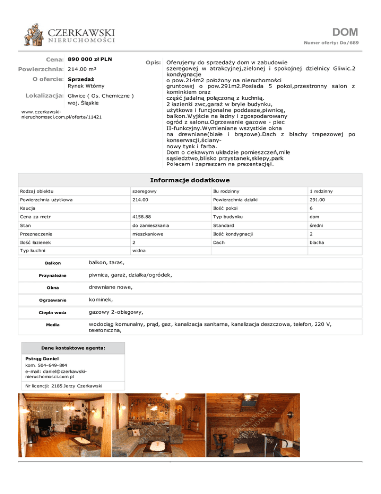 DOM Numer oferty: Do/689 Cena: 890 000 zł PLN Powierzchnia: 214.00 m² O ofercie: Sprzedaż Rynek Wtórny Lokalizacja: Gliwice ( Os. Chemiczne ) woj. Śląskie www.czerkawskinieruchomosci.com.pl/oferta/11421 Opis: Oferujemy do sprzedaży dom w zabudowie szeregowej w atrakcyjnej,zielonej i spokojnej dzielnicy Gliwic.2 kondygnacje o pow.214m2 położony na nieruchomości gruntowej o pow.291m2.Posiada 5 pokoi,przestronny salon z kominkiem oraz część jadalną połączoną z kuchnią. 2 łazienki zwc,garaż w bryle budynku, użytkowe i funcjonalne poddasze,piwnicę, balkon.Wyjście na ładny i zgospodarowany ogród z salonu.Ogrzewanie gazowe - piec II-funkcyjny.Wymieniane wszystkie okna na drewniane(białe i brązowe).Dach z blachy trapezowej po konserwacji,ścianynowy tynk i farba. Dom o ciekawym układzie pomieszczeń,miłe sąsiedztwo,blisko przystanek,sklepy,park Polecam i zapraszam na prezentację!. Informacje dodatkowe Rodzaj obiektu szeregowy Ilu rodzinny 1 rodzinny Powierzchnia użytkowa 214.00 Powierzchnia działki 291.00 Ilość pokoi 6 Kaucja Cena za metr 4158.88 Typ budynku dom Stan do zamieszkania Standard średni Przeznaczenie mieszkaniowe Ilość kondygnacji 2 Ilość łazienek 2 Dach blacha Typ kuchni widna Balkon Przynależne Okna balkon, taras, piwnica, garaż, działka/ogródek, drewniane nowe, Ogrzewanie kominek, Ciepła woda gazowy 2-obiegowy, Media wodociąg komunalny, prąd, gaz, kanalizacja sanitarna, kanalizacja deszczowa, telefon, 220 V, telefoniczna, Dane kontaktowe agenta: Pstrąg Daniel kom. 504-649-804 e-mail: [email protected] Nr licencji: 2185 Jerzy Czerkawski www.czerkawski-nieruchomosci.com.pl