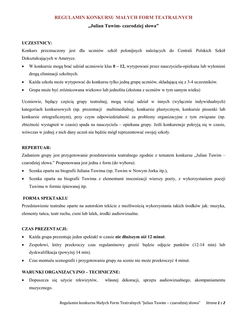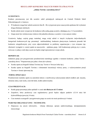 REGULAMIN KONKURSU MAŁYCH FORM TEATRALNYCH „Julian Tuwim- czarodziej słowa” UCZESTNICY: Konkurs przeznaczony jest dla uczniów szkół polonijnych należących do Centrali Polskich Szkół Dokształcających w Ameryce. • W konkursie mogą brać udział uczniowie klas 0 – 12, wytypowani przez nauczyciela-opiekuna lub wyłonieni drogą eliminacji szkolnych. • Każda szkoła może wytypować do konkursu tylko jedną grupę uczniów, składającą się z 3-4 uczestników. • Grupa może być zróżnicowana wiekowo lub jednolita (złożona z uczniów w tym samym wieku) Uczniowie, będący częścią grupy teatralnej, mogą wziąć udział w innych (wyłącznie indywidualnych) kategoriach konkursowych (np. prezentacji multimedialnej, konkursie plastycznym, konkursie piosenki lub konkursie ortograficznym), przy czym odpowiedzialność za problemy organizacyjne z tym związane (np. zbieżność wystąpień w czasie) spada na nauczyciela – opiekuna grupy. Jeśli konkurencje pokryją się w czasie, wówczas w jednej z nich dany uczeń nie będzie mógł reprezentować swojej szkoły. REPERTUAR: Zadaniem grupy jest przygotowanie przedstawienia teatralnego zgodnie z tematem konkursu „Julian Tuwim – czarodziej słowa.” Proponowana jest jedna z form (do wyboru): • Scenka oparta na biografii Juliana Tuwima (np. Tuwim w Nowym Jorku itp.), • Scenka oparta na biografii Tuwima z elementami inscenizacji wierszy poety, z wykorzystaniem poezji Tuwima w formie śpiewanej itp. FORMA SPEKTAKLU Przedstawienie teatralne oparte na autorskim tekście z możliwością wykorzystania takich środków jak: muzyka, elementy tańca, teatr ruchu, cieni lub lalek, środki audiowizualne. CZAS PREZENTACJI: • Każda grupa prezentuje jeden spektakl w czasie nie dłuższym niż 12 minut. • Zespołowi, który przekroczy czas regulaminowy grozić będzie odjęcie punktów (12-14 min) lub dyskwalifikacja (powyżej 14 min). • Czas montażu scenografii i przygotowania grupy na scenie nie może przekroczyć 4 minut. WARUNKI ORGANIZACYJNO – TECHNICZNE: • Dopuszcza się użycie rekwizytów, własnej dekoracji, sprzętu audiowizualnego, akompaniamentu muzycznego. Regulamin konkursu Małych Form Teatralnych ”Julian Tuwim – czarodziej słowa” Strona 1 z 2 • Dopuszcza się użycie środków audiowizualnych przygotowanych specjalnie na potrzeby spektaklu. Niedopuszczalne jest wykorzystywanie fragmentów gotowych teledysków, filmów dokumentalnych, fabularnych lub animowanych. • Za sprawdzenie i jakość dostarczonych nośników informacji (CD, DVD, Flash Drive itp.) odpowiada opiekun grupy lub osoba przez niego wydelegowana. • Organizator konkursu nie odpowiada za ewentualne problemy techniczne danej grupy. • Nieprzestrzeganie terminów oraz regulaminu konkursu wiąże się z dyskwalifikacją grupy. • Organizatorzy zastrzegają sobie prawo do ustalenia kolejności prezentowanych zespołów. • Opiekun każdej grupy zobowiązany jest do nadesłania scenariusza inscenizacji razem z Kartą Zgłoszenia (najlepiej drogą elektroniczną). • Otrzymane scenariusze nie będą zwracane i mogą być wykorzystane jako materiały pomocnicze w pracy dydaktycznej. • Po wysłuchaniu i obejrzeniu wszystkich przedstawień komisja konkursowa wyłoni trzy zespoły, które uzyskały najwyższą liczbę punktów. O kolejności miejsc zdecyduje liczba zdobytych punktów. KRYTERIA OCENY: • dobór repertuaru (zgodność przedstawienia z jego tematem, oryginalność ujęcia tematu, zgodność z faktami historycznymi, dobór repertuaru do wieku i poziomu językowego ucznia) • warsztat aktorski (pamięciowe opanowanie tekstu, interpretacja tekstu, poprawność wymowy i intonacji, emisja głosu, dykcja, ruch sceniczny) • oprawa plastyczna (scenografia, kostiumy, charakteryzacja) i muzyczna • ogólne wrażenie artystyczne UWAGA Uprzejmie prosimy - przy zgłoszeniu szkoły do tej kategorii konkursu - o podanie, jaki mamy zapewnić rodzaj nagłośnienia (mikrofony). SKŁAD KOMISJI: Genowefa Gonkowska – PSD im. K.Pułaskiego, Brooklyn, NY Jolanta Kaczmarski – PSD im. św. Faustyny, Ozone Park, NY Agnieszka Ogonowska – PSD im. św. Maksymiliana Marii Kolbego, Riverhead, LI Elżbieta Serdak – PSD im. św. św. Cyryla i Metodego na Brooklynie, NY Barbara Szenk – przewodnicząca – PSD przy PFK w Clark, NJ Regulamin konkursu Małych Form Teatralnych ”Julian Tuwim – czarodziej słowa” Strona 2 z 2