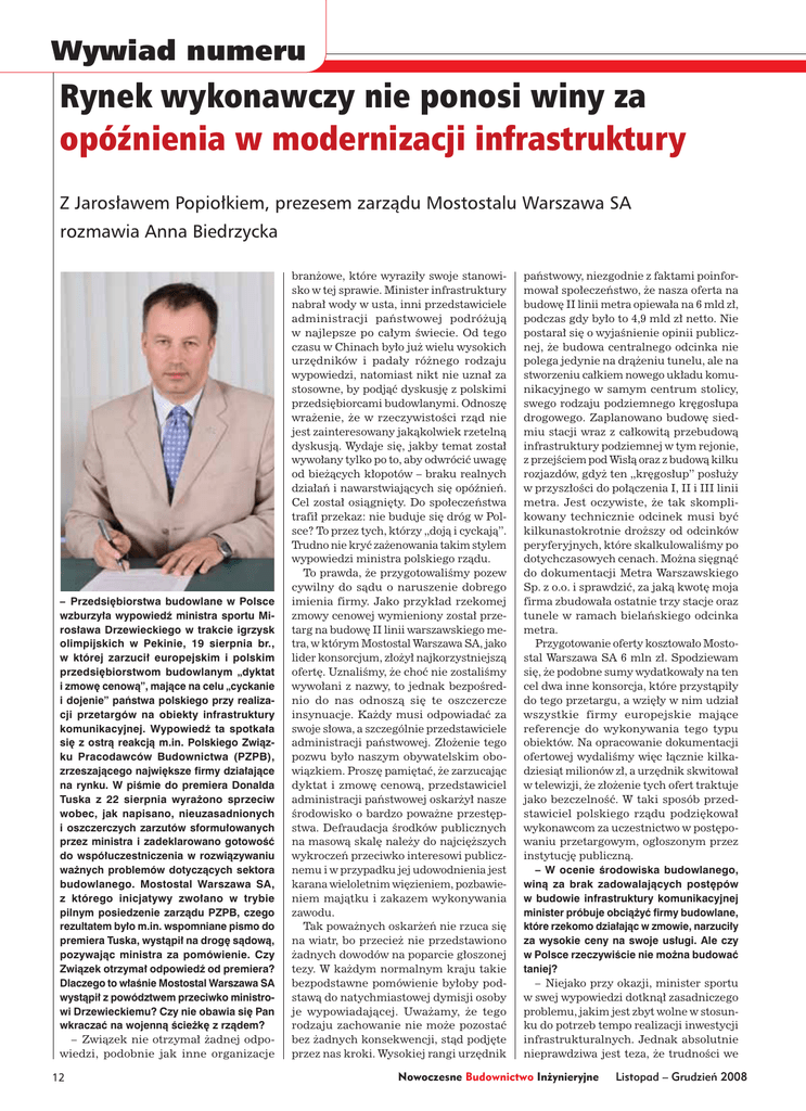 Wywiad numeru Rynek wykonawczy nie ponosi winy za opóźnienia w modernizacji infrastruktury Z Jarosławem Popiołkiem, prezesem zarządu Mostostalu Warszawa SA rozmawia Anna Biedrzycka – Przedsiębiorstwa budowlane w Polsce wzburzyła wypowiedź ministra sportu Mirosława Drzewieckiego w trakcie igrzysk olimpijskich w Pekinie, 19 sierpnia br., w której zarzucił europejskim i polskim przedsiębiorstwom budowlanym „dyktat i zmowę cenową”, mające na celu „cyckanie i dojenie” państwa polskiego przy realizacji przetargów na obiekty infrastruktury komunikacyjnej. Wypowiedź ta spotkała się z ostrą reakcją m.in. Polskiego Związku Pracodawców Budownictwa (PZPB), zrzeszającego największe firmy działające na rynku. W piśmie do premiera Donalda Tuska z 22 sierpnia wyrażono sprzeciw wobec, jak napisano, nieuzasadnionych i oszczerczych zarzutów sformułowanych przez ministra i zadeklarowano gotowość do współuczestniczenia w rozwiązywaniu ważnych problemów dotyczących sektora budowlanego. Mostostal Warszawa SA, z którego inicjatywy zwołano w trybie pilnym posiedzenie zarządu PZPB, czego rezultatem było m.in. wspomniane pismo do premiera Tuska, wystąpił na drogę sądową, pozywając ministra za pomówienie. Czy Związek otrzymał odpowiedź od premiera? Dlaczego to właśnie Mostostal Warszawa SA wystąpił z powództwem przeciwko ministrowi Drzewieckiemu? Czy nie obawia się Pan wkraczać na wojenną ścieżkę z rządem? – Związek nie otrzymał żadnej odpowiedzi, podobnie jak inne organizacje 12 branżowe, które wyraziły swoje stanowisko w tej sprawie. Minister infrastruktury nabrał wody w usta, inni przedstawiciele administracji państwowej podróżują w najlepsze po całym świecie. Od tego czasu w Chinach było już wielu wysokich urzędników i padały różnego rodzaju wypowiedzi, natomiast nikt nie uznał za stosowne, by podjąć dyskusję z polskimi przedsiębiorcami budowlanymi. Odnoszę wrażenie, że w rzeczywistości rząd nie jest zainteresowany jakąkolwiek rzetelną dyskusją. Wydaje się, jakby temat został wywołany tylko po to, aby odwrócić uwagę od bieżących kłopotów – braku realnych działań i nawarstwiających się opóźnień. Cel został osiągnięty. Do społeczeństwa trafił przekaz: nie buduje się dróg w Polsce? To przez tych, którzy „doją i cyckają”. Trudno nie kryć zażenowania takim stylem wypowiedzi ministra polskiego rządu. To prawda, że przygotowaliśmy pozew cywilny do sądu o naruszenie dobrego imienia firmy. Jako przykład rzekomej zmowy cenowej wymieniony został przetarg na budowę II linii warszawskiego metra, w którym Mostostal Warszawa SA, jako lider konsorcjum, złożył najkorzystniejszą ofertę. Uznaliśmy, że choć nie zostaliśmy wywołani z nazwy, to jednak bezpośrednio do nas odnoszą się te oszczercze insynuacje. Każdy musi odpowiadać za swoje słowa, a szczególnie przedstawiciele administracji państwowej. Złożenie tego pozwu było naszym obywatelskim obowiązkiem. Proszę pamiętać, że zarzucając dyktat i zmowę cenową, przedstawiciel administracji państwowej oskarżył nasze środowisko o bardzo poważne przestępstwa. Defraudacja środków publicznych na masową skalę należy do najcięższych wykroczeń przeciwko interesowi publicznemu i w przypadku jej udowodnienia jest karana wieloletnim więzieniem, pozbawieniem majątku i zakazem wykonywania zawodu. Tak poważnych oskarżeń nie rzuca się na wiatr, bo przecież nie przedstawiono żadnych dowodów na poparcie głoszonej tezy. W każdym normalnym kraju takie bezpodstawne pomówienie byłoby podstawą do natychmiastowej dymisji osoby je wypowiadającej. Uważamy, że tego rodzaju zachowanie nie może pozostać bez żadnych konsekwencji, stąd podjęte przez nas kroki. Wysokiej rangi urzędnik państwowy, niezgodnie z faktami poinformował społeczeństwo, że nasza oferta na budowę II linii metra opiewała na 6 mld zł, podczas gdy było to 4,9 mld zł netto. Nie postarał się o wyjaśnienie opinii publicznej, że budowa centralnego odcinka nie polega jedynie na drążeniu tunelu, ale na stworzeniu całkiem nowego układu komunikacyjnego w samym centrum stolicy, swego rodzaju podziemnego kręgosłupa drogowego. Zaplanowano budowę siedmiu stacji wraz z całkowitą przebudową infrastruktury podziemnej w tym rejonie, z przejściem pod Wisłą oraz z budową kilku rozjazdów, gdyż ten „kręgosłup” posłuży w przyszłości do połączenia I, II i III linii metra. Jest oczywiste, że tak skomplikowany technicznie odcinek musi być kilkunastokrotnie droższy od odcinków peryferyjnych, które skalkulowaliśmy po dotychczasowych cenach. Można sięgnąć do dokumentacji Metra Warszawskiego Sp. z o.o. i sprawdzić, za jaką kwotę moja firma zbudowała ostatnie trzy stacje oraz tunele w ramach bielańskiego odcinka metra. Przygotowanie oferty kosztowało Mostostal Warszawa SA 6 mln zł. Spodziewam się, że podobne sumy wydatkowały na ten cel dwa inne konsorcja, które przystąpiły do tego przetargu, a wzięły w nim udział wszystkie firmy europejskie mające referencje do wykonywania tego typu obiektów. Na opracowanie dokumentacji ofertowej wydaliśmy więc łącznie kilkadziesiąt milionów zł, a urzędnik skwitował w telewizji, że złożenie tych ofert traktuje jako bezczelność. W taki sposób przedstawiciel polskiego rządu podziękował wykonawcom za uczestnictwo w postępowaniu przetargowym, ogłoszonym przez instytucję publiczną. – W ocenie środowiska budowlanego, winą za brak zadowalających postępów w budowie infrastruktury komunikacyjnej minister próbuje obciążyć firmy budowlane, które rzekomo działając w zmowie, narzuciły za wysokie ceny na swoje usługi. Ale czy w Polsce rzeczywiście nie można budować taniej? – Niejako przy okazji, minister sportu w swej wypowiedzi dotknął zasadniczego problemu, jakim jest zbyt wolne w stosunku do potrzeb tempo realizacji inwe